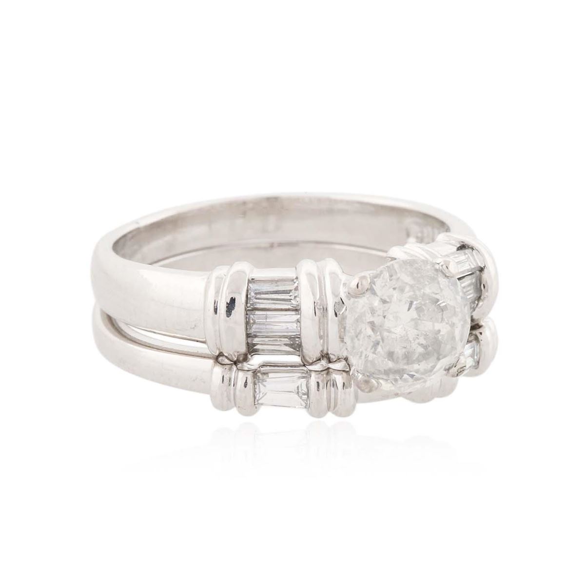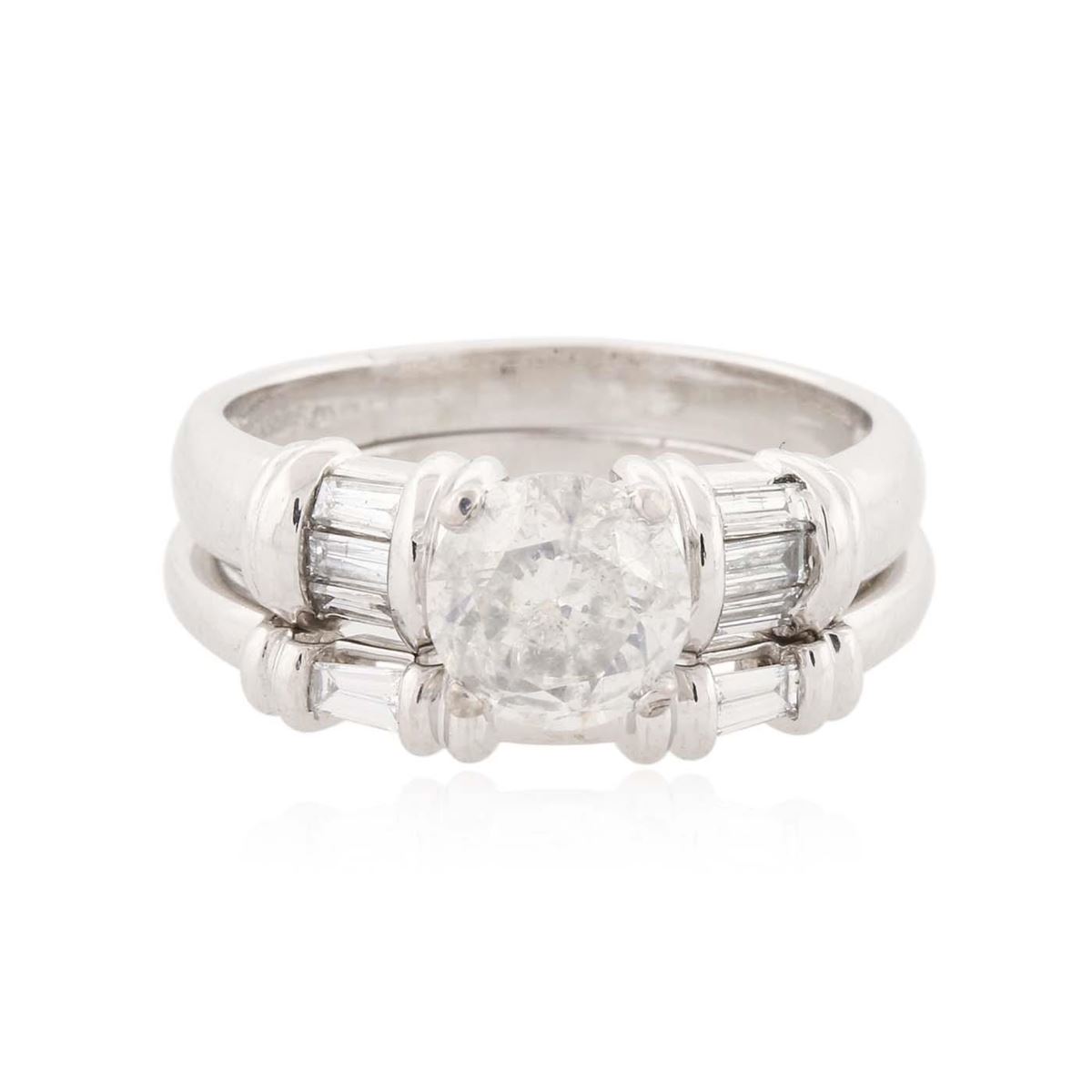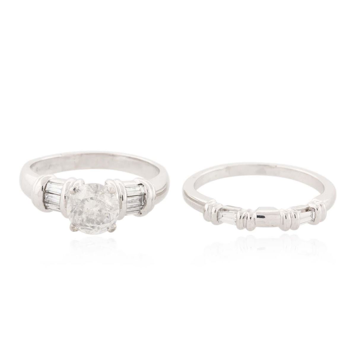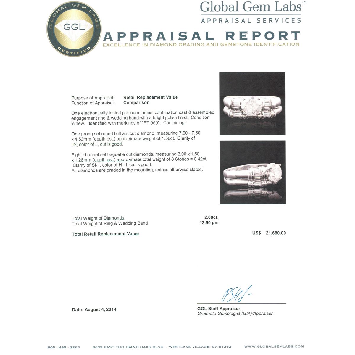 One electronically tested platinum ladies combination cast & assembled engagement ring & wedding band with a bright polish finish. Condition is new. Identified with markings of "PT 950". Containing: One prong set round brilliant cut diamond, measuring 7.60 - 7.50 x 4.53mm (depth est.) approximate weight of 1.58ct. Clarity: I-2. Color: J, Cut is Good. Eight channel set baguette cut diamonds, measuring 3.00 x 1.50 x 1.28mm (depth est.) approximate. Total Weight of 8 Stones = 0.42ct. Clarity: SI-1. Color: H - I, Cut is Good. All diamonds are graded in the mounting, unless otherwise stated. Total Weight of Diamonds 2.00ct. Total Weight of Ring & Wedding Band 13.60 grams. GGL Appraised at $21,680.00.
