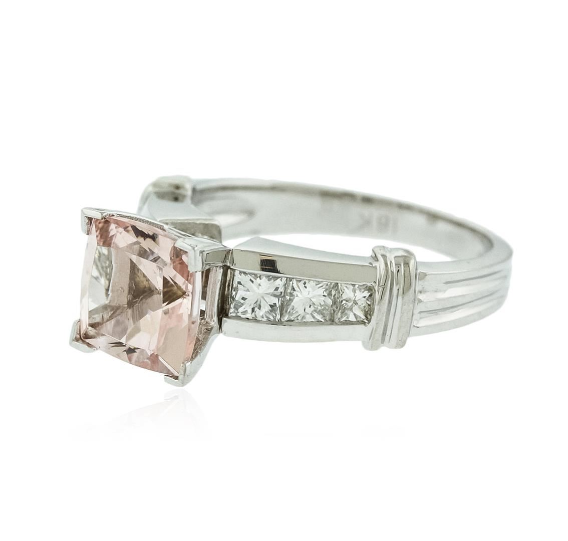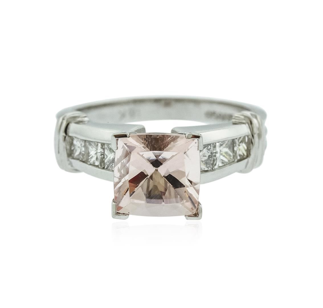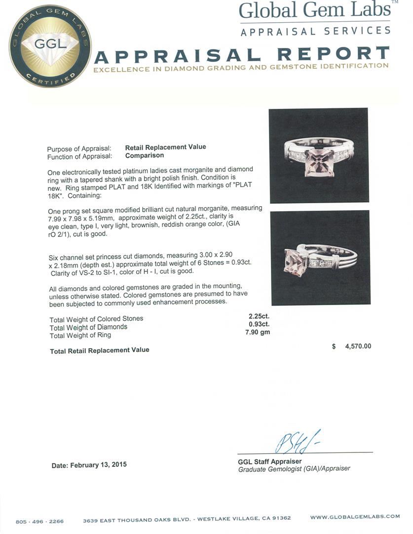 One electronically tested platinum ladies cast morganite and diamond ring with a tapered shank with a bright polish finish. Ring stamped PLAT and 18K Identified with markings of "PLAT 18K". Condition is new. Containing: One prong set square modified brilliant cut natural morganite, measuring 7.99 x 7.98 x 5.19mm, approximate weight of 2.25ct., clarity is eye clean, type I, very light, brownish, reddish orange color, (GIA rO 2/1), cut is good. Six channel set princess cut diamonds, measuring 3.00 x 2.90 x 2.18mm (depth est.) approximate total weight of 6 Stones = 0.93ct. Clarity: VS-2 to SI-1. Color: H - I, Cut is Good. All diamonds and colored gemstones are graded in the mounting, unless otherwise stated. Colored gemstones are presumed to have been subjected to commonly used enhancement processes. Total Weight of Colored Stones 2.25ct. Total Weight of Diamonds 0.93ct. Total Weight of Ring 7.90 grams. GGL Appraised at $4,570.00.