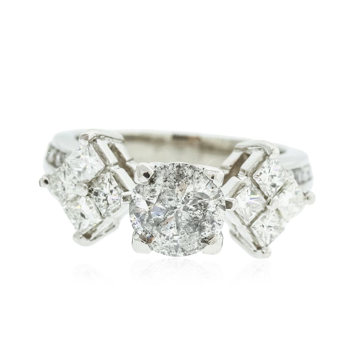 One electronically tested platinum ladies cast & assembled diamond unity ring with a bright polish finish. Condition is new, good workmanship. The featured diamond is supported by elaborate diamond set shoulders, completed by a three and one-half millimeter wide band. Identified with markings of "PLAT". Containing: One prong set round brilliant cut diamond, measuring 7.05 - 7.00 x 4.50mm (depth est.) approximate weight of 1.45ct. Graded in the setting. Clarity: I-2. Color: J Depth 64.0%. Table 55.5%. Eight prong set princess cut diamonds, measuring 2.50 x 2.40 x 1.80mm (depth est.) approximate. Total Weight of 8 Stones = 0.80ct. Graded in the setting. Clarity: SI-1 to I-1. Color: H - J Twenty channel set round brilliant cut diamonds, measuring 1.60 - 1.50 x 0.93mm (depth est.) approximate. Total Weight of 20 Stones = 0.37ct. Graded in the setting. Clarity: SI-1 to I-1. Color: I - K. Total Weight of Diamonds 2.62ct. Total Weight of Ring 11.14 grams. AIG Appraised at $18,240.00.