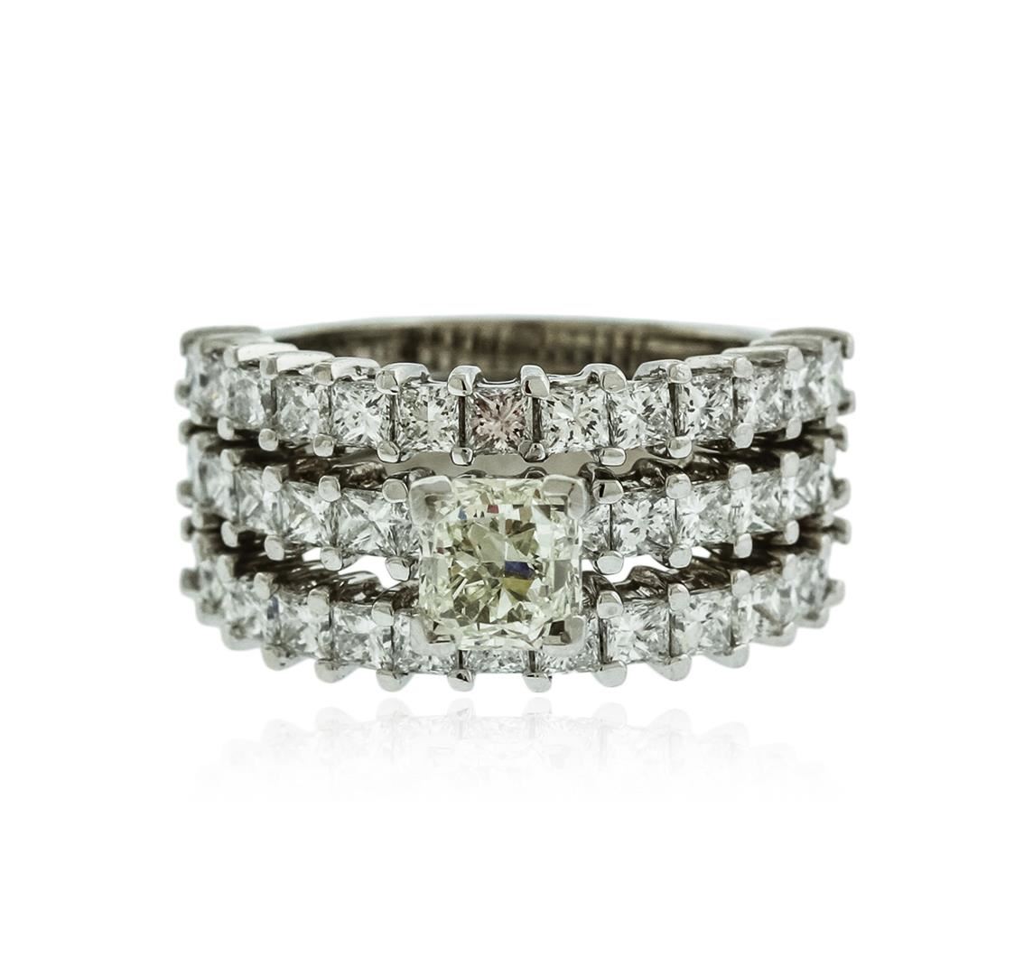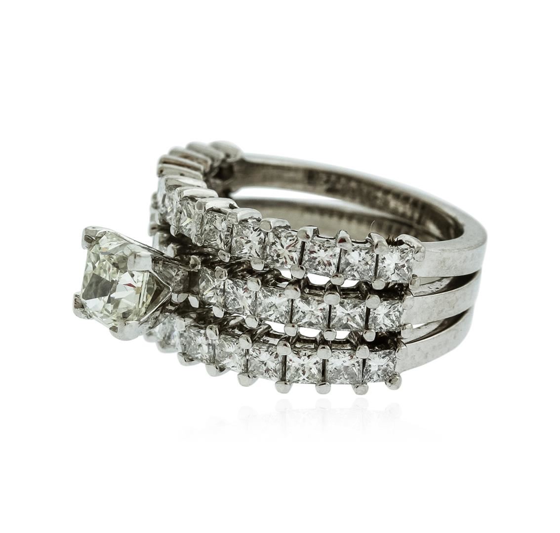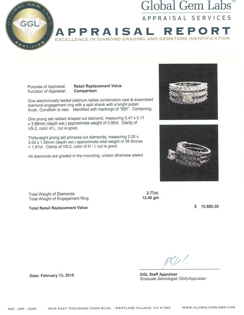 One electronically tested platinum ladies combination cast & assembled diamond engagement ring with a split shank with a bright polish finish. Identified with markings of "950". Condition is new. Containing: One prong set radiant shaped cut diamond, measuring 5.47 x 5.17 x 3.88mm (depth est.) approximate weight of 0.90ct. Clarity: VS-2. Color: L, Cut is Good. Thirty-Eight prong set princess cut diamonds, measuring 2.00 x 2.00 x 1.50mm (depth est.) approximate total weight of 38 Stones = 1.87ct. Clarity: VS-2. Color: H - I, Cut is Good. All diamonds are graded in the mounting, unless otherwise stated. Total Weight of Diamonds 2.77ct. Total Weight of Engagement Ring 12.40 grams. GGL Appraised at $10,880.00.