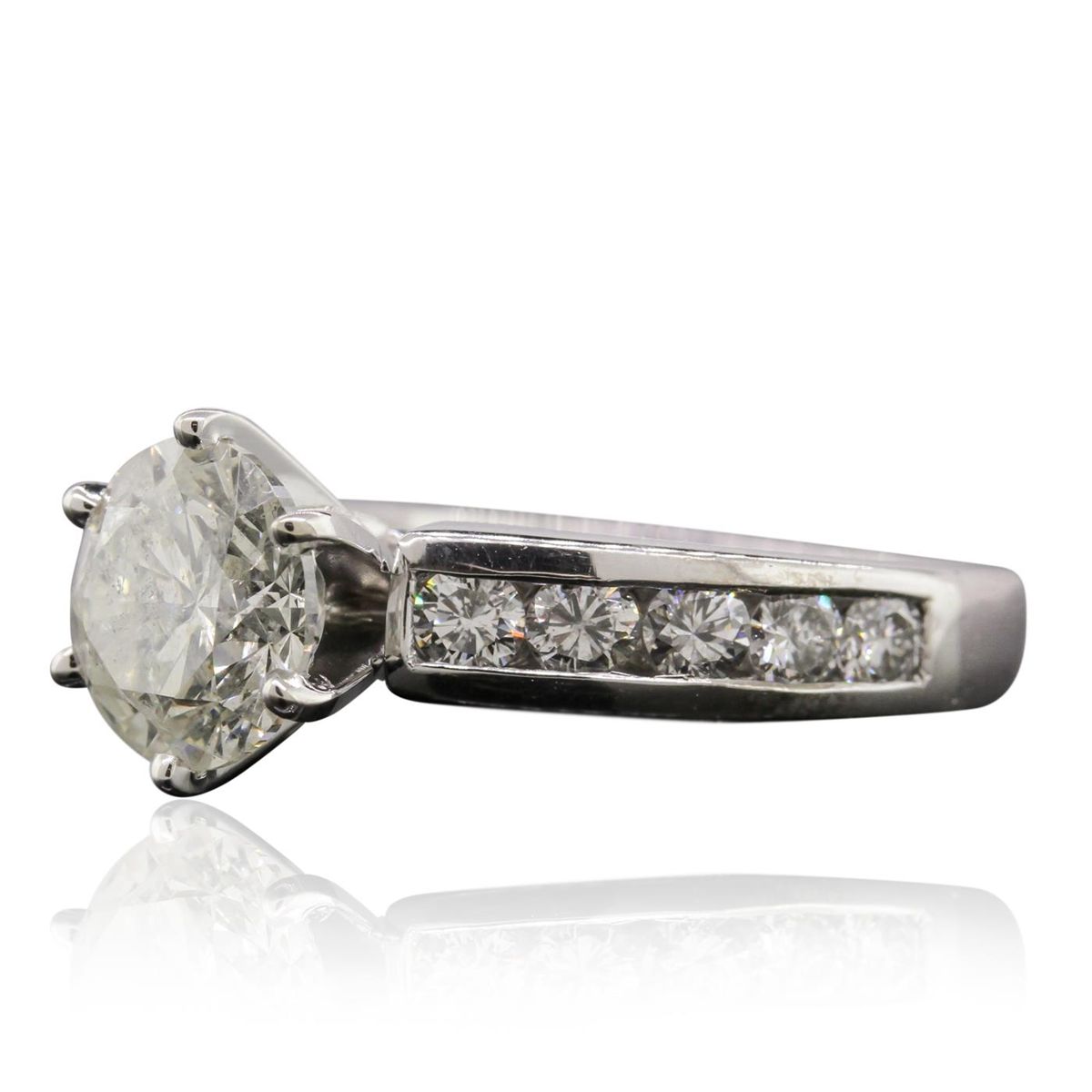 One electronically tested platinum Ladies combination cast & assembled engagement ring with a bright polish finish. Condition is new. Identified with markings of "PT 950". Containing: One prong set round brilliant cut diamond, measuring 8.10 - 8.10 x 5.22mm (depth est.) approximate weight of 2.09ct. Clarity: I-2. Color: H, Cut is Good. Ten channel set round brilliant cut diamonds, measuring 2.80 - 2.80 x 1.68mm (depth est.) approximate. Total Weight of 10 Stones = 0.80ct. Clarity: SI-1 to SI-2. Color: H - I, Cut is Good. Total Weight of Diamonds 2.89ct. Total Weight of Engagement Ring 9.10 grams. GGL Appraised at $30,550.00.