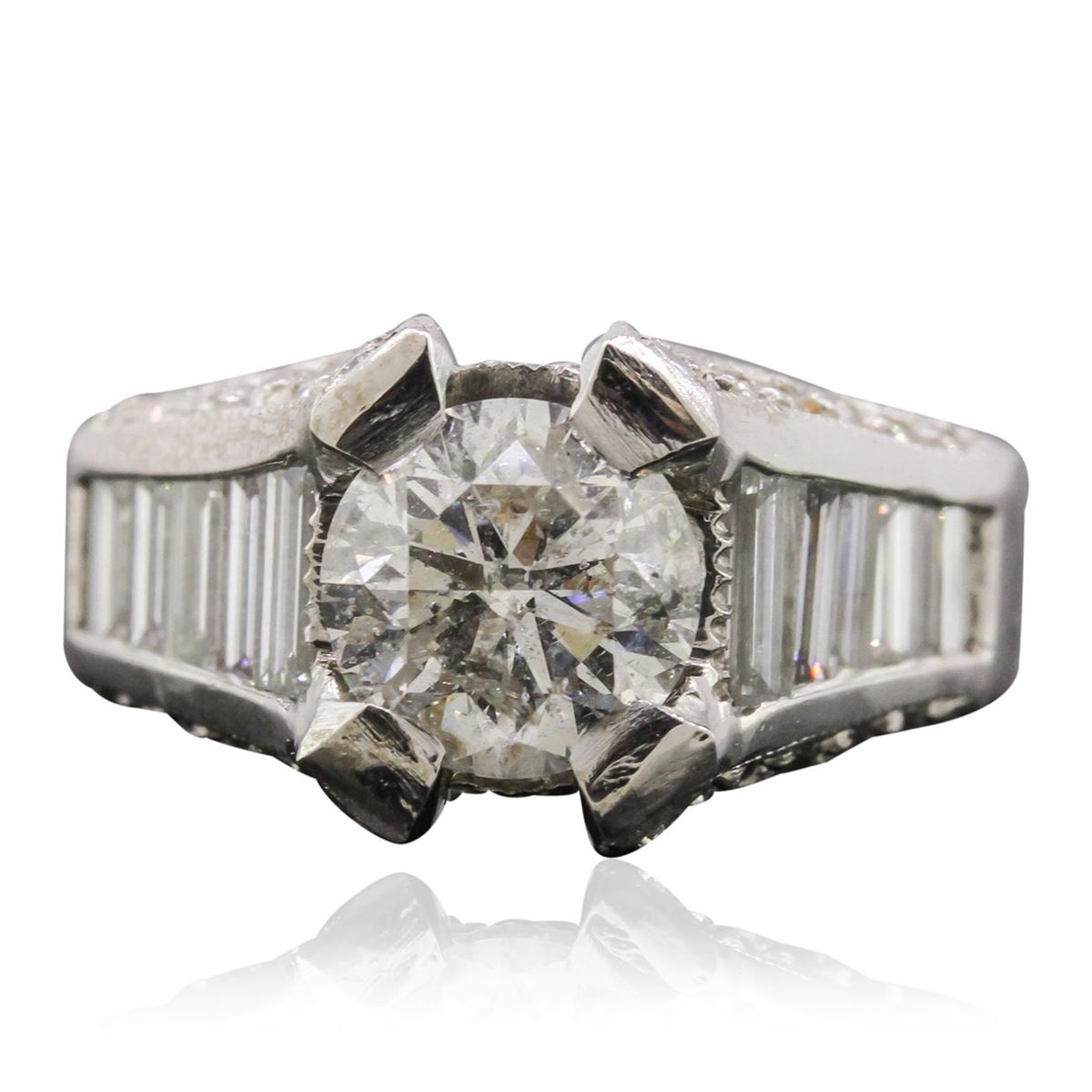 One electronically tested platinum Ladies combination cast & assembled engagement ring with a bright polish finish. Condition is new. Identified with markings of "PLAT". Containing: One prong set round brilliant cut diamond, measuring 7.80 - 7.80 x 4.90mm (depth est.) approximate weight of 1.82ct. Clarity: I-2. Color: I, Cut is Good. Thirty-Six bead set round brilliant cut diamonds, measuring 1.50 - 1.30 x 0.84mm (depth est.) approximate. Total Weight of 36 Stones = 0.36ct. Clarity: SI-2 to I-1. Color: J - K, Cut is Good. Ten channel set baguette cut diamonds, measuring from 3.00 x 1.50 x 1.28mm (depth est.) to 4.50 x 1.70 x 1.45mm (depth est.) approximate. Total Weight of 10 Stones = 0.75ct. Clarity: VS-2. Color: I - J, Cut is Good. Total Weight of Diamonds 2.93ct. Total Weight of Engagement Ring 16.00 grams. GGL Appraised at $29,800.00.