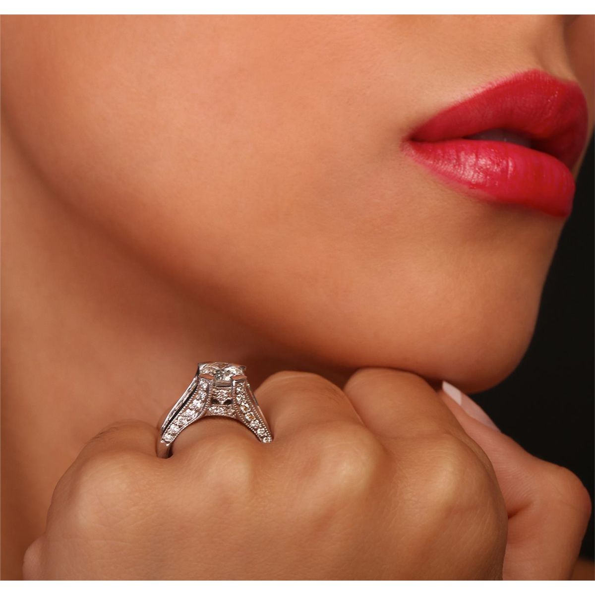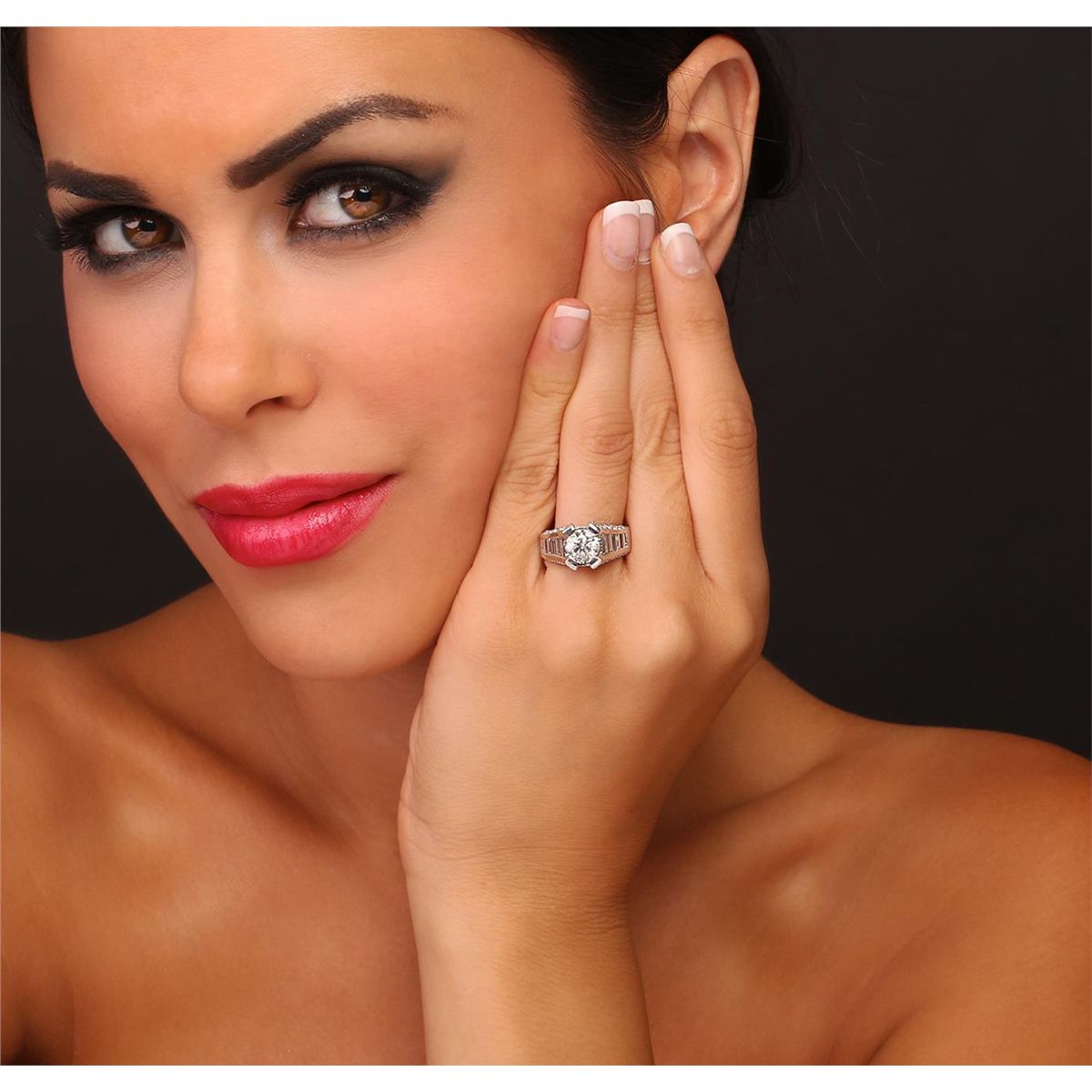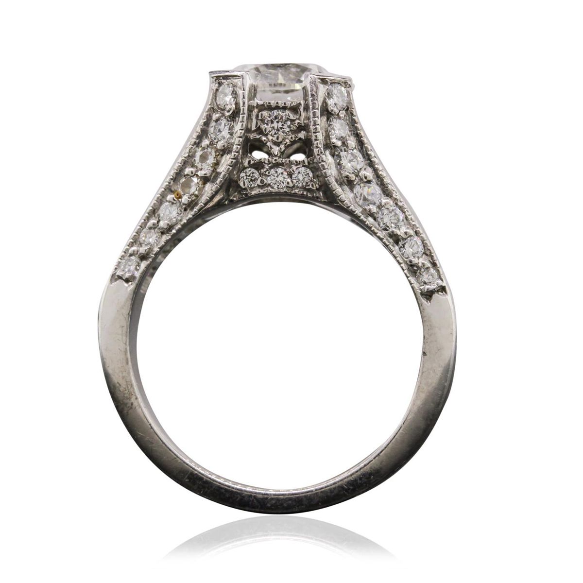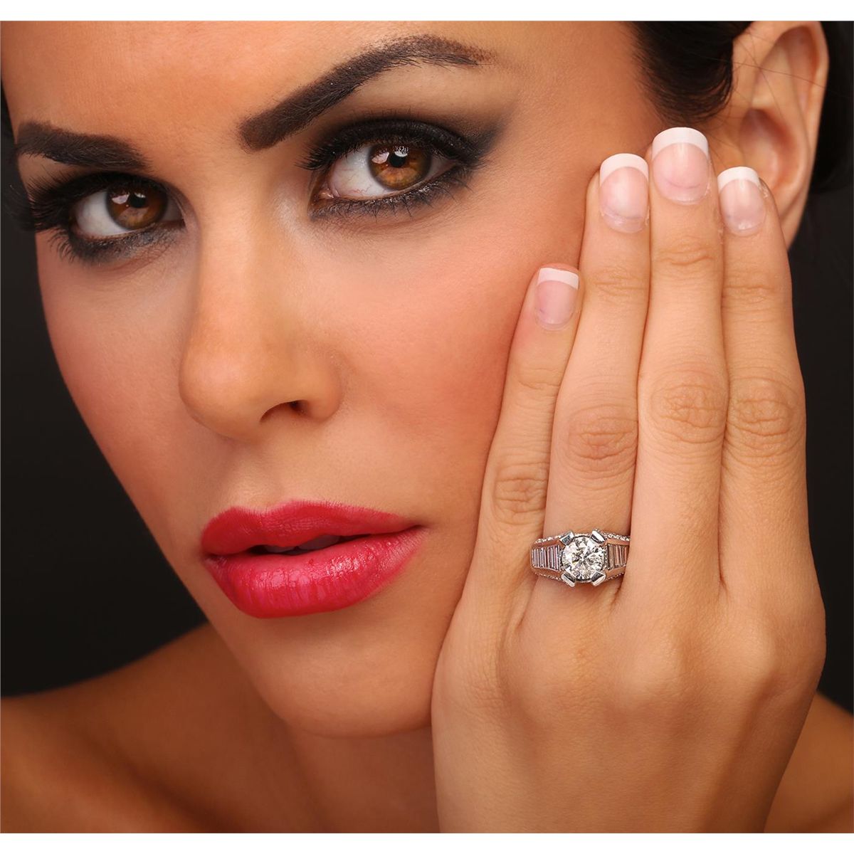 One electronically tested platinum Ladies combination cast & assembled engagement ring with a bright polish finish. Condition is new. Identified with markings of "PLAT". Containing: One prong set round brilliant cut diamond, measuring 7.80 - 7.80 x 4.90mm (depth est.) approximate weight of 1.82ct. Clarity: I-2. Color: I, Cut is Good. Thirty-Six bead set round brilliant cut diamonds, measuring 1.50 - 1.30 x 0.84mm (depth est.) approximate. Total Weight of 36 Stones = 0.36ct. Clarity: SI-2 to I-1. Color: J - K, Cut is Good. Ten channel set baguette cut diamonds, measuring from 3.00 x 1.50 x 1.28mm (depth est.) to 4.50 x 1.70 x 1.45mm (depth est.) approximate. Total Weight of 10 Stones = 0.75ct. Clarity: VS-2. Color: I - J, Cut is Good. Total Weight of Diamonds 2.93ct. Total Weight of Engagement Ring 16.00 grams. GGL Appraised at $29,800.00.