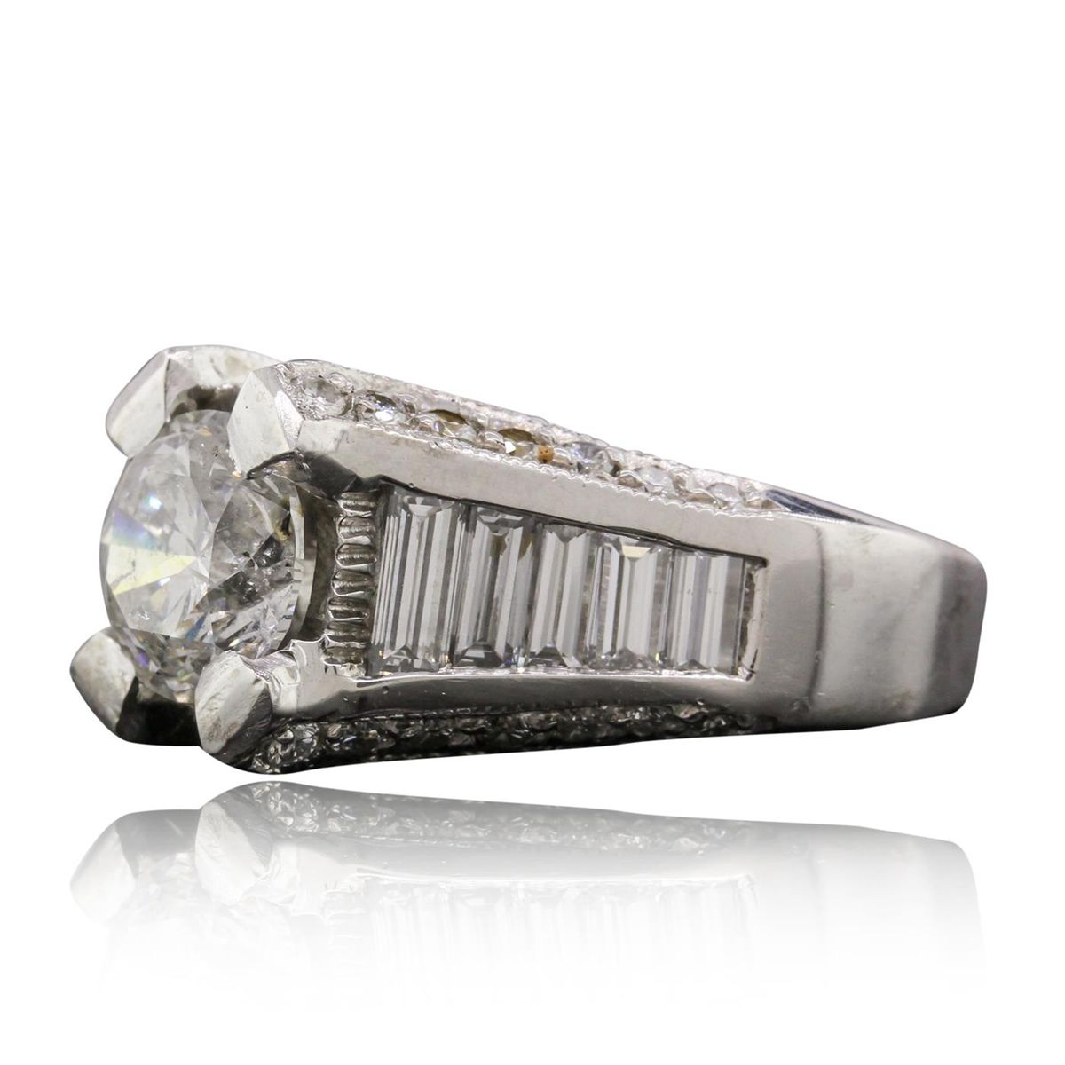 One electronically tested platinum Ladies combination cast & assembled engagement ring with a bright polish finish. Condition is new. Identified with markings of "PLAT". Containing: One prong set round brilliant cut diamond, measuring 7.80 - 7.80 x 4.90mm (depth est.) approximate weight of 1.82ct. Clarity: I-2. Color: I, Cut is Good. Thirty-Six bead set round brilliant cut diamonds, measuring 1.50 - 1.30 x 0.84mm (depth est.) approximate. Total Weight of 36 Stones = 0.36ct. Clarity: SI-2 to I-1. Color: J - K, Cut is Good. Ten channel set baguette cut diamonds, measuring from 3.00 x 1.50 x 1.28mm (depth est.) to 4.50 x 1.70 x 1.45mm (depth est.) approximate. Total Weight of 10 Stones = 0.75ct. Clarity: VS-2. Color: I - J, Cut is Good. Total Weight of Diamonds 2.93ct. Total Weight of Engagement Ring 16.00 grams. GGL Appraised at $29,800.00.