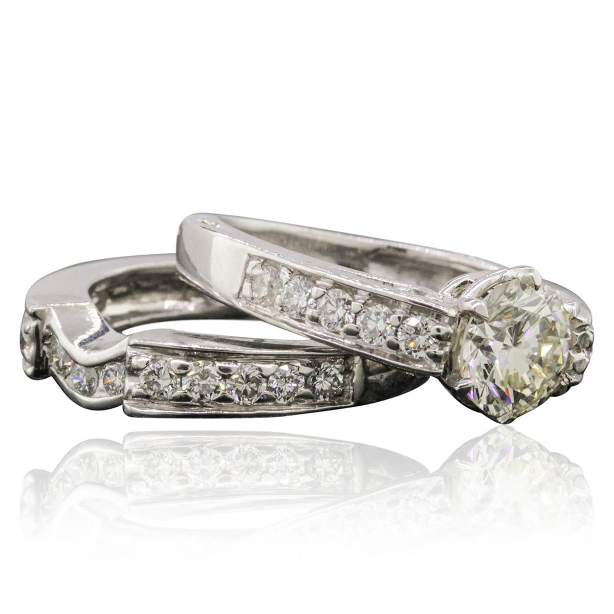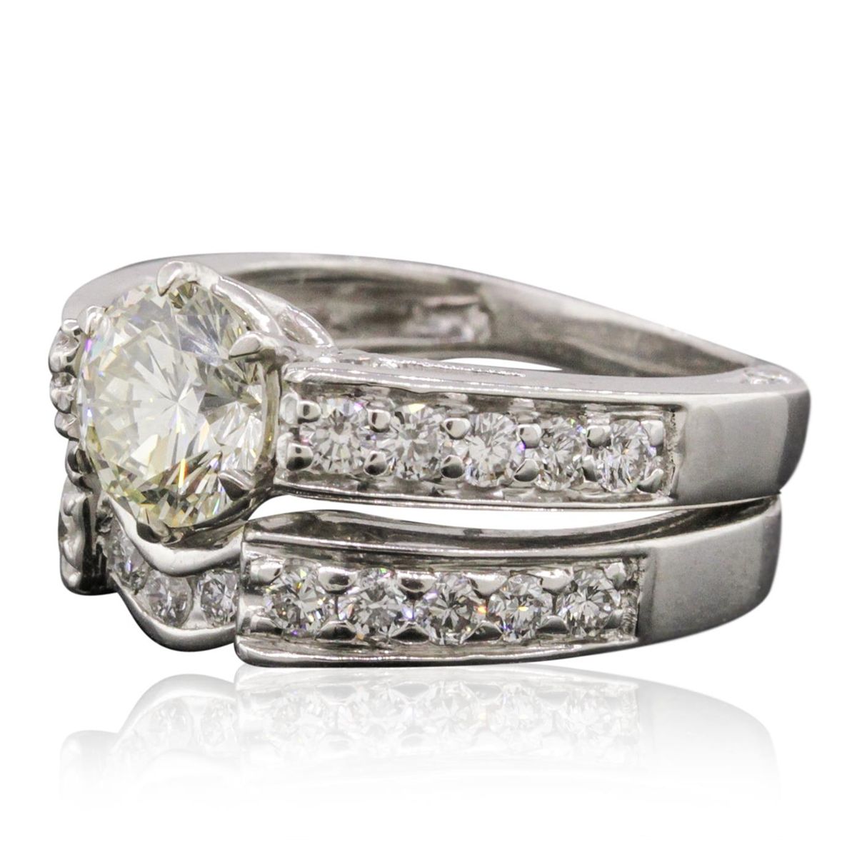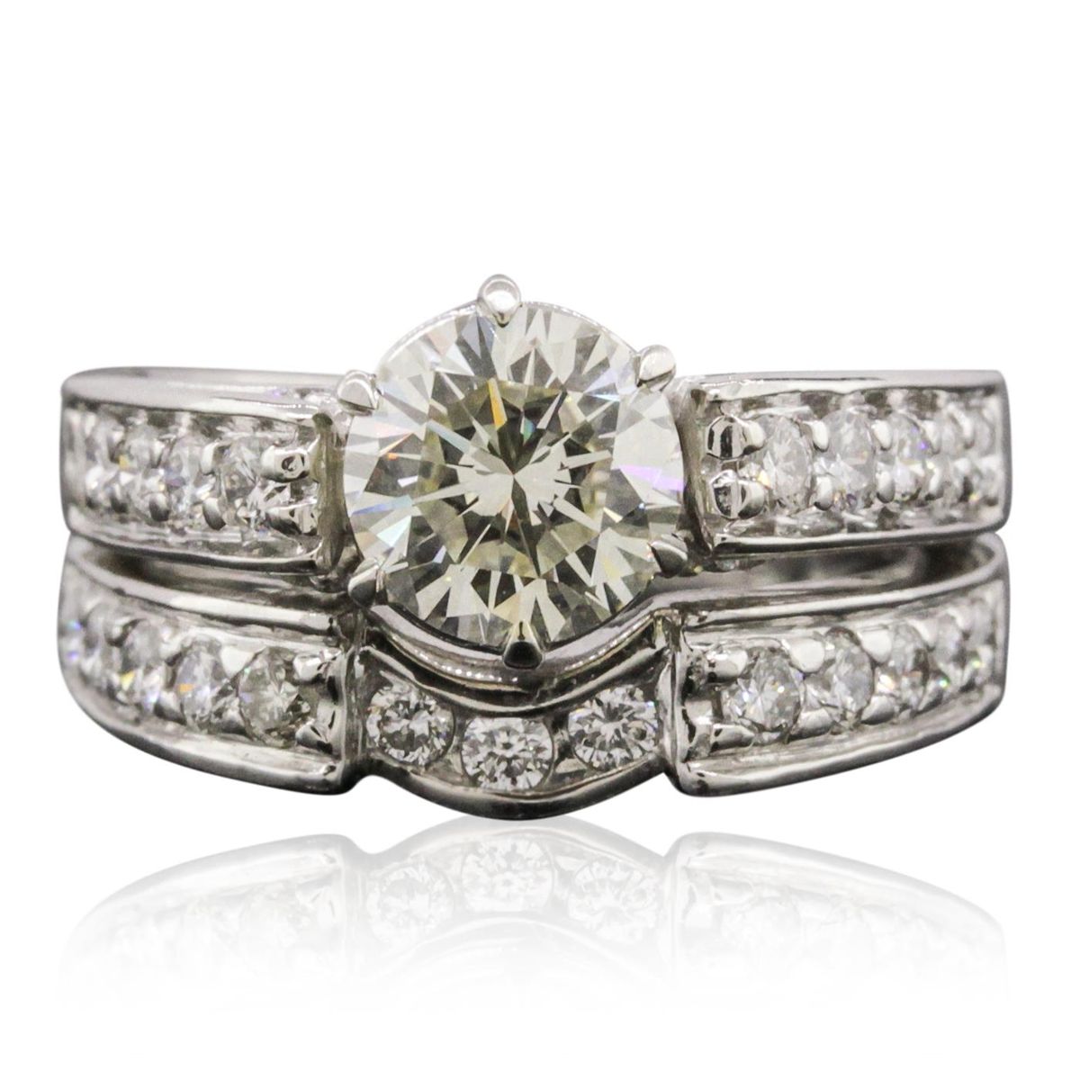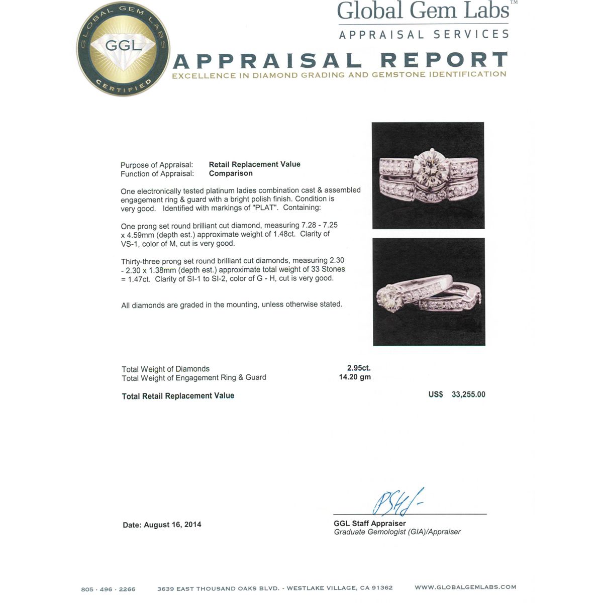 One electronically tested platinum ladies combination cast & assembled engagement ring & guard with a bright polish finish. Condition is very good. Identified with markings of "PLAT". Containing: One prong set round brilliant cut diamond, measuring 7.28 - 7.25 x 4.59mm (depth est.) approximate weight of 1.48ct. Clarity: VS-1. Color: M, Cut is Very Good. Thirty-Three prong set round brilliant cut diamonds, measuring 2.30 - 2.30 x 1.38mm (depth est.) approximate. Total Weight of 33 Stones = 1.47ct. Clarity: SI-1 to SI-2. Color: G - H, Cut is Very Good. All diamonds are graded in the mounting, unless otherwise stated. Total Weight of Diamonds 2.95ct. Total Weight of Engagement Ring & Guard 14.20 grams. GGL Appraised at $33,255.00.