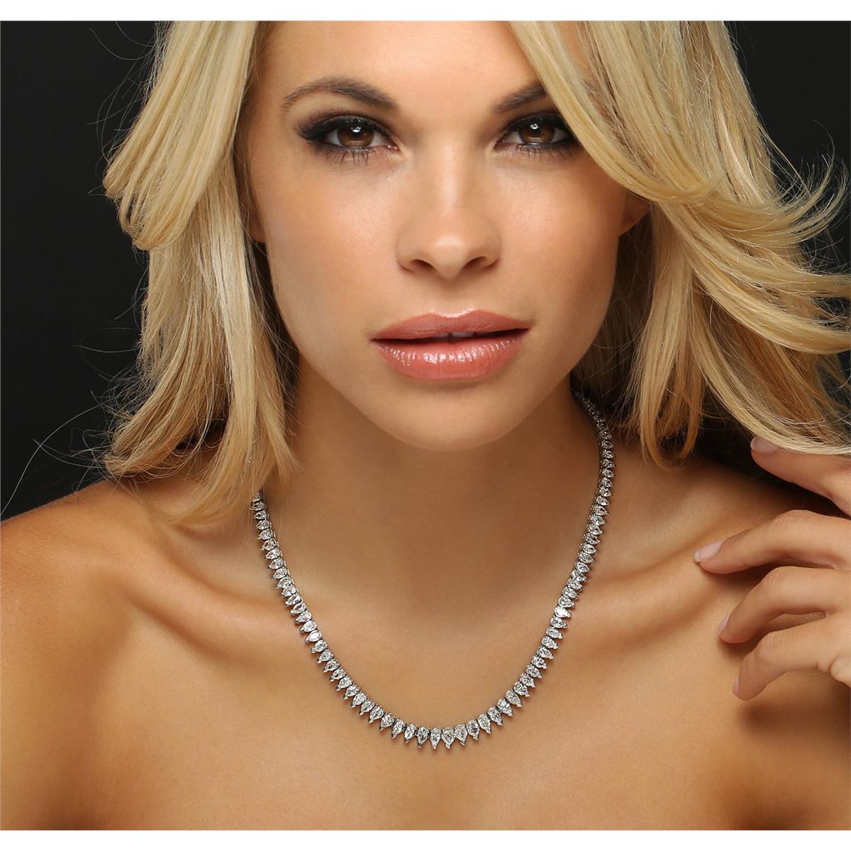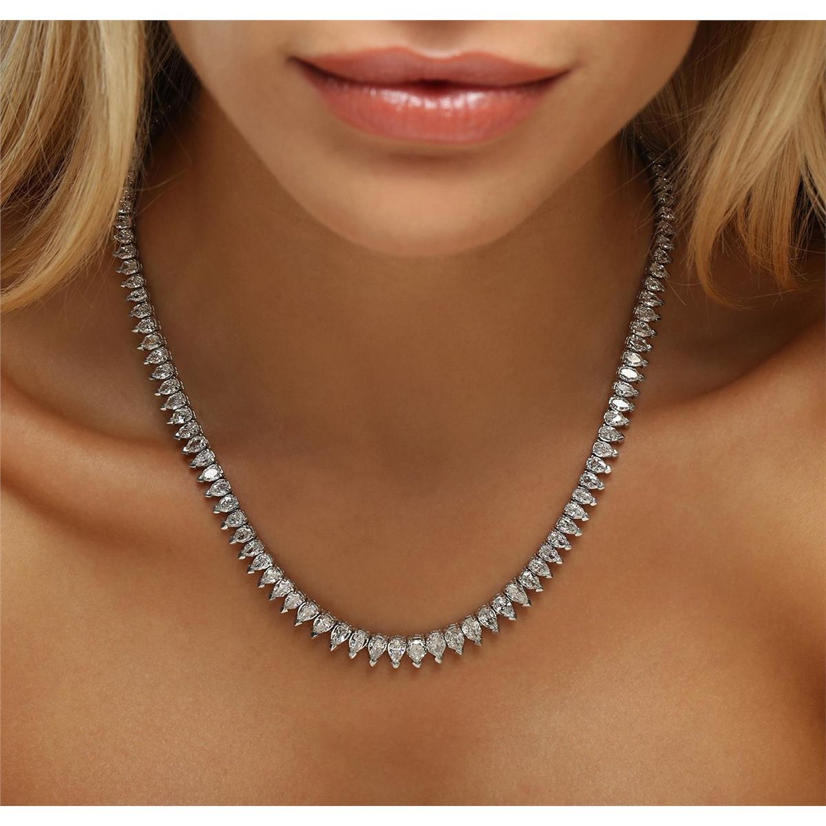 One electronically tested platinum ladies cast & assembled diamond tennis necklace with a bright polish finish. Seventeen and one-quarter inch length necklace composed of a flexible graduating ribbon of diamonds, terminating in a concealed clasp with safety. Identified with markings of "950". Condition is new, good workmanship. Tennis bracelets & necklaces got their unusual name from an incident involving the U.S. professional tennis player Chris Evert during a tennis match in the 1980's. Evert had been wearing an expensive diamond bracelet, an inline string of individually-set diamonds. Previously these bracelets were known as eternity bracelets. When the clasp snapped during play, she asked the officials to stop the tennis match until the bracelet could be found. Since that day, bracelets and necklaces featuring an inline string of diamonds have been called tennis bracelets and tennis necklaces. Containing: One Hundred Nineteen prong set Modified Pear Shape cut diamonds (depth est.) approximate total weight of 119 Stones = 20.76ct. The color and clarity grades reflect the entire range of color and clarity for this group. Graded in the setting. Clarity: VS-2 to I-1. Color: G - K. Total Weight of Diamonds 20.76ct. Total Weight of Tennis Necklace 64.93 grams. AIG Appraised at $97,485.00.