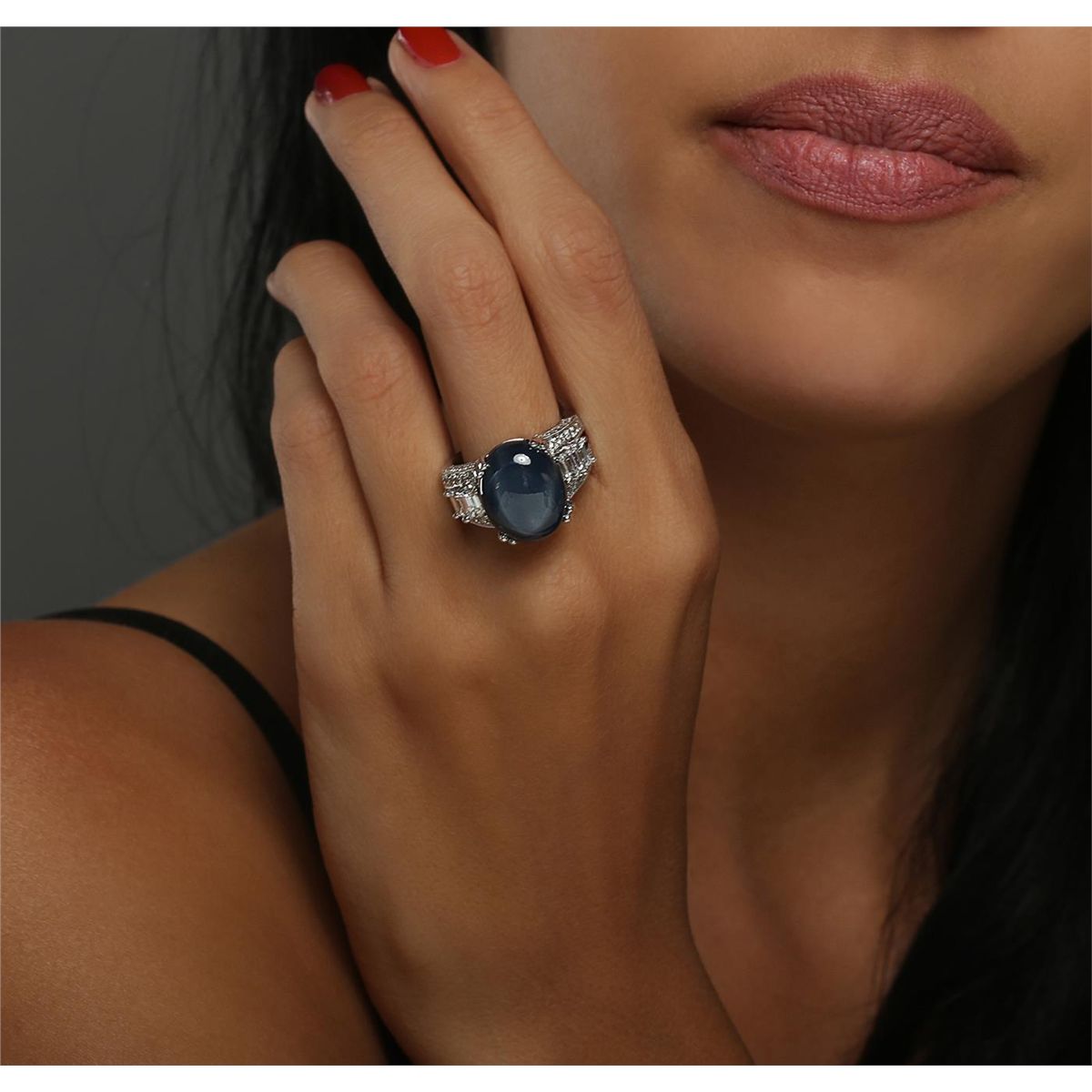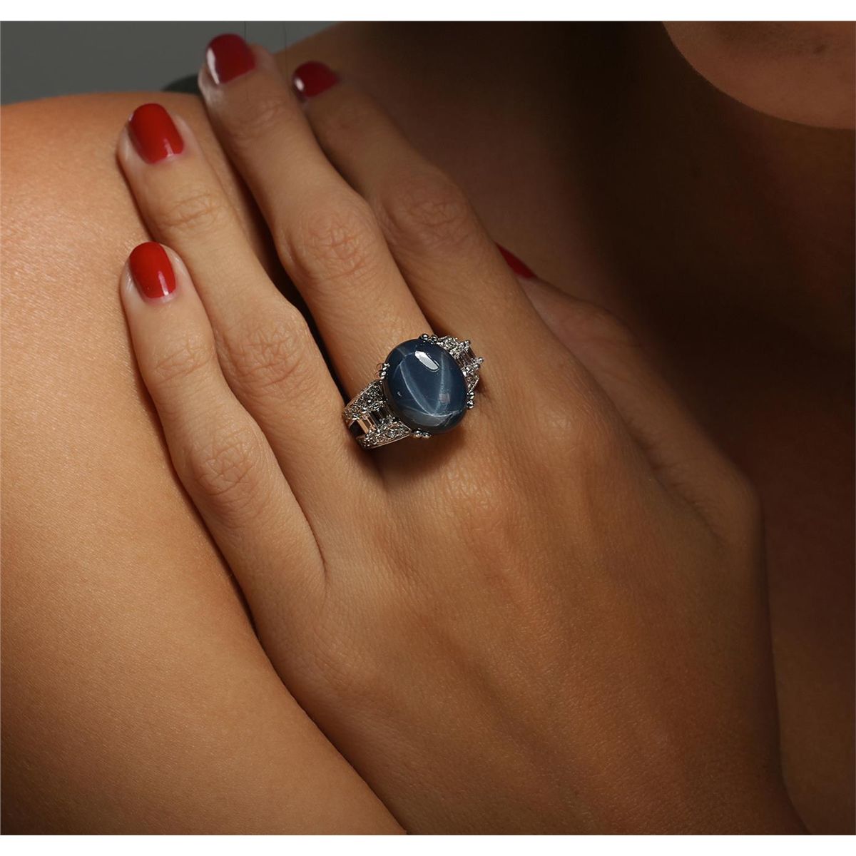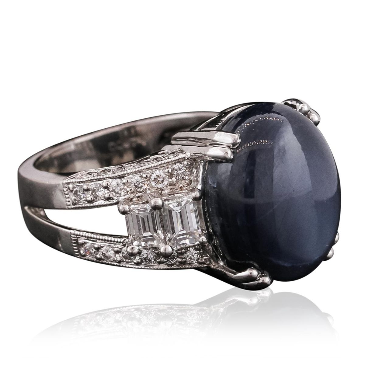 One electronically tested platinum ladies combination cast & assembled ring with a bright polish finish. Identified with markings of "PT 900". Condition is new. Containing: One prong set oval cabochon cut natural blue star sapphire, measuring 25.50 x 12.50 x 7.00mm, approximate weight of 24.10ct., clarity is heavily included, medium, moderately strong, blue color, (GIA B 5/4), cut is good. Four prong set emerald cut diamonds, measuring 4.00 x 3.00 x 2.01mm (depth est.) approximate total weight of 4 Stones = 0.89ct. Clarity: VS-2. Color: I, Cut is Good. Forty-Eight prong set round brilliant cut diamonds, measuring 1.50 - 1.50 x 0.90mm (depth est.) approximate total weight of 48 Stones = 0.59ct. Clarity: SI-1. Color: H - I, Cut is Good. Colored gemstones are presumed to have been subjected to commonly used enhancement processes. All diamonds and colored gemstones are graded in the mounting, unless otherwise stated. Total Weight of Colored Stones 24.10ct. Total Weight of Diamonds 1.48ct. Total Weight of Ring 18.00 grams. GGL Appraised at $23,605.00.