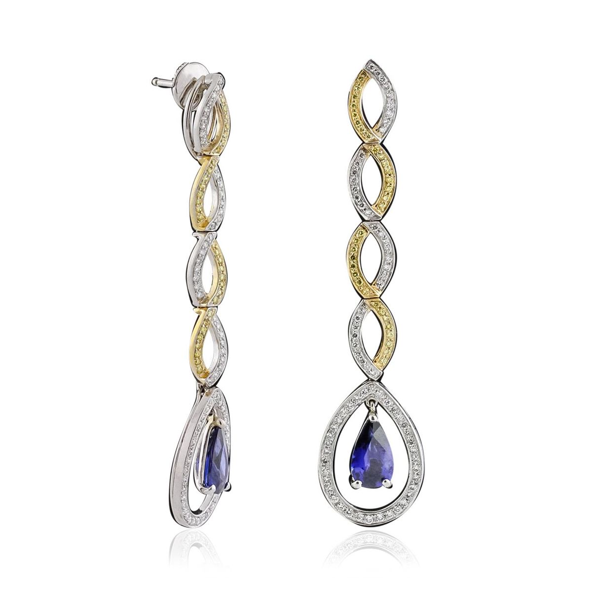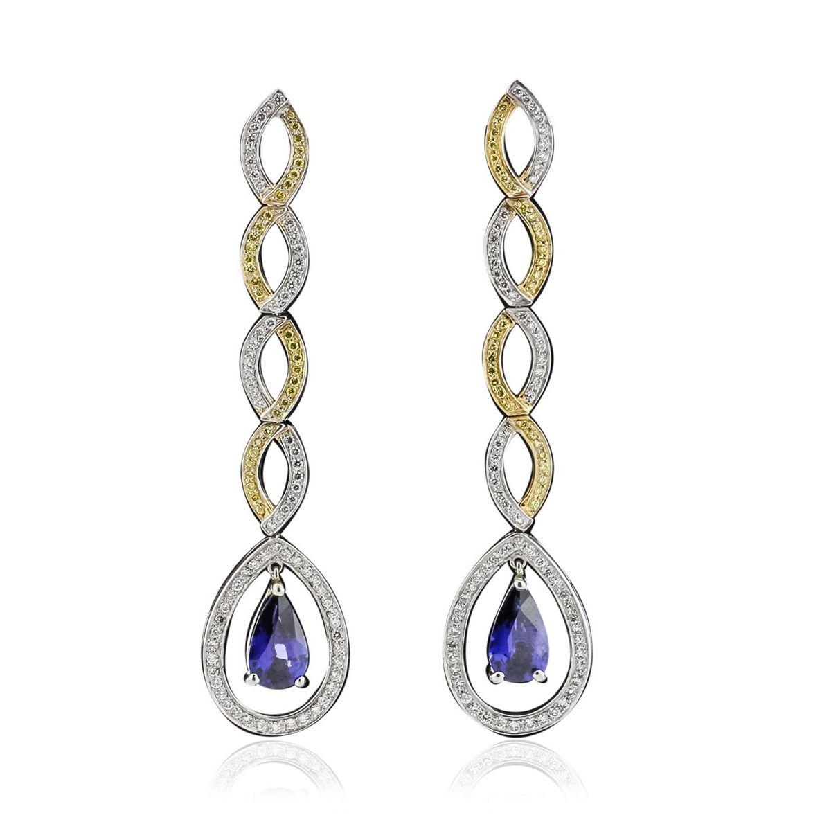 One pair electronically tested platinum ladies combination cast & assembled dangle earrings with friction posts with a bright polish finish. Measurements: 2.50" in length Identified with markings of "PT 950". Condition is very good. Containing: Two prong set pear modified brilliant cut natural blue sapphires, measuring 9.30 x 6.10 x 3.97mm, approximate total weight of 3.60ct., clarity is eye clean, type II, medium dark, moderately strong, blue color, (GIA B 6/4), cut is good. One Hundred Forty prong set round brilliant cut diamonds, measuring 1.10 - 1.10 x 0.66mm (depth est.) approximate total weight of 140 Stones = 0.67ct. Clarity: VS-2 to SI-1. Color: G - H, Cut is Very Good. Sixty-Four prong set round brilliant cut diamonds, measuring 1.10 - 1.10 x 0.66mm (depth est.) approximate total weight of 64 Stones = 0.31ct. Clarity: VS-2 to SI-1, Cut is Good. Colored gemstones are presumed to have been subjected to commonly used enhancement processes. All diamonds and colored gemstones are graded in the mounting, unless otherwise stated. Total Weight of Colored Stones 3.60ct. Total Weight of Diamonds 0.98ct. Total Weight of Earrings 17.40 grams. GGL Appraised at $20,990.00.