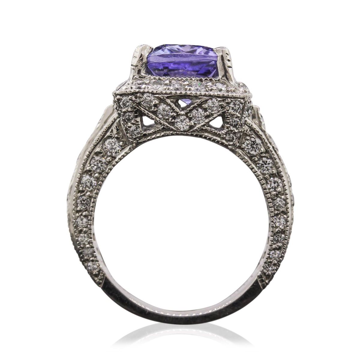 One electronically tested platinum Ladies combination cast & assembled ring with a bright polish finish. Condition is new. Identified with markings of "PLAT". Containing: One prong set rectangular cushion modified brilliant cut natural tanzanite, measuring 11.20 x 8.00 x 5.50mm, approximate weight of 3.88ct., clarity is eye clean, type I, medium light, very slightly grayish, violet color, (GIA V 4/3), cut is good. Colored gemstones are presumed to have been subjected to commonly used color/clarity enhancement processes. One Hundred Thirty-Two prong set round brilliant cut diamonds, measuring 1.80 - 1.50 x 0.99mm (depth est.) approximate total weight of 132 Stones = 1.80ct. Clarity of I-1 to I-2, Color of I - J, Cut is Good. Total Weight of Colored Stones 3.88ct. Total Weight of Diamonds 1.80ct. Total Weight of Ring 15.60 grams. GGL Appraised at $19,085.00.