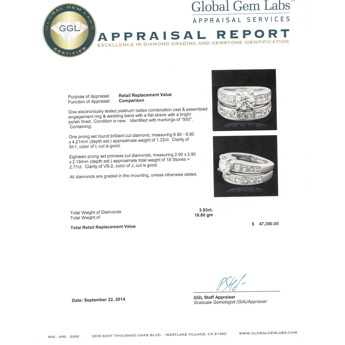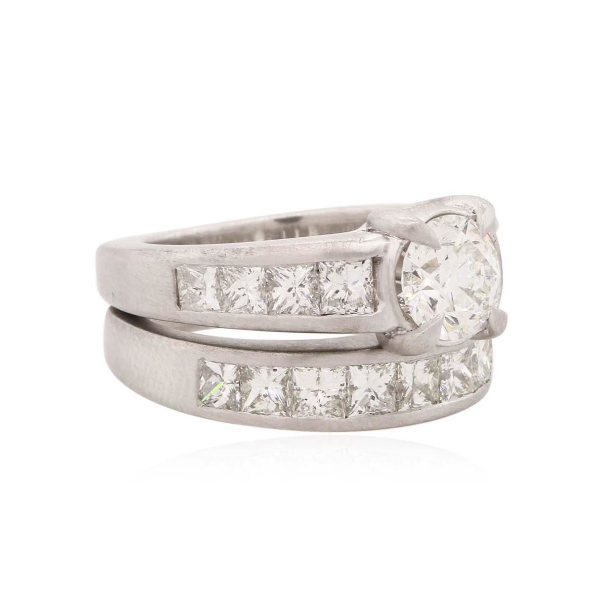 One electronically tested platinum ladies combination cast & assembled engagement ring & wedding band with a flat shank with a bright polish finish. Identified with markings of "950". Condition is new. Containing: One prong set round brilliant cut diamond, measuring 6.90 - 6.90 x 4.21mm (depth est.) approximate weight of 1.22ct. Clarity: SI-1. Color: I, Cut is Good. Eighteen prong set princess cut diamonds, measuring 2.90 x 2.90 x 2.18mm (depth est.) approximate total weight of 18 Stones = 2.71ct. Clarity: VS-2. Color: J, Cut is Good. All diamonds are graded in the mounting, unless otherwise stated. Total Weight of Diamonds 3.93ct. Total Weight of 18.80 grams. GGL Appraised at $47,390.00.