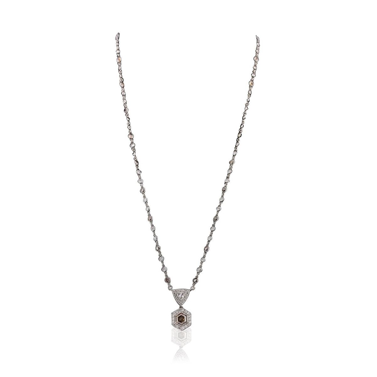 One electronically tested platinum ladies combination cast & assembled vintage necklace with a spring ring clasp with a bright polish finish. Measurements: 17" in length Identified with markings of "950". Condition is very good. Containing: One bezel set fancy cut diamond, measuring 7.00 x 7.00 x 3.60mm (depth est.) approximate weight of 1.15ct. Clarity: VS-2, Cut is Good. Eighteen bezel set round brilliant cut diamonds, measuring 3.00 - 2.50 x 1.65mm (depth est.) approximate total weight of 18 Stones = 1.37ct. Clarity: VS-2, Cut is Good. One bezel set triangle brilliant cut diamond, measuring 4.50 x 4.50 x 1.64mm (depth est.) approximate weight of 0.19ct. Clarity: SI-1. Color: I, Cut is Good. Forty-Eight bezel set round brilliant cut diamonds, measuring 2.50 - 1.30 x 1.14mm (depth est.) approximate total weight of 48 Stones = 1.46ct. Clarity: SI-1 to SI-2. Color: H - I, Cut is Good. Thirty prong set round brilliant cut diamonds, measuring 1.50 - 1.50 x 0.90mm (depth est.) approximate total weight of 30 Stones = 0.37ct. Clarity: SI-1 to I-1. Color: H - I, Cut is Good. All diamonds are graded in the mounting, unless otherwise stated. Total Weight of Diamonds 4.54ct. Total Weight of Necklace 6.26 grams. GGL Appraised at $21,585.00.