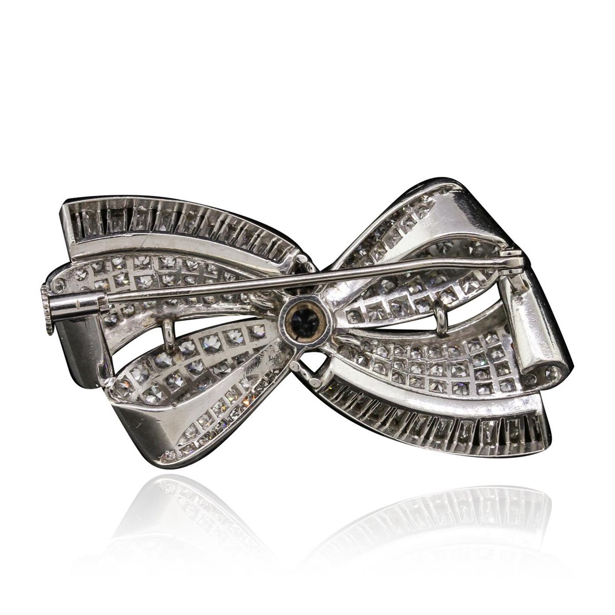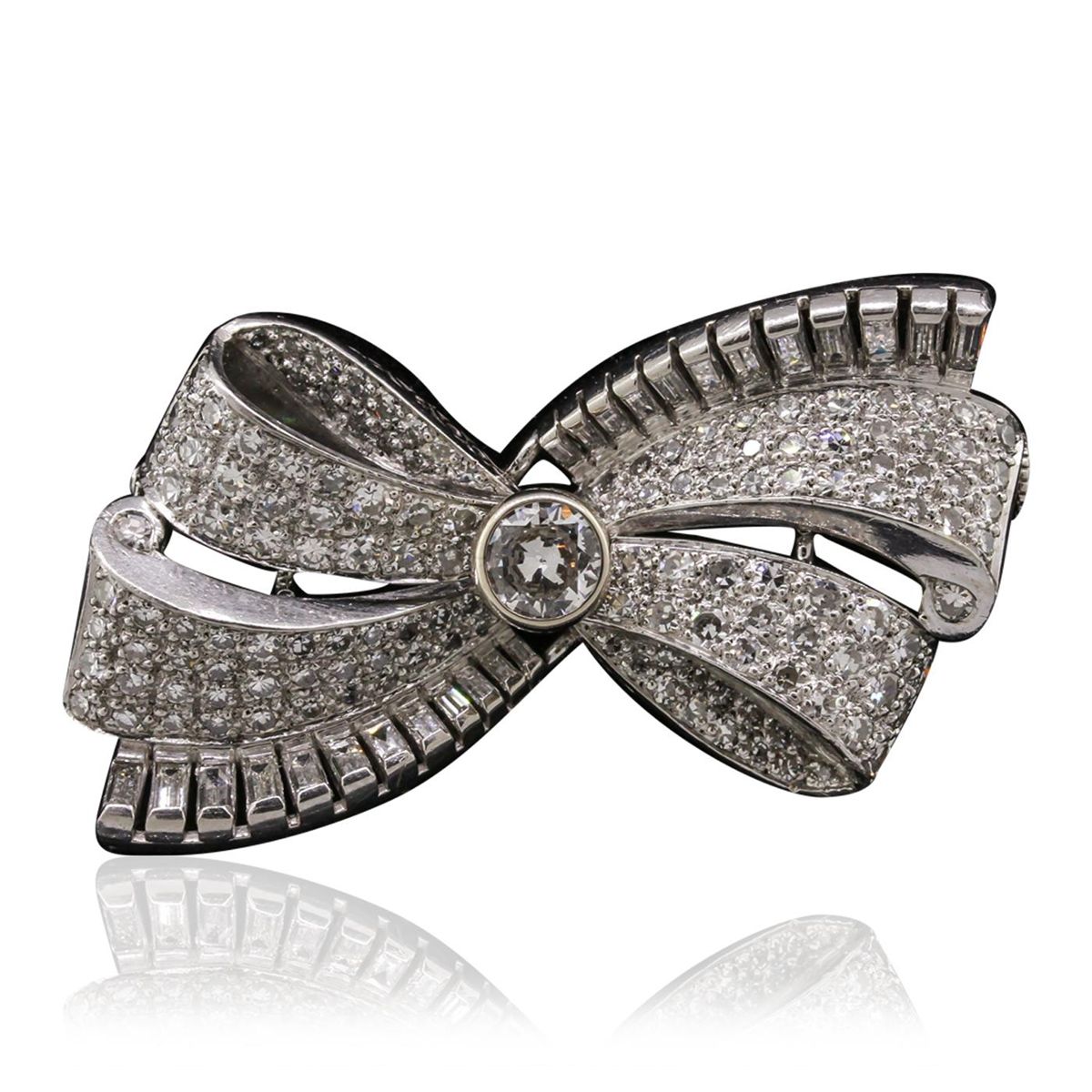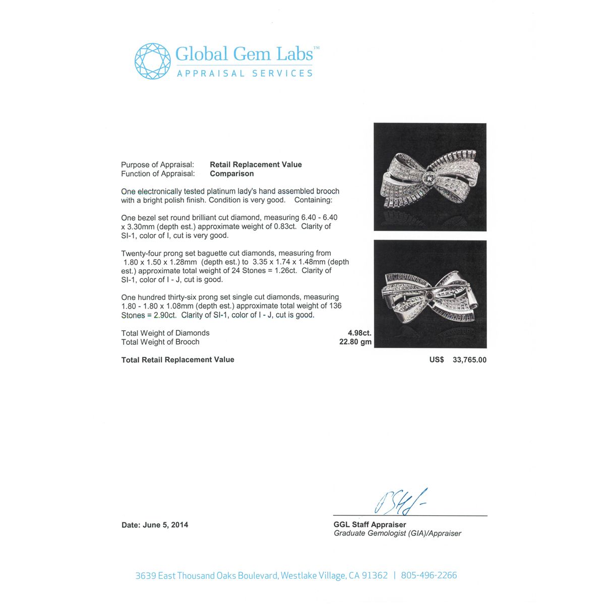 One electronically tested platinum Ladies hand assembled brooch with a bright polish finish. Condition is very good. Containing: One bezel set round brilliant cut diamond, measuring 6.40 - 6.40 x 3.30mm (depth est.) approximate weight of 0.83ct. Clarity: SI-1. Color: I, Cut is Very Good. Twenty-Four prong set baguette cut diamonds, measuring from 1.80 x 1.50 x 1.28mm (depth est.) to 3.35 x 1.74 x 1.48mm (depth est.) approximate. Total Weight of 24 Stones = 1.26ct. Clarity: SI-1. Color: I - J, Cut is Good. One Hundred Thirty-Six prong set single cut diamonds, measuring 1.80 - 1.80 x 1.08mm (depth est.) approximate. Total Weight of 136 Stones = 2.90ct. Clarity: SI-1. Color: I - J, Cut is Good. Total Weight of Diamonds 4.98ct. Total Weight of Brooch 22.80 grams. GGL Appraised at $33,765.00.