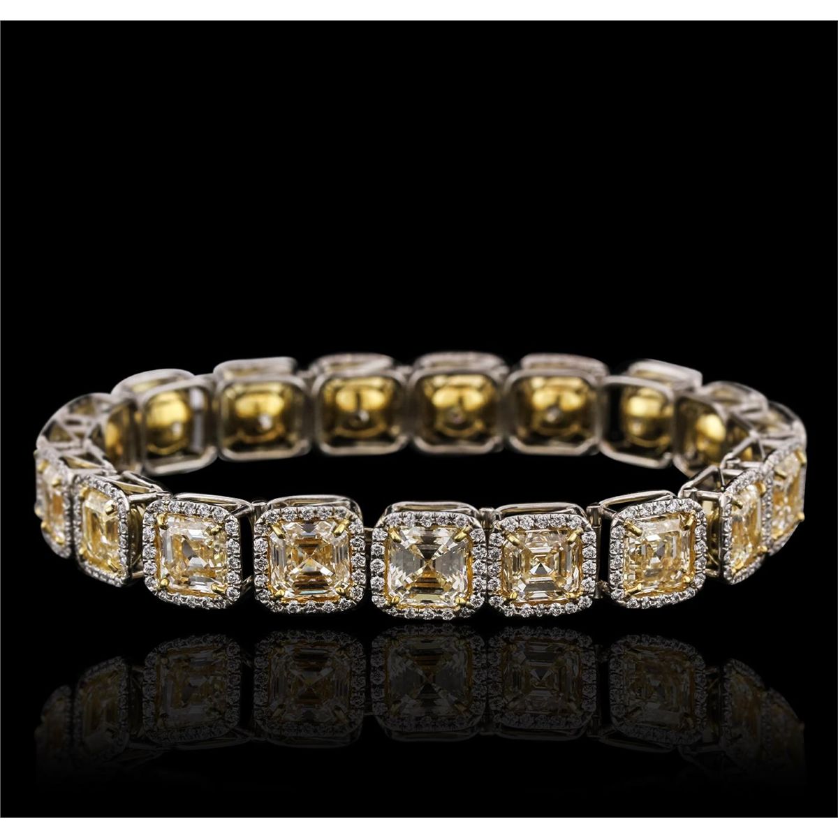 One electronically tested platinum ladies custom cast & assembled diamond bracelet with a bright finish. The seven and one quarter inch length bracelet is composed of nineteen yellow asscher cut diamonds each set in a Yellow Gold basket within a white diamond bezel, completed by a concealed clasp with safety. Condition is good. Containing: Nineteen prong set Asscher cut diamonds, measuring 7.30 x 7.00 x 0.00mm (depth est.) approximate total weight of 19 Stones = 38.19ct. Graded mounted in the EGL Laboratory, Report No. US9117621. EGL Fancy Light Yellow to Fancy Yellow. Clarity: VVS-2 to VS-2 Three Hundred Eighty prong set round brilliant cut diamonds, measuring 1.40 - 1.20 x 0.81mm (depth est.) approximate total weight of 380 Stones = 3.60ct. Graded in the setting. Clarity: VS-1 to SI-1. Color: F - H. Total Weight of Diamonds 41.79ct. Total Weight of Bracelet 49.80 grams. AIG Appraised at $499,000.00.