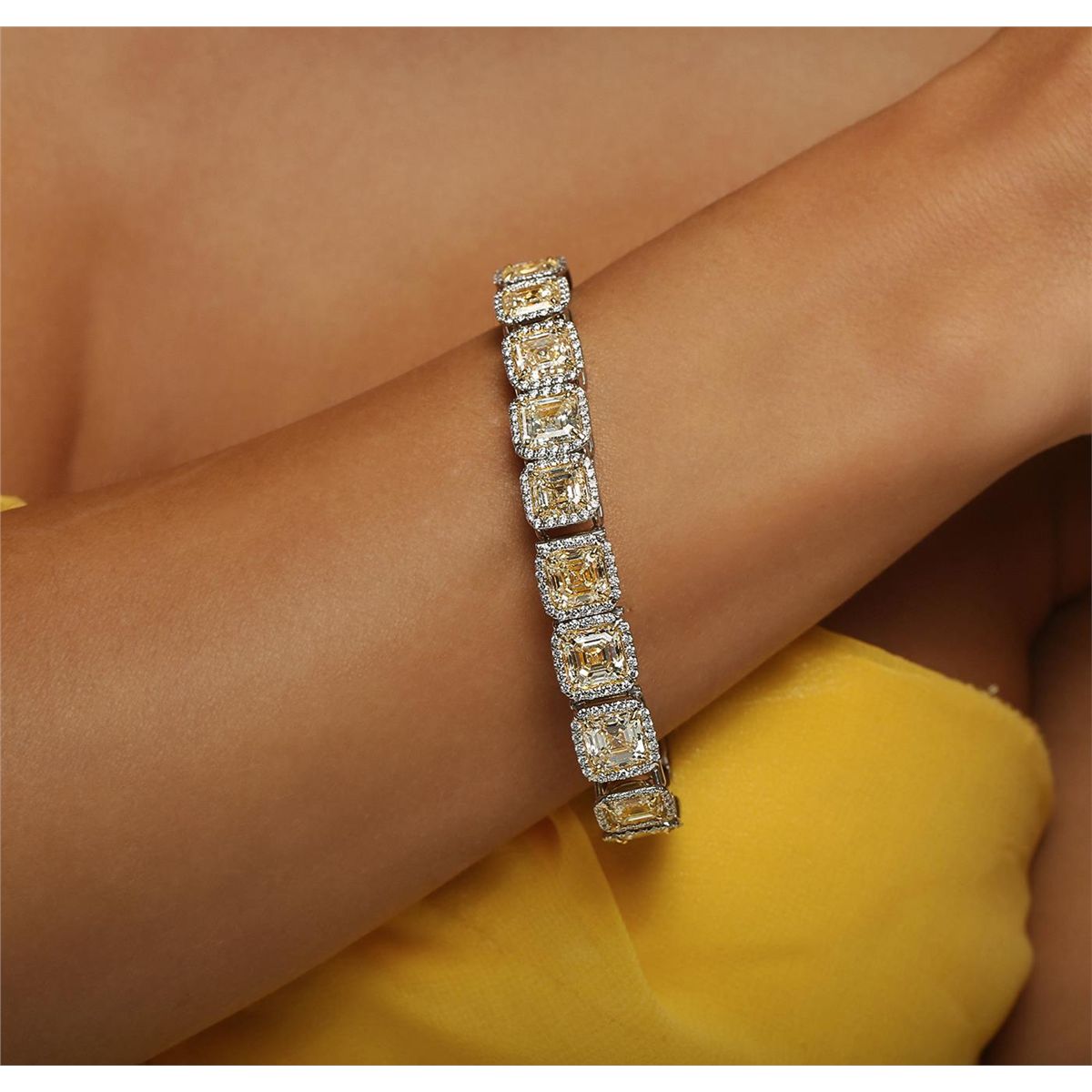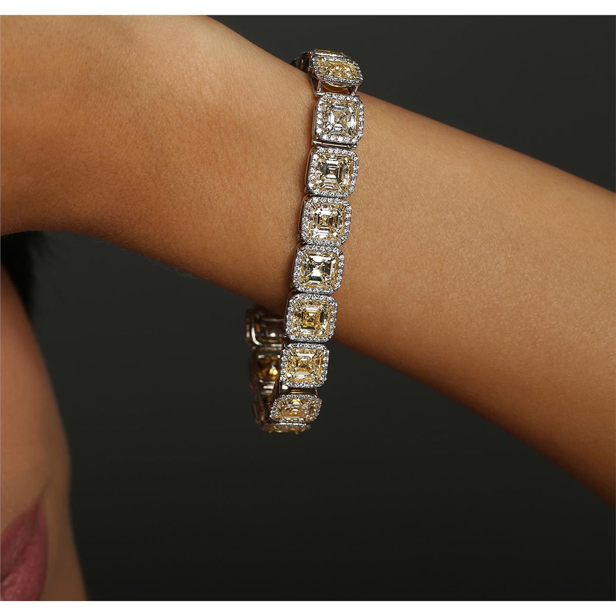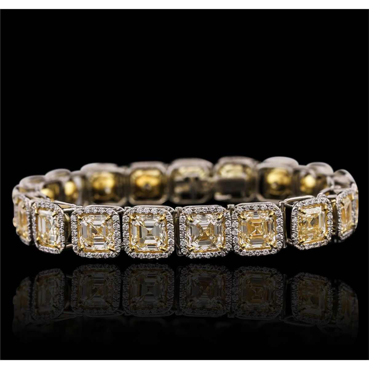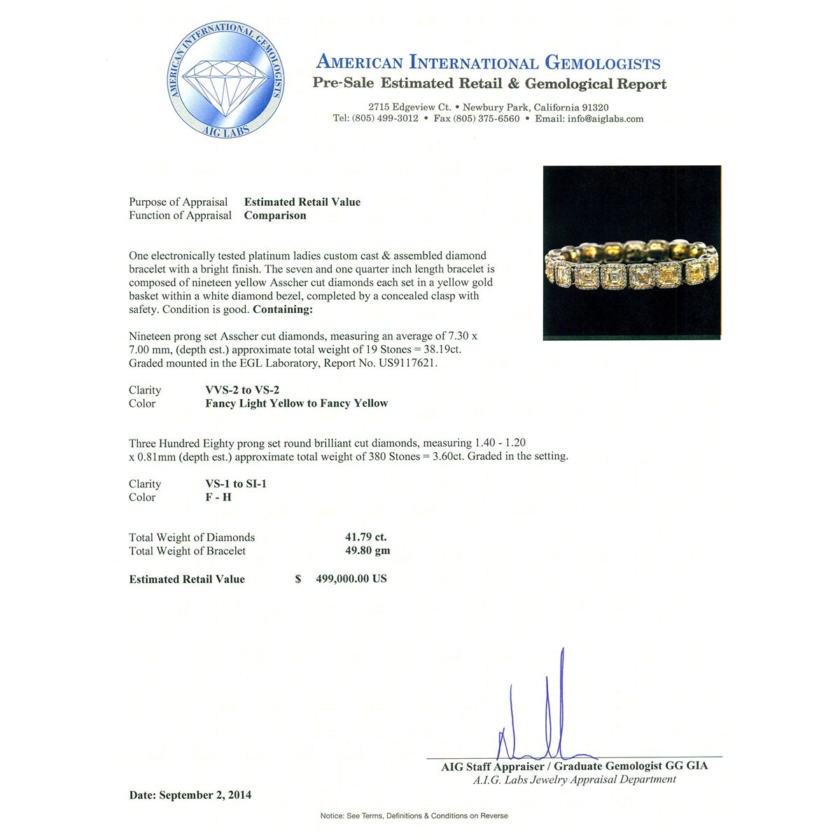 One electronically tested platinum ladies custom cast & assembled diamond bracelet with a bright finish. The seven and one quarter inch length bracelet is composed of nineteen yellow asscher cut diamonds each set in a Yellow Gold basket within a white diamond bezel, completed by a concealed clasp with safety. Condition is good. Containing: Nineteen prong set Asscher cut diamonds, measuring 7.30 x 7.00 x 0.00mm (depth est.) approximate total weight of 19 Stones = 38.19ct. Graded mounted in the EGL Laboratory, Report No. US9117621. EGL Fancy Light Yellow to Fancy Yellow. Clarity: VVS-2 to VS-2 Three Hundred Eighty prong set round brilliant cut diamonds, measuring 1.40 - 1.20 x 0.81mm (depth est.) approximate total weight of 380 Stones = 3.60ct. Graded in the setting. Clarity: VS-1 to SI-1. Color: F - H. Total Weight of Diamonds 41.79ct. Total Weight of Bracelet 49.80 grams. AIG Appraised at $499,000.00.