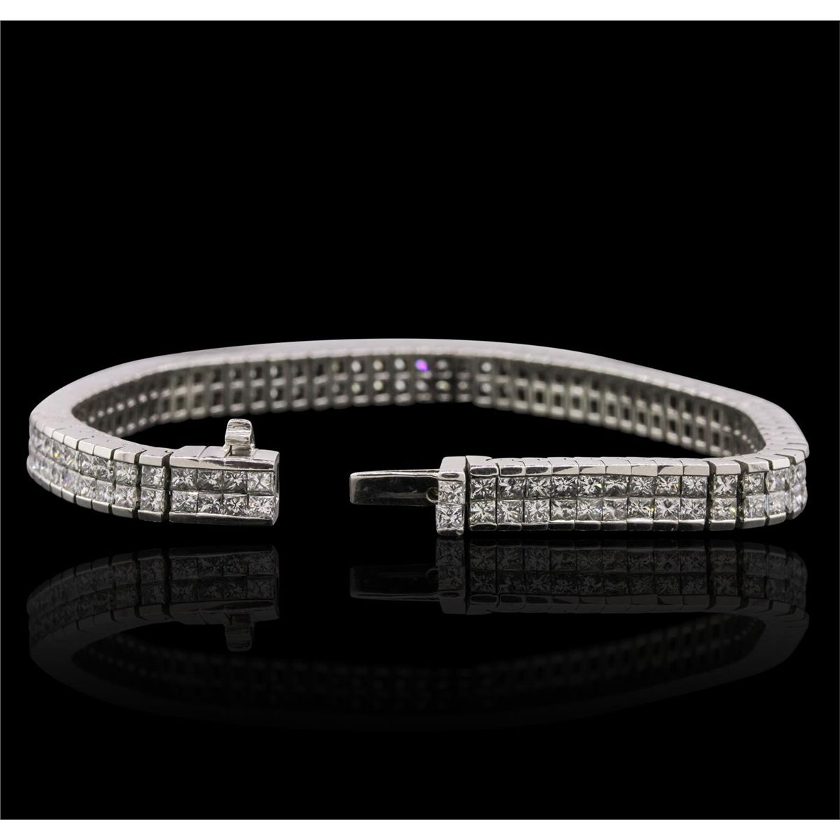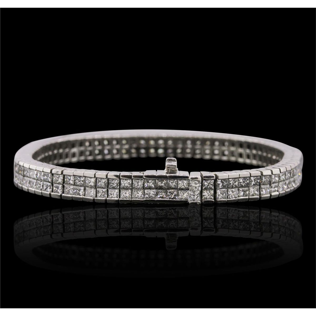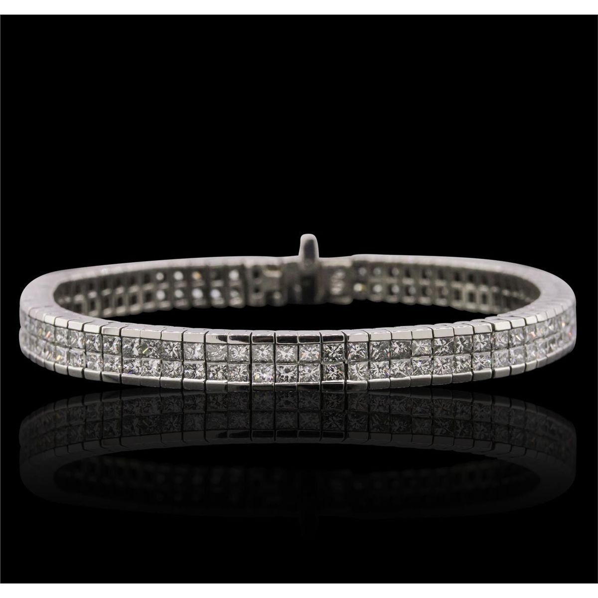 One electronically tested platinum Ladies combination cast & assembled bracelet with a hidden box clasp with a bright polish finish. Measurements: 7" in length. Identified with markings of "PLAT". Condition is new. Containing: One Hundred Fifty-Eight prong set princess cut diamonds, measuring 2.00 x 2.00 x 1.50mm (depth est.) approximate. Total Weight of 158 Stones = 7.77ct. Clarity: VS-2 to SI-1. Color: H - I, Cut is Good. Total Weight of Diamonds 7.77ct. Total Weight of Bracelet 49.20 grams. GGL Appraised at $48,640.00.