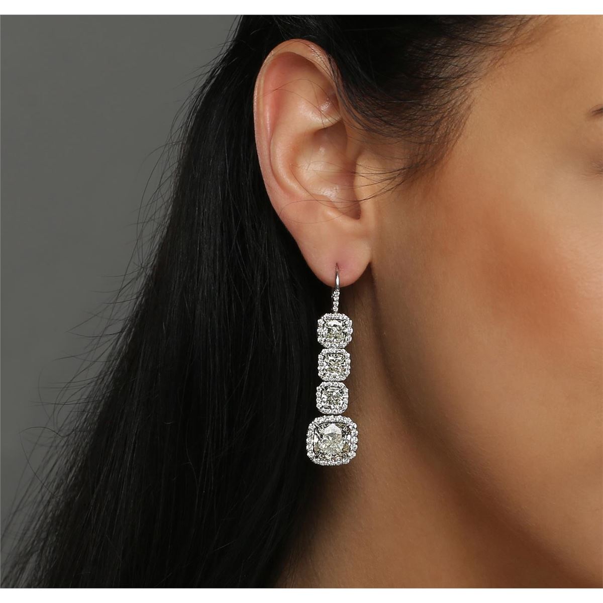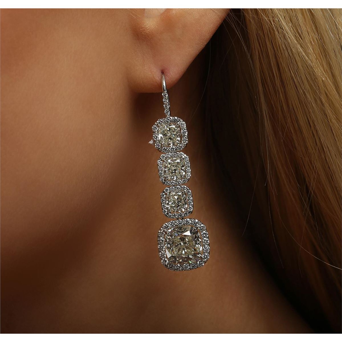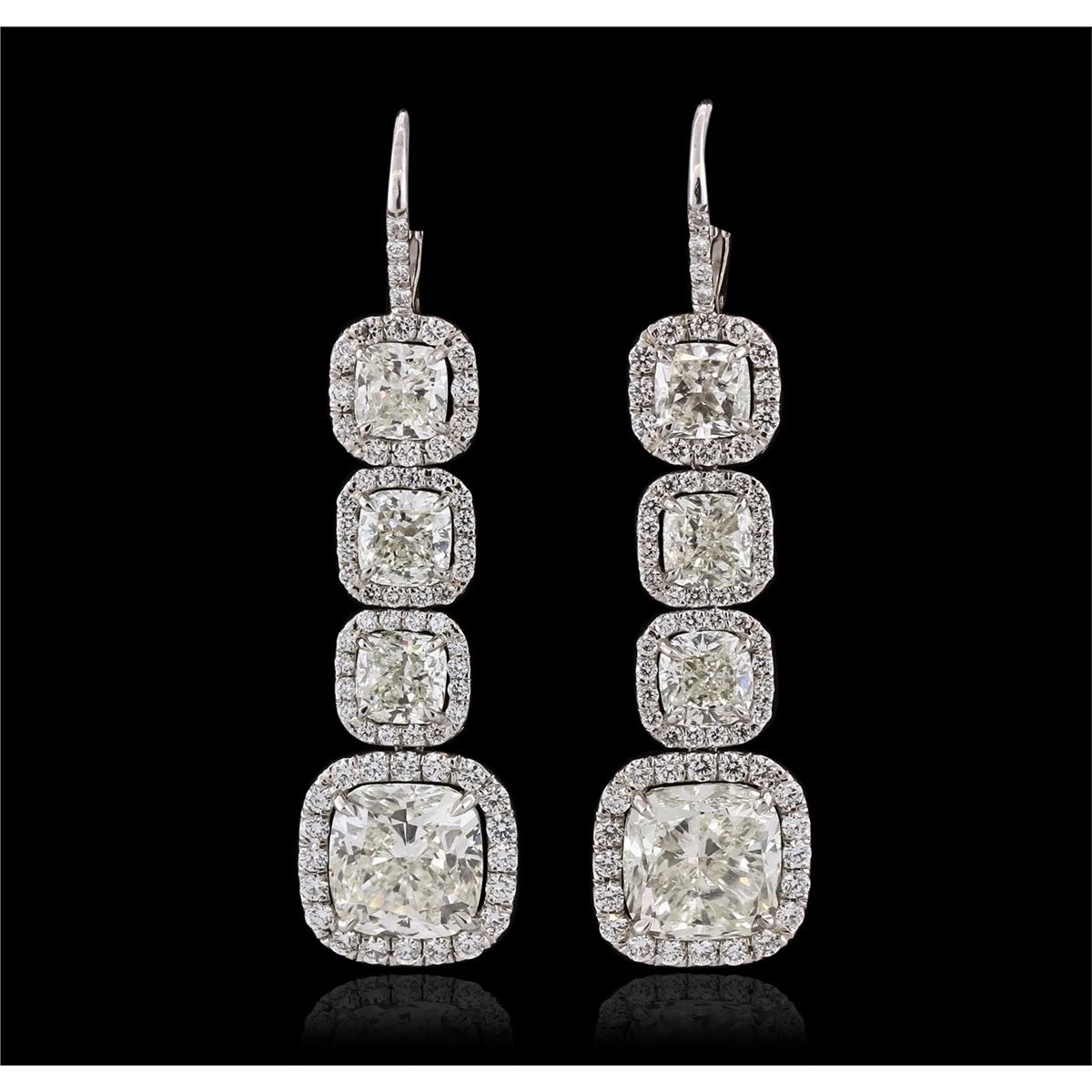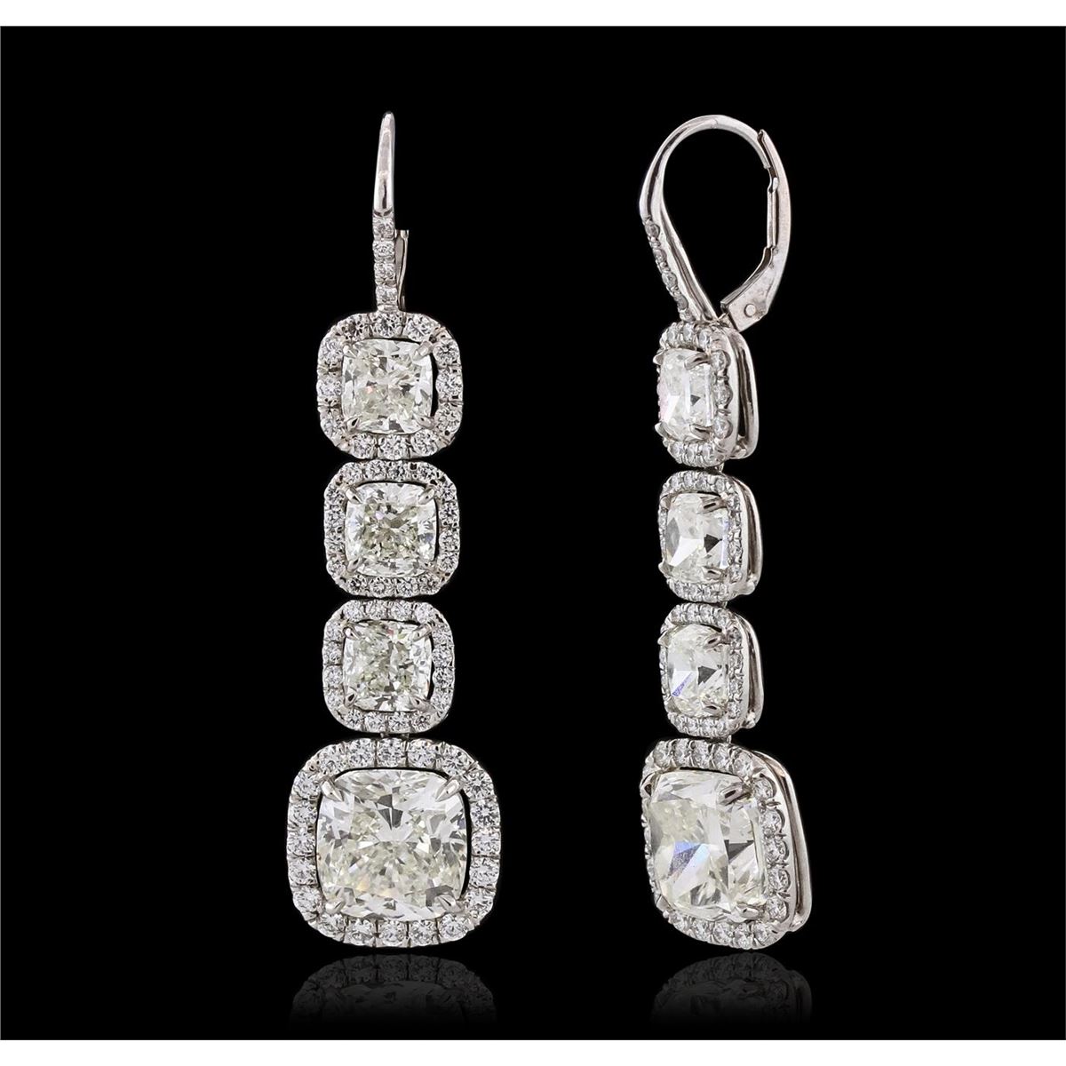One pair electronically tested platinum ladies custom cast & assembled diamond dangle earrings with hinged, snap locking posts. Each earring features three cushion cut diamonds set within diamond bezels, transitioning to a larger cushion cut diamond bezel set. The overall length is two inches. Condition is very good. Containing: Six prong set cushion cut diamonds, measuring 5.50 x 5.30 x 3.55mm (depth est.), 3.00.% GTCF approximate total weight of 6 Stones = 6.05ct. Measurements are an average for the group. Graded mounted in the EGL UGS Laboratory, Report # US 911762101D. Clarity: VS-1 to VS-2. Color: H - I Two prong set cushion cut diamonds, measuring 9.40 x 9.35 x 5.86mm (depth est.), 4.00.% GTCF approximate total weight of 2 Stones = 10.02ct. Graded mounted in the EGL UGS Laboratory, Report # US 911762101D. Clarity: VS-1. Color: J One Hundred Thirty-Six prong set round brilliant cut diamonds, measuring 1.90 - 1.30 x 0.99mm (depth est.) approximate total weight of 136 Stones = 2.10ct. Graded mounted in the EGL UGS Laboratory, Report # US 911762101D. Clarity: VVS-2 to VS-2. Color: H - I. Total Weight of Diamonds 18.17ct. Total Weight of Earrings 13.40 grams. AIG Appraised at $670,000.00.