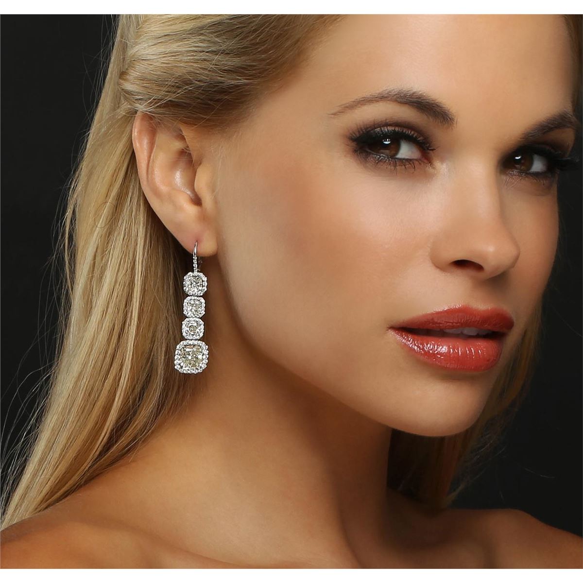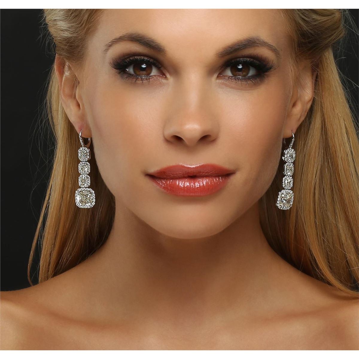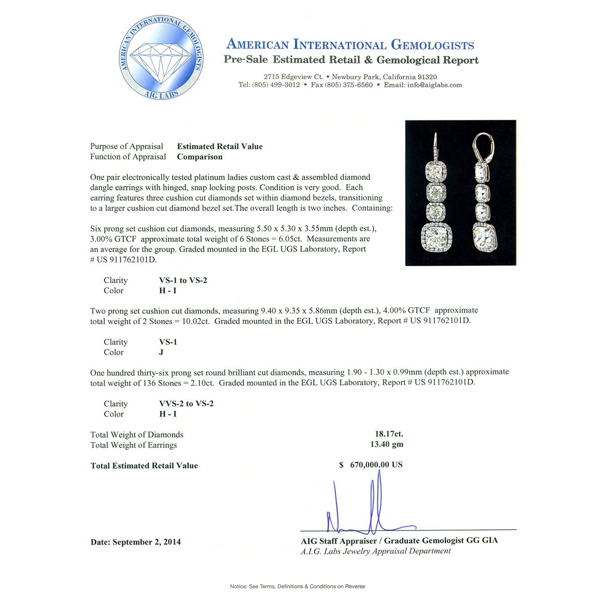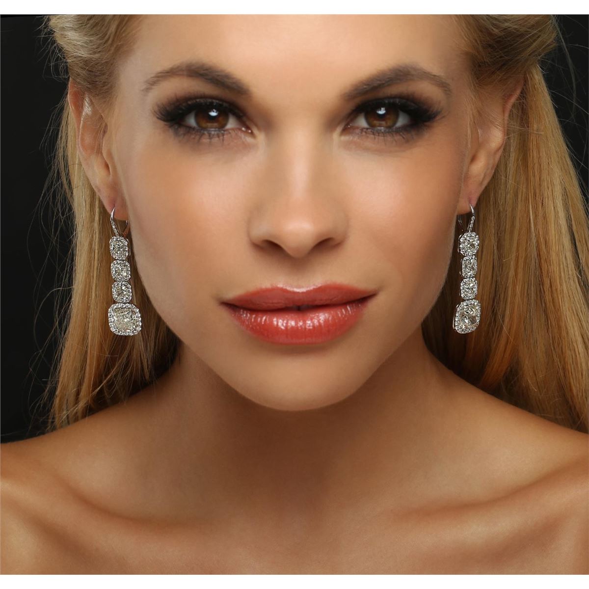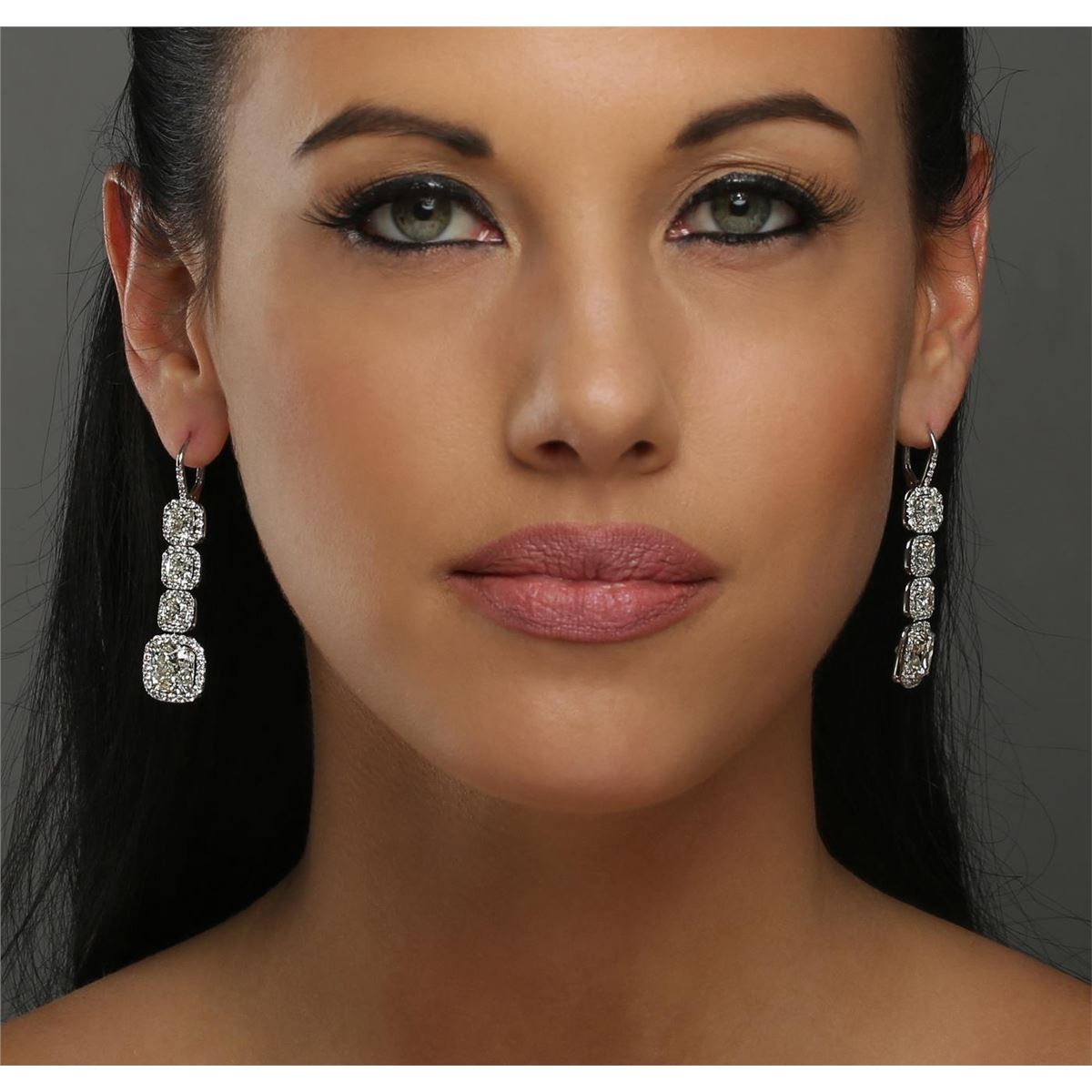 One pair electronically tested platinum ladies custom cast & assembled diamond dangle earrings with hinged, snap locking posts. Each earring features three cushion cut diamonds set within diamond bezels, transitioning to a larger cushion cut diamond bezel set. The overall length is two inches. Condition is very good. Containing: Six prong set cushion cut diamonds, measuring 5.50 x 5.30 x 3.55mm (depth est.), 3.00.% GTCF approximate total weight of 6 Stones = 6.05ct. Measurements are an average for the group. Graded mounted in the EGL UGS Laboratory, Report # US 911762101D. Clarity: VS-1 to VS-2. Color: H - I Two prong set cushion cut diamonds, measuring 9.40 x 9.35 x 5.86mm (depth est.), 4.00.% GTCF approximate total weight of 2 Stones = 10.02ct. Graded mounted in the EGL UGS Laboratory, Report # US 911762101D. Clarity: VS-1. Color: J One Hundred Thirty-Six prong set round brilliant cut diamonds, measuring 1.90 - 1.30 x 0.99mm (depth est.) approximate total weight of 136 Stones = 2.10ct. Graded mounted in the EGL UGS Laboratory, Report # US 911762101D. Clarity: VVS-2 to VS-2. Color: H - I. Total Weight of Diamonds 18.17ct. Total Weight of Earrings 13.40 grams. AIG Appraised at $670,000.00.
