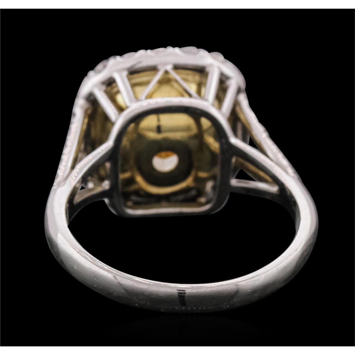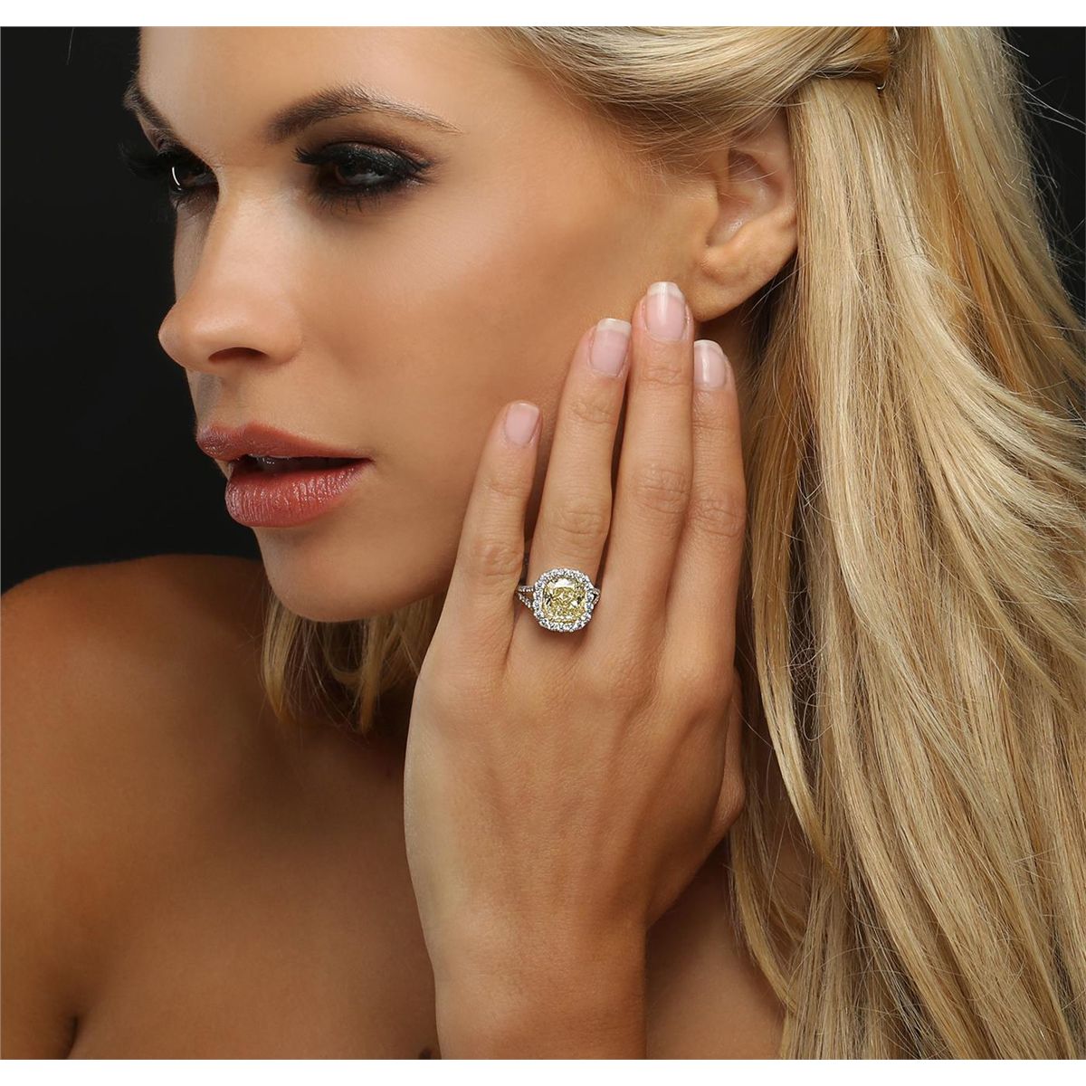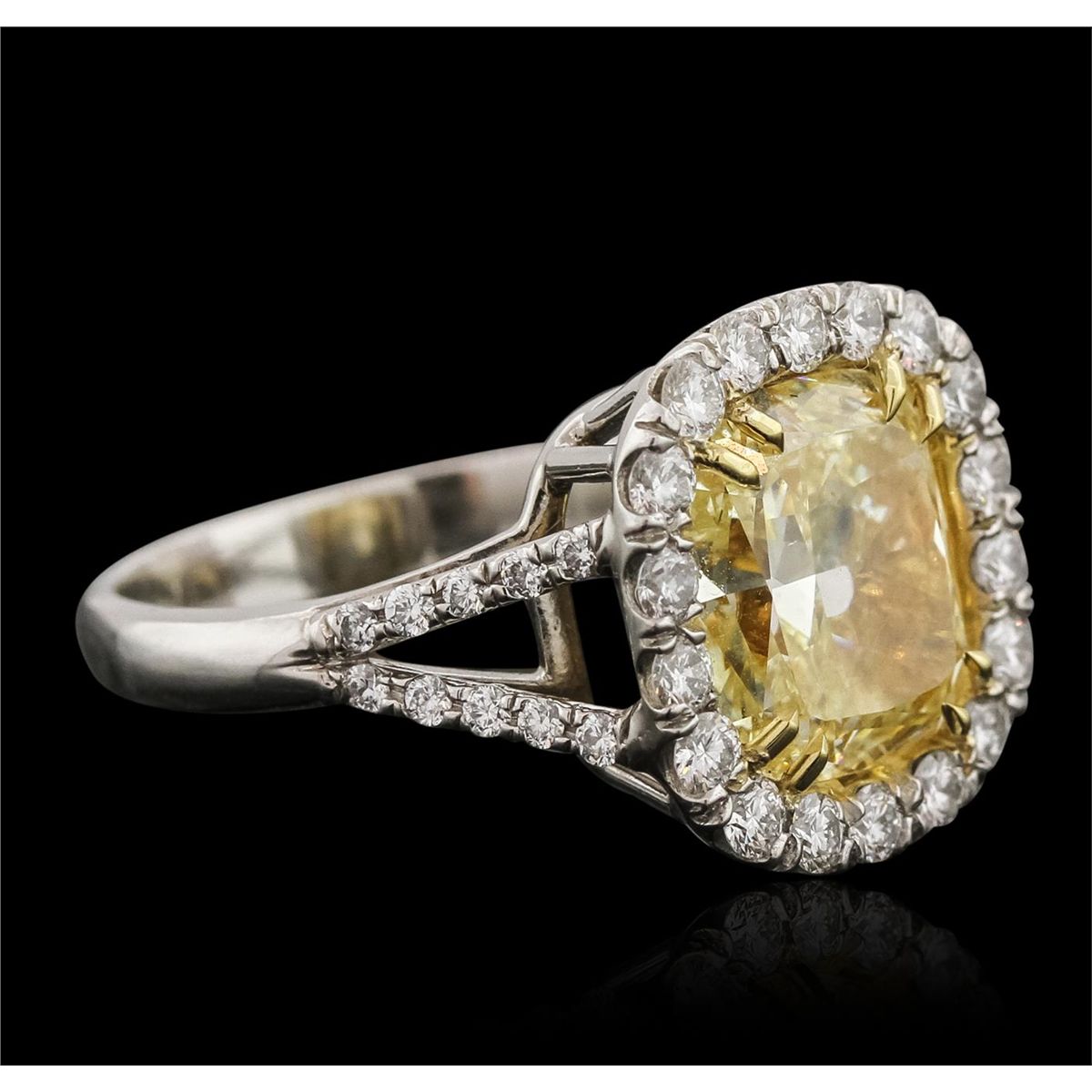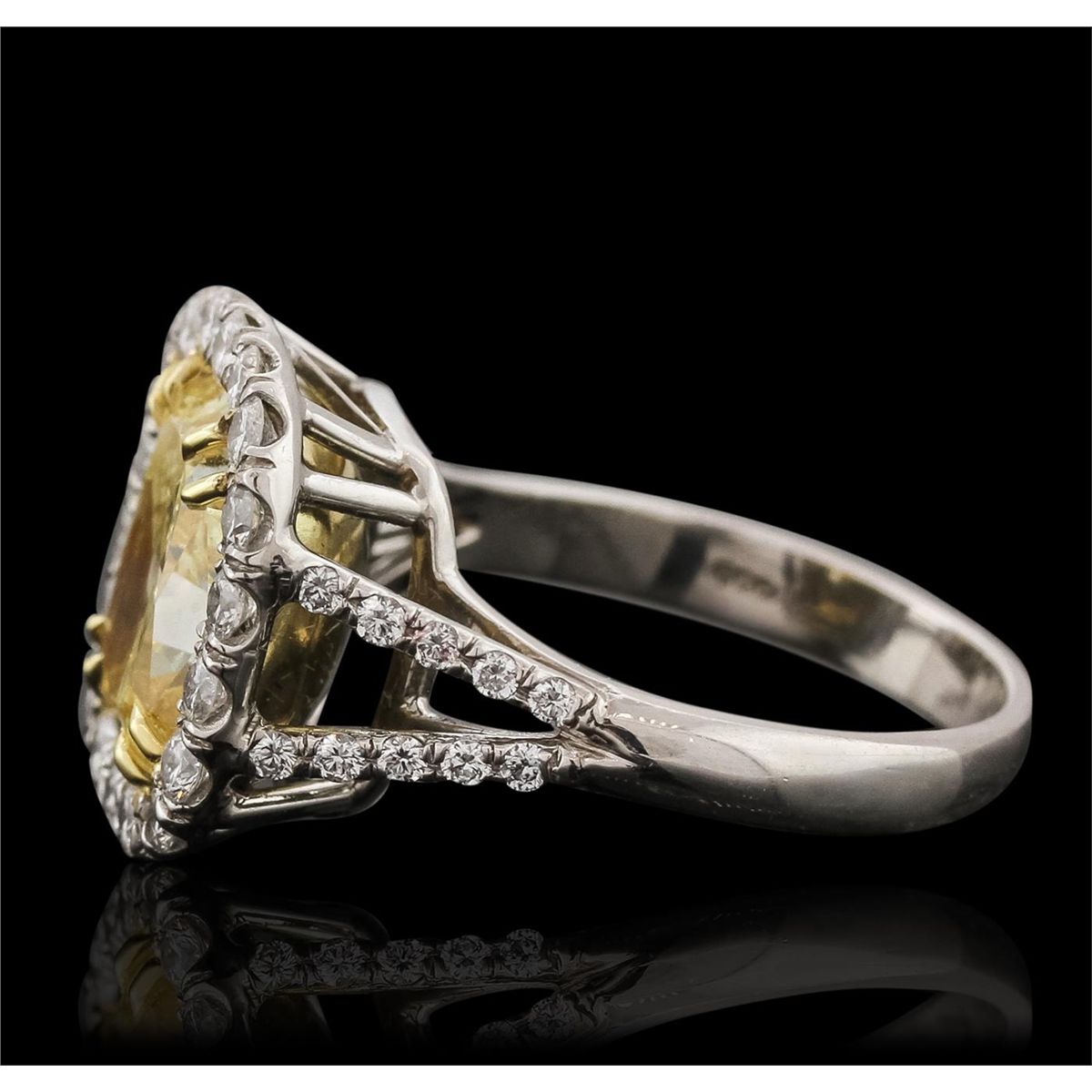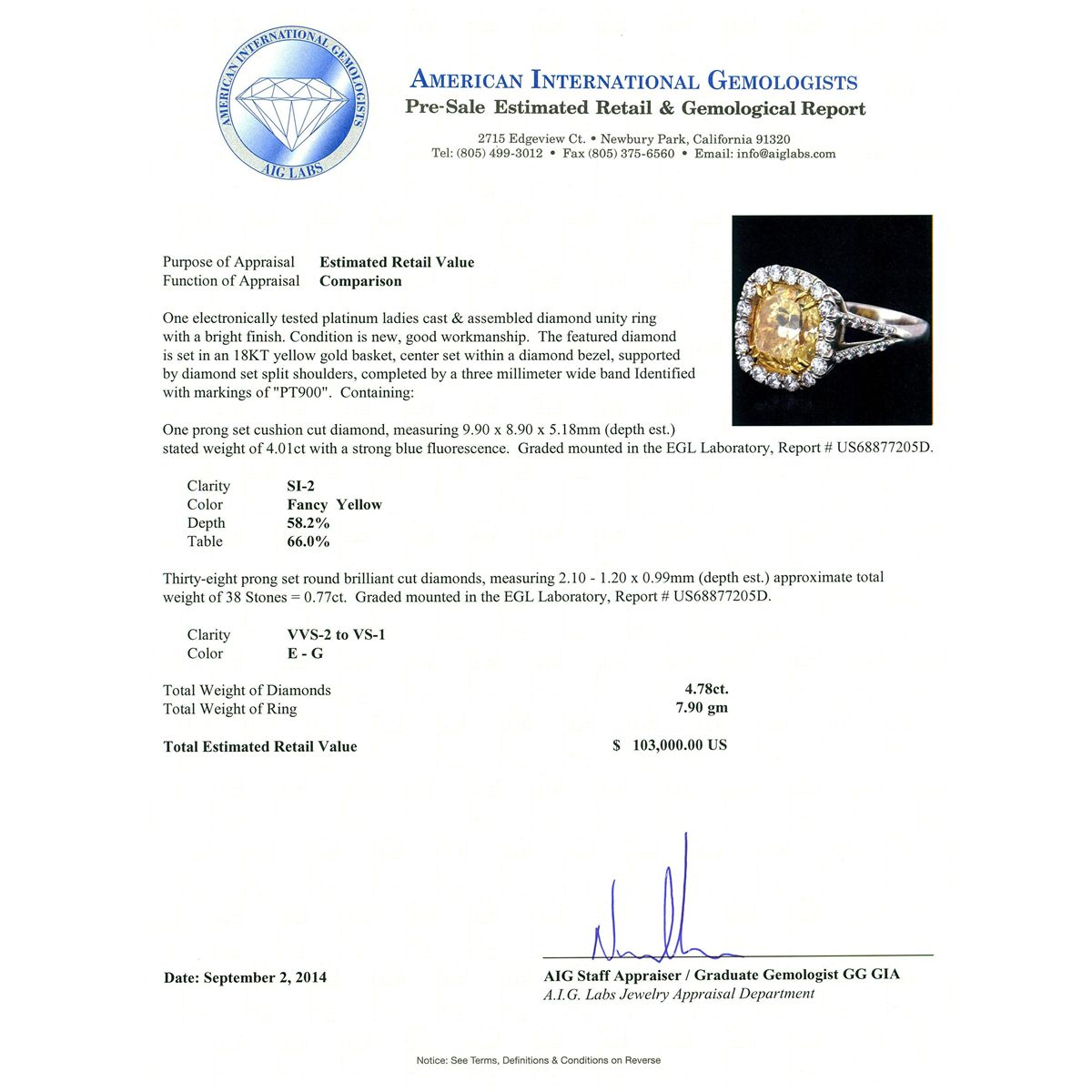 One electronically tested platinum ladies cast & assembled diamond unity ring with a bright finish. The featured diamond is set in an 18KT Yellow Gold basket, center set within a diamond bezel, supported by diamond set split shoulders, completed by a three millimeter wide band Identified with markings of "PT900". Condition is new, good workmanship. Containing: One prong set cushion cut diamond, measuring 9.90 x 8.90 x 5.18mm (depth est.) stated weight of 4.01ct with a strong blue fluorescence. Graded mounted in the EGL Laboratory, Report # US68877205D. Clarity: SI-2. Depth: 58.2%. Table 66.0%. Thirty-Eight prong set round brilliant cut diamonds, measuring 2.10 - 1.20 x 0.99mm (depth est.) approximate total weight of 38 Stones = 0.77ct. Graded mounted in the EGL Laboratory, Report # US68877205D. Clarity: VVS-2 to VS-1. Color: E - G. Total Weight of Diamonds 4.78ct. Total Weight of Ring 7.90 grams. AIGAppraised at $103,000.00.
