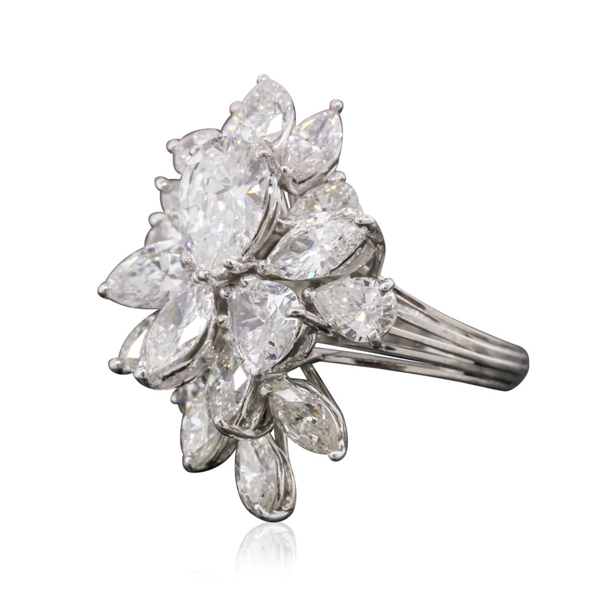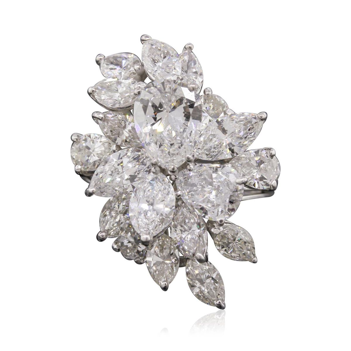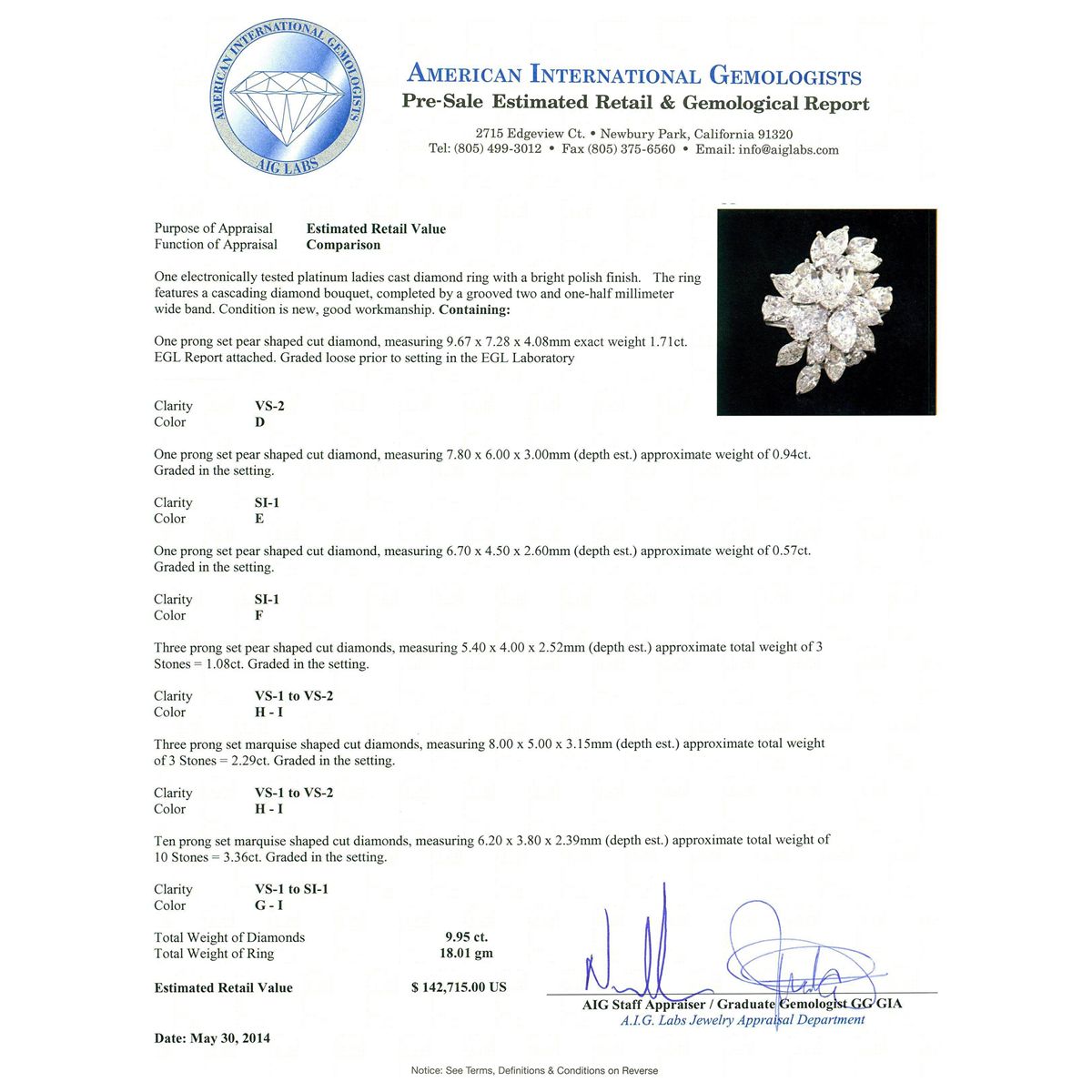 One electronically tested platinum ladies cast diamond ring with a bright polish finish. Condition is new, good workmanship. The ring features a cascading diamond bouquet, completed by a grooved two and one-half millimeter wide band. Containing: One prong set pear shaped cut diamond, measuring 9.67 x 7.28 x 4.08mm exact weight 1.71ct. EGL Report attached. Graded loose prior to setting in the EGL Laboratory Report #US 910741801D. Clarity: VS-2. Color: D Depth 56.0%. Table 66.0%. Pavil. Depth%. 44.8%. One prong set pear shaped cut diamond, measuring 7.80 x 6.00 x 3.00mm (depth est.) approximate weight of 0.94ct. Graded in the setting. Clarity: SI-1. Color: E One prong set pear shaped cut diamond, measuring 6.70 x 4.50 x 2.60mm (depth est.) approximate weight of 0.57ct. Graded in the setting. Clarity: SI-1. Color: F Three prong set pear shaped cut diamonds, measuring 5.40 x 4.00 x 2.52mm (depth est.) approximate. Total Weight of 3 Stones = 1.08ct. Graded in the setting. Clarity: VS-1 to VS-2. Color: H - I Three prong set marquise shaped cut diamonds, measuring 8.00 x 5.00 x 3.15mm (depth est.) approximate. Total Weight of 3 Stones = 2.29ct. Graded in the setting. Clarity: VS-1 to VS-2. Color: H - I Ten prong set marquise shaped cut diamonds, measuring 6.20 x 3.80 x 2.39mm (depth est.) approximate. Total Weight of 10 Stones = 3.36ct. Graded in the setting. Clarity: VS-1 to SI-1. Color: G - I. Total Weight of Diamonds 9.95ct. Total Weight of Ring 18.01 grams. AIG Appraised at $142,715.00.