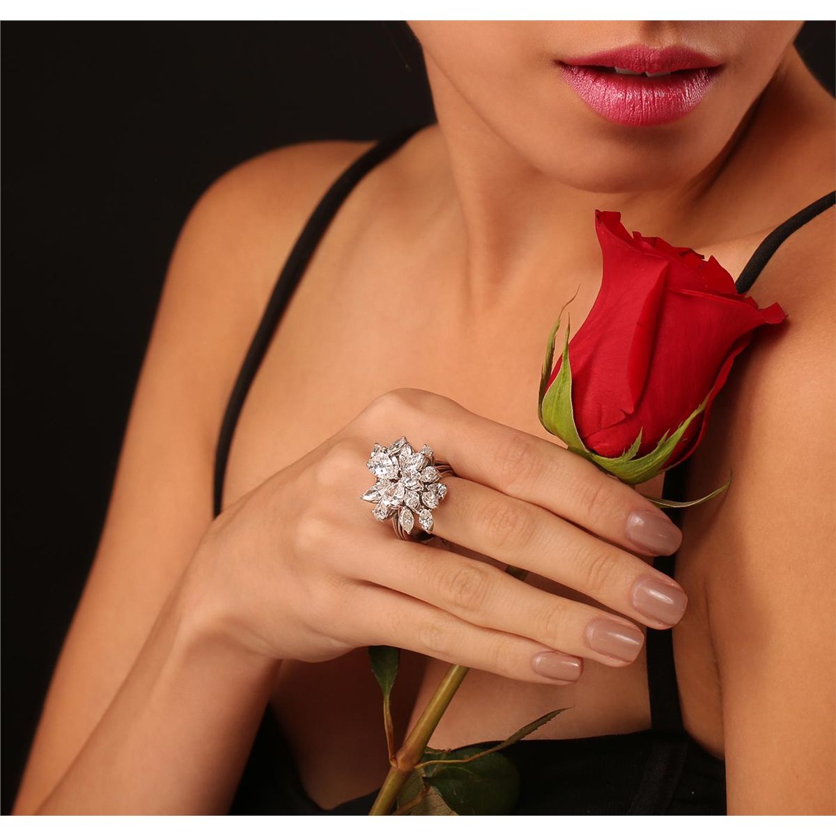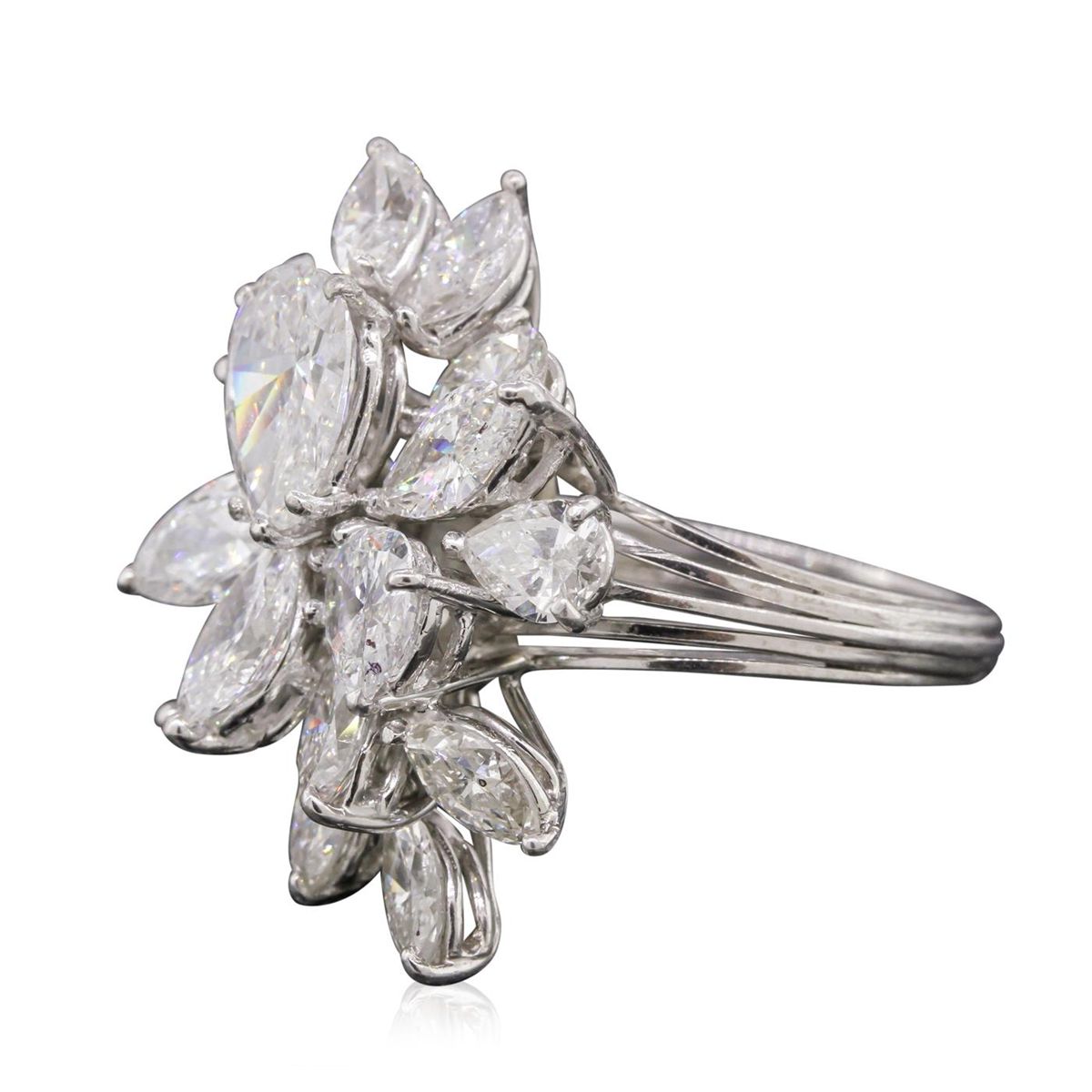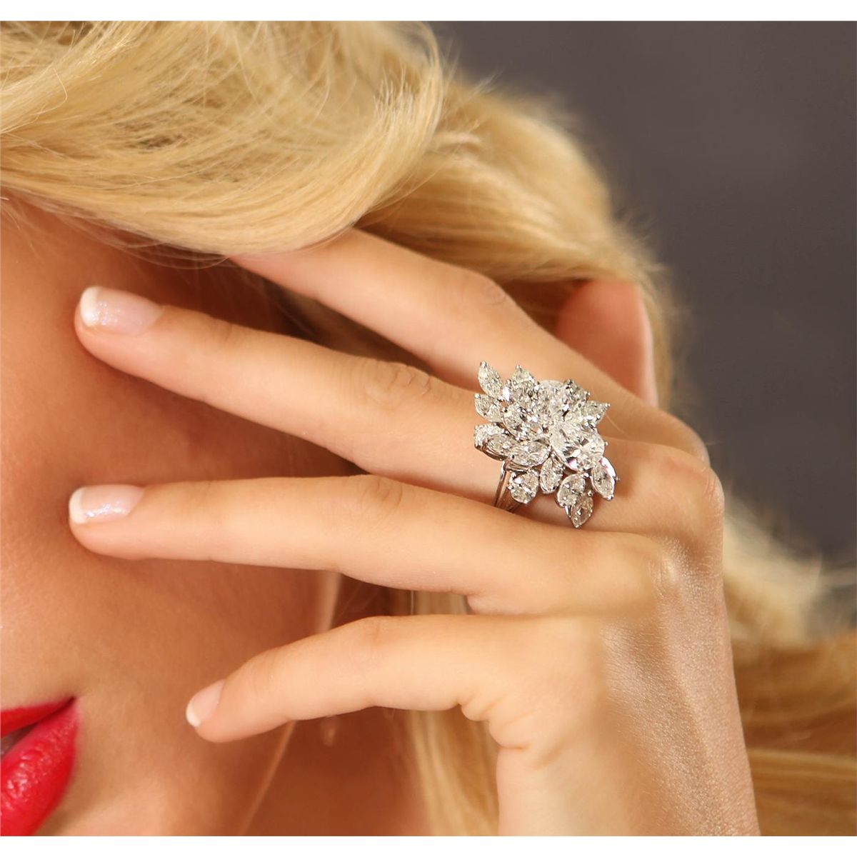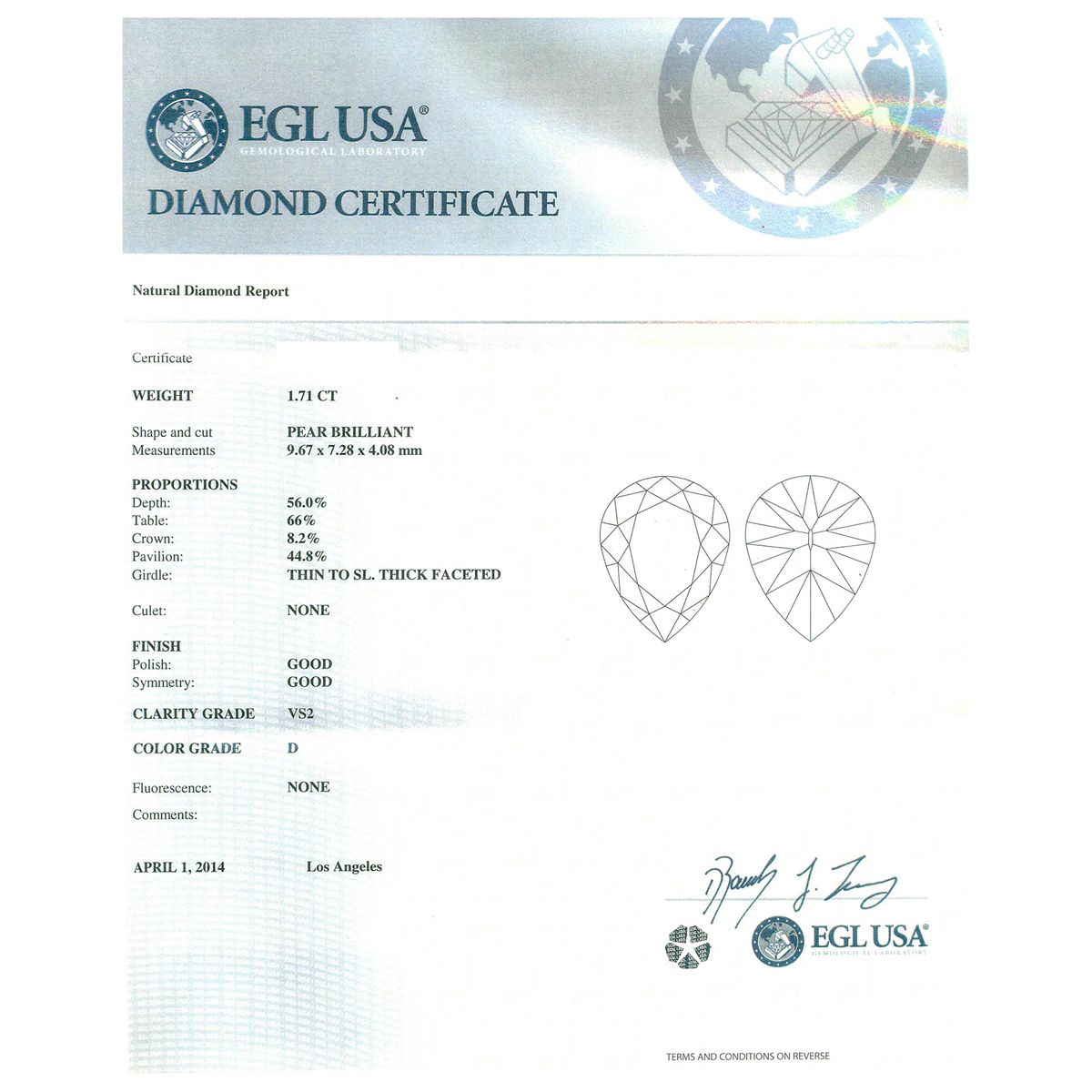 One electronically tested platinum ladies cast diamond ring with a bright polish finish. Condition is new, good workmanship. The ring features a cascading diamond bouquet, completed by a grooved two and one-half millimeter wide band. Containing: One prong set pear shaped cut diamond, measuring 9.67 x 7.28 x 4.08mm exact weight 1.71ct. EGL Report attached. Graded loose prior to setting in the EGL Laboratory Report #US 910741801D. Clarity: VS-2. Color: D Depth 56.0%. Table 66.0%. Pavil. Depth%. 44.8%. One prong set pear shaped cut diamond, measuring 7.80 x 6.00 x 3.00mm (depth est.) approximate weight of 0.94ct. Graded in the setting. Clarity: SI-1. Color: E One prong set pear shaped cut diamond, measuring 6.70 x 4.50 x 2.60mm (depth est.) approximate weight of 0.57ct. Graded in the setting. Clarity: SI-1. Color: F Three prong set pear shaped cut diamonds, measuring 5.40 x 4.00 x 2.52mm (depth est.) approximate. Total Weight of 3 Stones = 1.08ct. Graded in the setting. Clarity: VS-1 to VS-2. Color: H - I Three prong set marquise shaped cut diamonds, measuring 8.00 x 5.00 x 3.15mm (depth est.) approximate. Total Weight of 3 Stones = 2.29ct. Graded in the setting. Clarity: VS-1 to VS-2. Color: H - I Ten prong set marquise shaped cut diamonds, measuring 6.20 x 3.80 x 2.39mm (depth est.) approximate. Total Weight of 10 Stones = 3.36ct. Graded in the setting. Clarity: VS-1 to SI-1. Color: G - I. Total Weight of Diamonds 9.95ct. Total Weight of Ring 18.01 grams. AIG Appraised at $142,715.00.