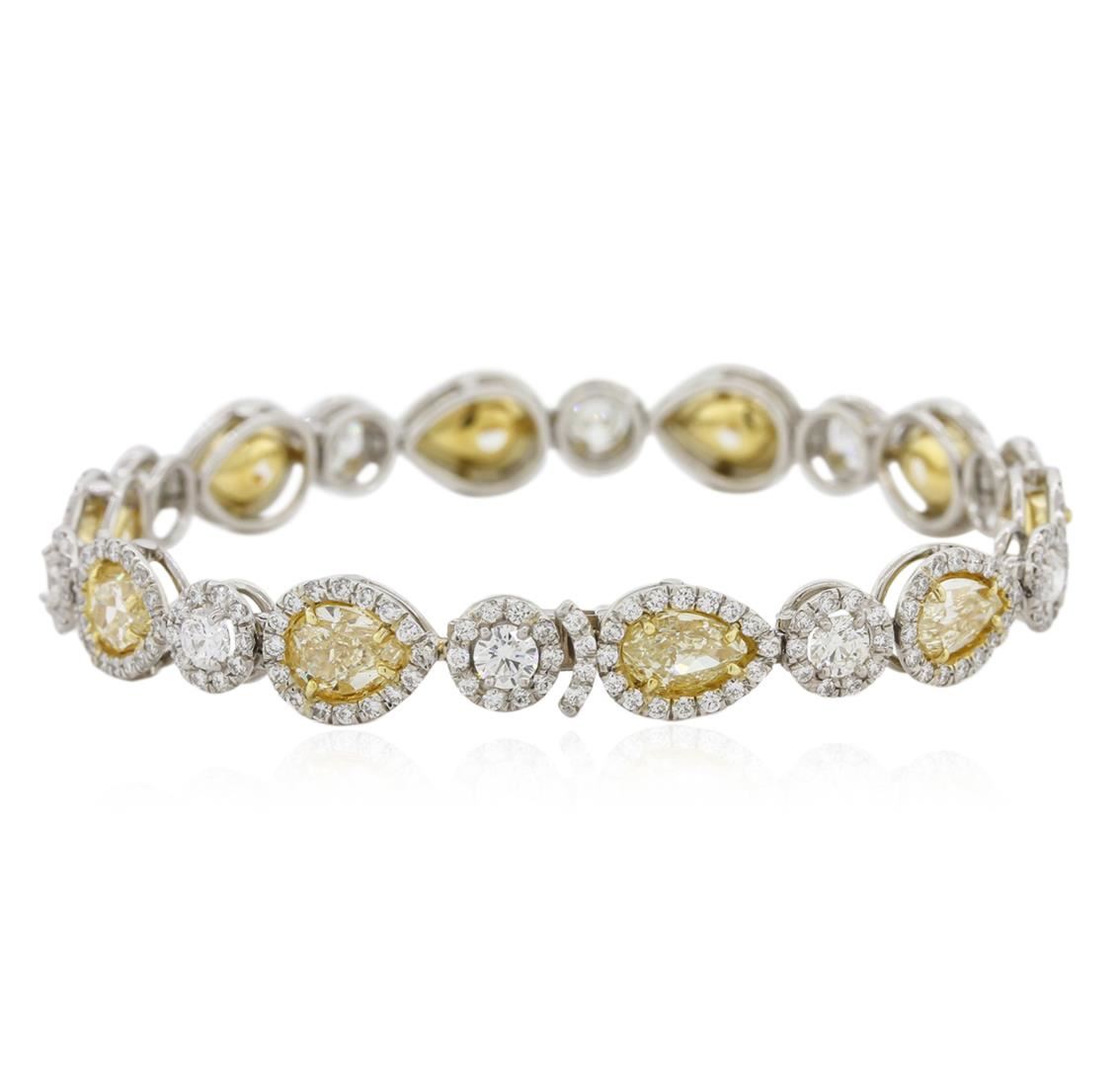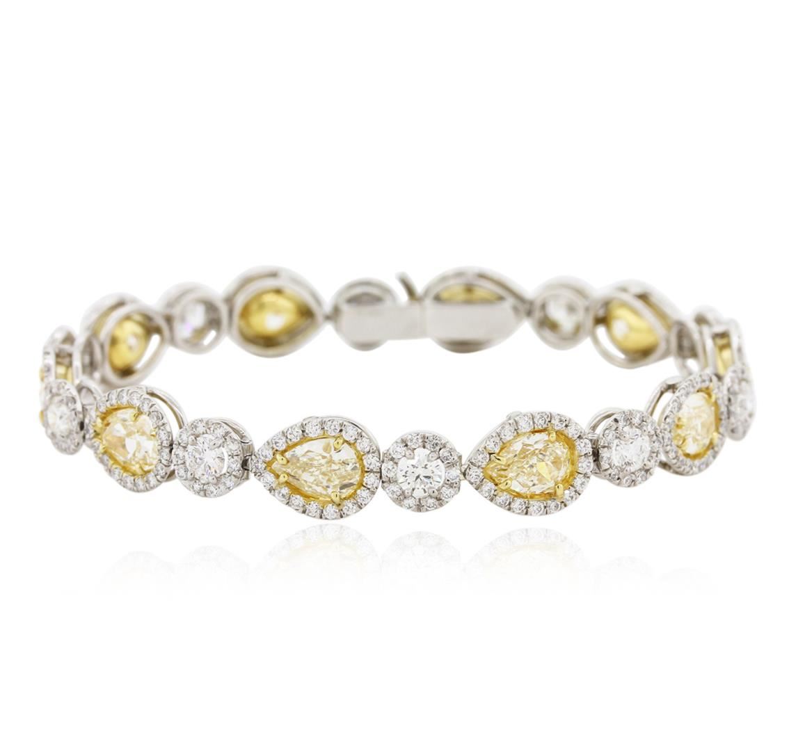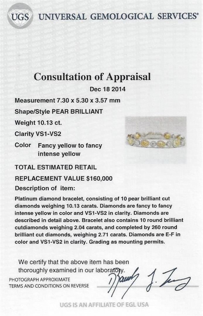Platinum diamond bracelet, consisting of 10 pear brilliant cut diamonds weighing 10.13 carats. Diamonds are fancy to fancy intense yellow in color and VS1-VS2 in clarity. Measurements: 7.30 x 5.30 x 3.57 mm. Bracelet also contains 10 round brilliant cut diamonds weighing 2.04 carats, and completed by 260 round brilliant cut diamonds, weighing 2.71 carats. Diamonds are E-F in color and VS1-VS2 in clarity. Grading as mounting permits. EGL USA Appraised.
