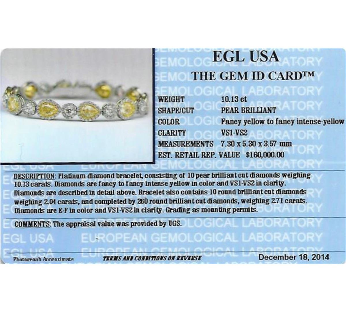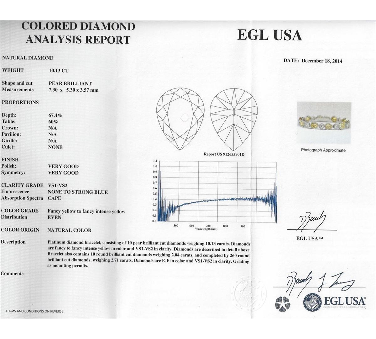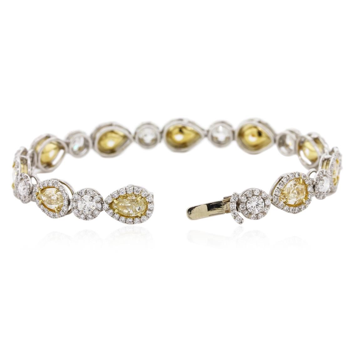 Platinum diamond bracelet, consisting of 10 pear brilliant cut diamonds weighing 10.13 carats. Diamonds are fancy to fancy intense yellow in color and VS1-VS2 in clarity. Measurements: 7.30 x 5.30 x 3.57 mm. Bracelet also contains 10 round brilliant cut diamonds weighing 2.04 carats, and completed by 260 round brilliant cut diamonds, weighing 2.71 carats. Diamonds are E-F in color and VS1-VS2 in clarity. Grading as mounting permits. EGL USA Appraised.