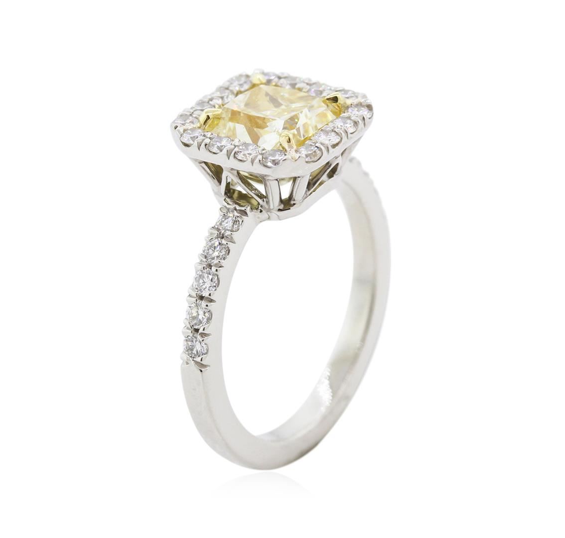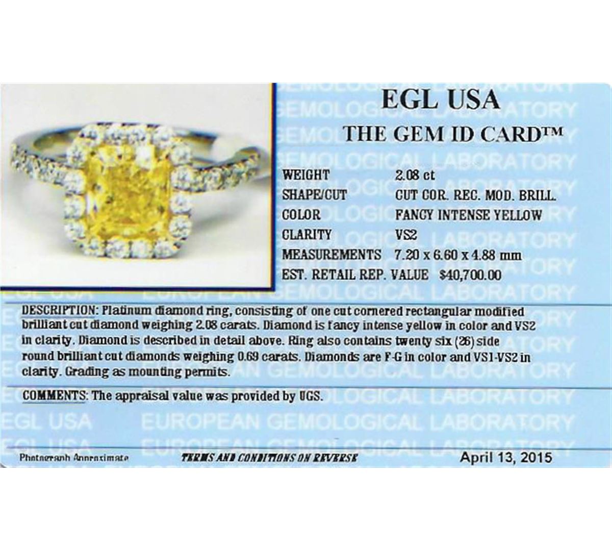 Platinum diamond ring, consisting of one cut cornered rectangular modified brilliant cut diamond weighing 2.08 carats. Diamond is fancy intense yellow in color and VS2 in clarity. Measurements: 7.20 x 6.60 x 4.88 mm. Ring also contains twenty six (26) side round brilliant cut diamonds weighing 0.69 carats. Diamonds are F-G in color and VS1-VS2 in clarity. Grading as mounting permits. EGL USA Appraised.