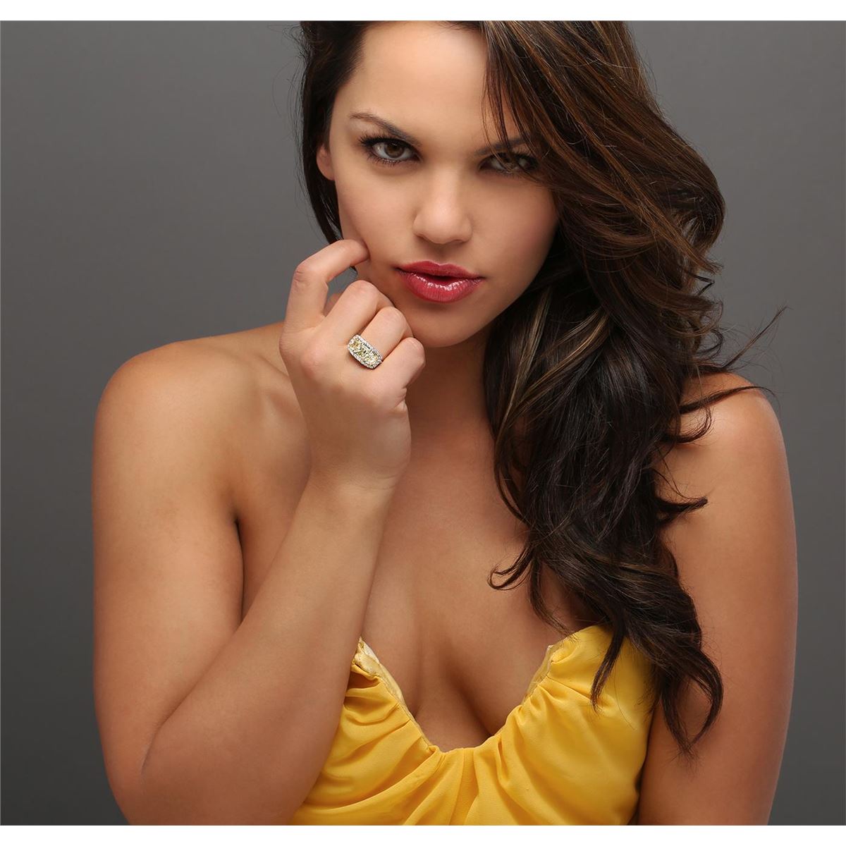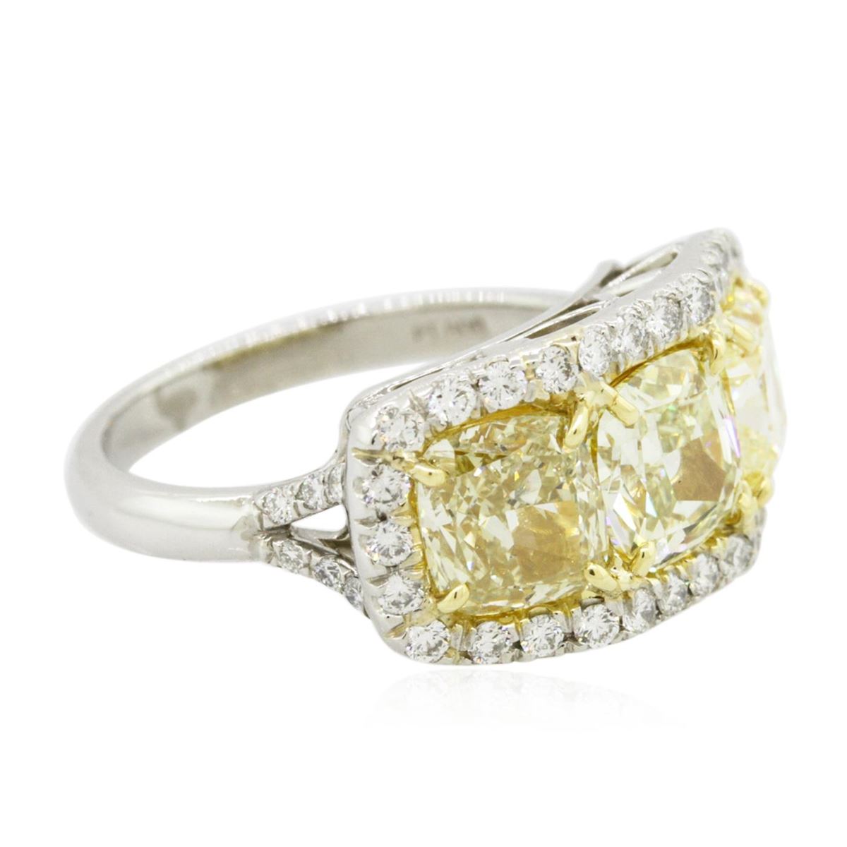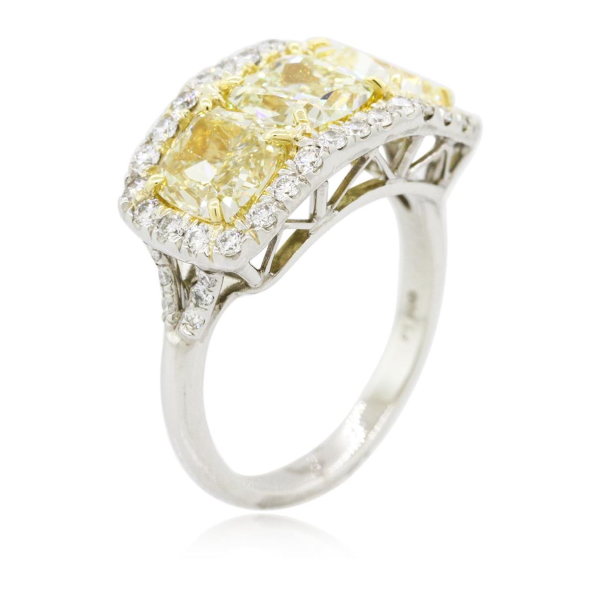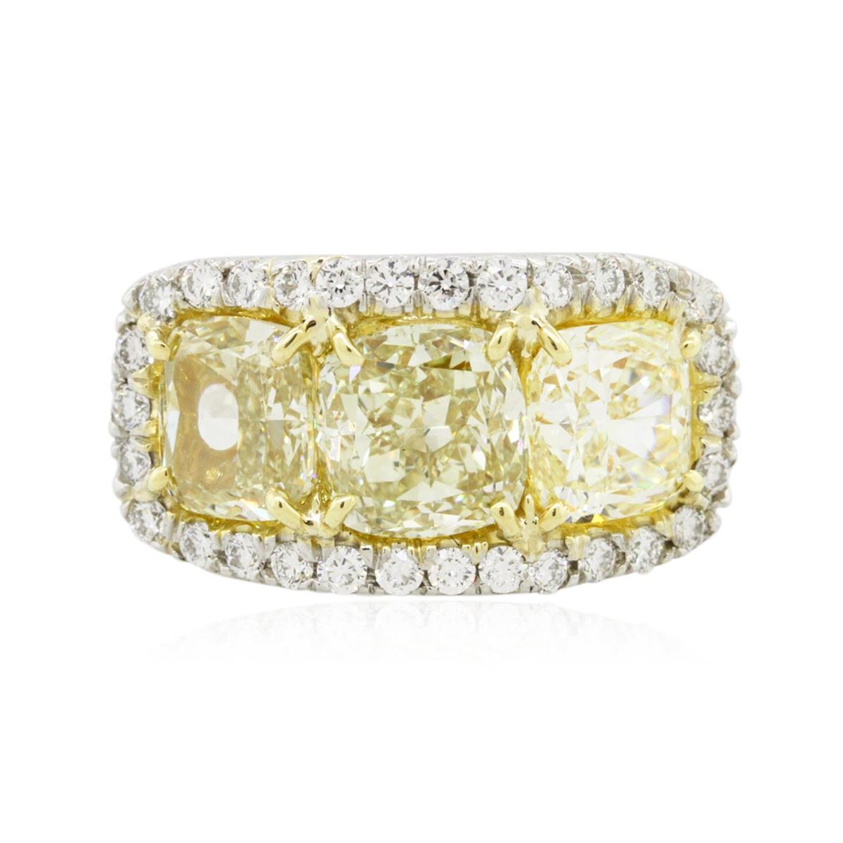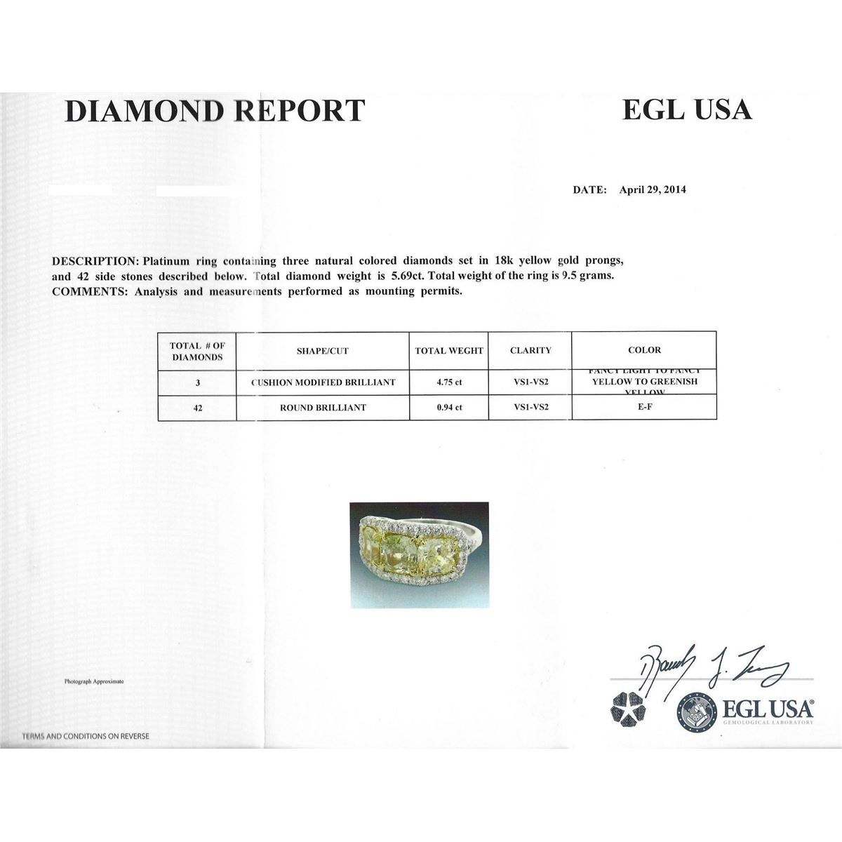 One electronically tested platinum ladies cast diamond ring with a bright polish finish. The ring features a diamond trio set within inner yellow gold baskets and an outer diamond set bezel supported by diamond set split shoulders, completed by a two and one-half millimeter wide band. Identified with markings of "PT900". Condition is new, good workmanship. Containing: Three prong set cushion cut diamonds approximate total weight of 3 Stones = 4.75ct. EGL Report attached. Graded in the EGL Laboratory Report #US 68877404J. Clarity VS-1 to VS-2. Color: Fancy Light to Fancy Yellow to Greenish Yellow. Forty-Two prong set round brilliant cut diamonds approximate total weight of 42 Stones = 0.94ct. EGL Report attached. Graded in the EGL Laboratory Report #US 68877404J. Clarity: VS-1 to VS-2. Color: E - F. Total Weight of Diamonds 5.69ct. Total Weight of Ring 9.48 grams. AIG Appraised at $48,135.00.