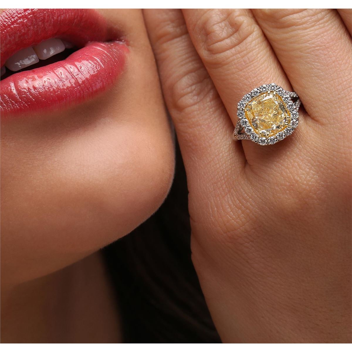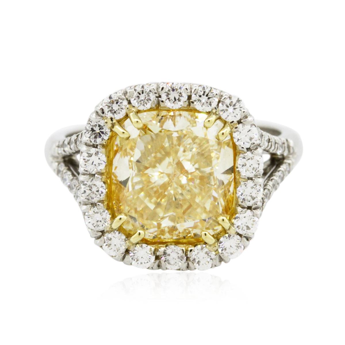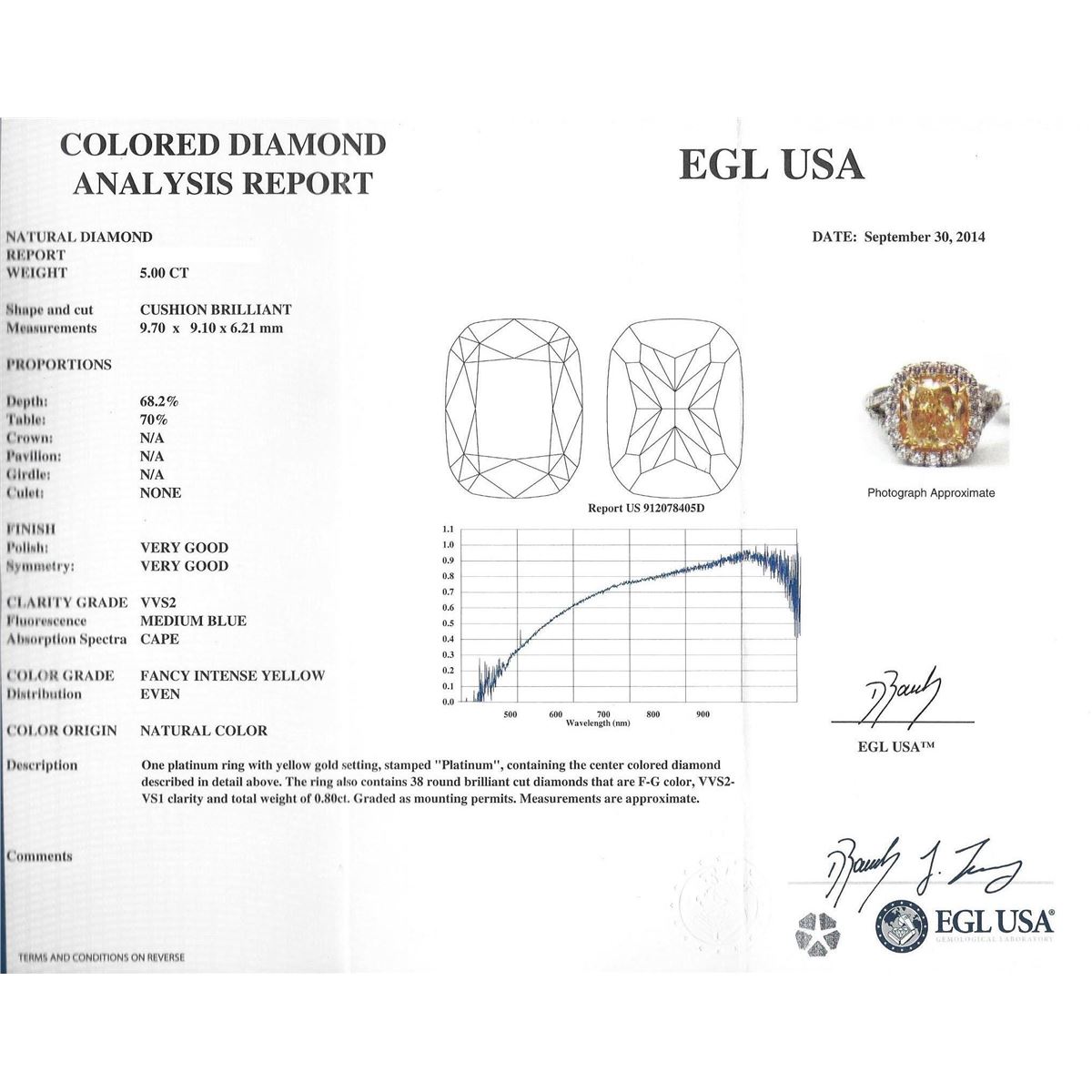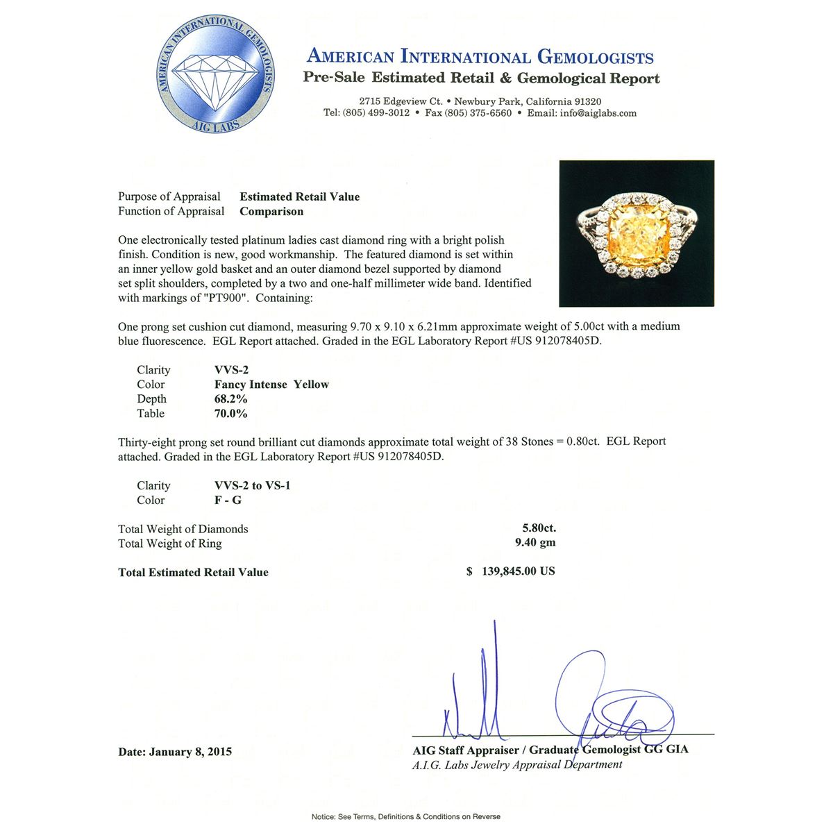 One electronically tested platinum ladies cast diamond ring with a bright polish finish. The featured diamond is set within an inner yellow gold basket and an outer diamond bezel supported by diamond set split shoulders, completed by a two and one-half millimeter wide band. Identified with markings of "PT900". Condition is new, good workmanship. Containing: One prong set cushion cut diamond, measuring 9.70 x 9.10 x 6.21mm approximate weight of 5.00ct with a medium blue fluorescence. EGL Report attached. Graded in the EGL Laboratory Report #US 912078405D. Clarity: VVS-2. Depth: 68.2%. Table 70.0%. Thirty-Eight prong set round brilliant cut diamonds approximate total weight of 38 Stones = 0.80ct. EGL Report attached. Graded in the EGL Laboratory Report #US 912078405D. Clarity: VVS-2 to VS-1. Color: F - G. Total Weight of Diamonds 5.80ct. Total Weight of Ring 9.40 grams. AIG Appraised at $139,845.00.
