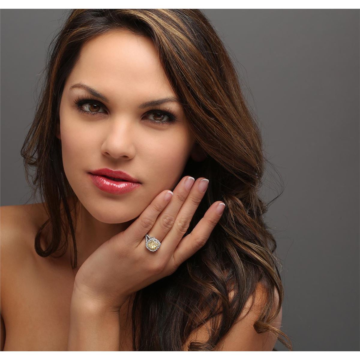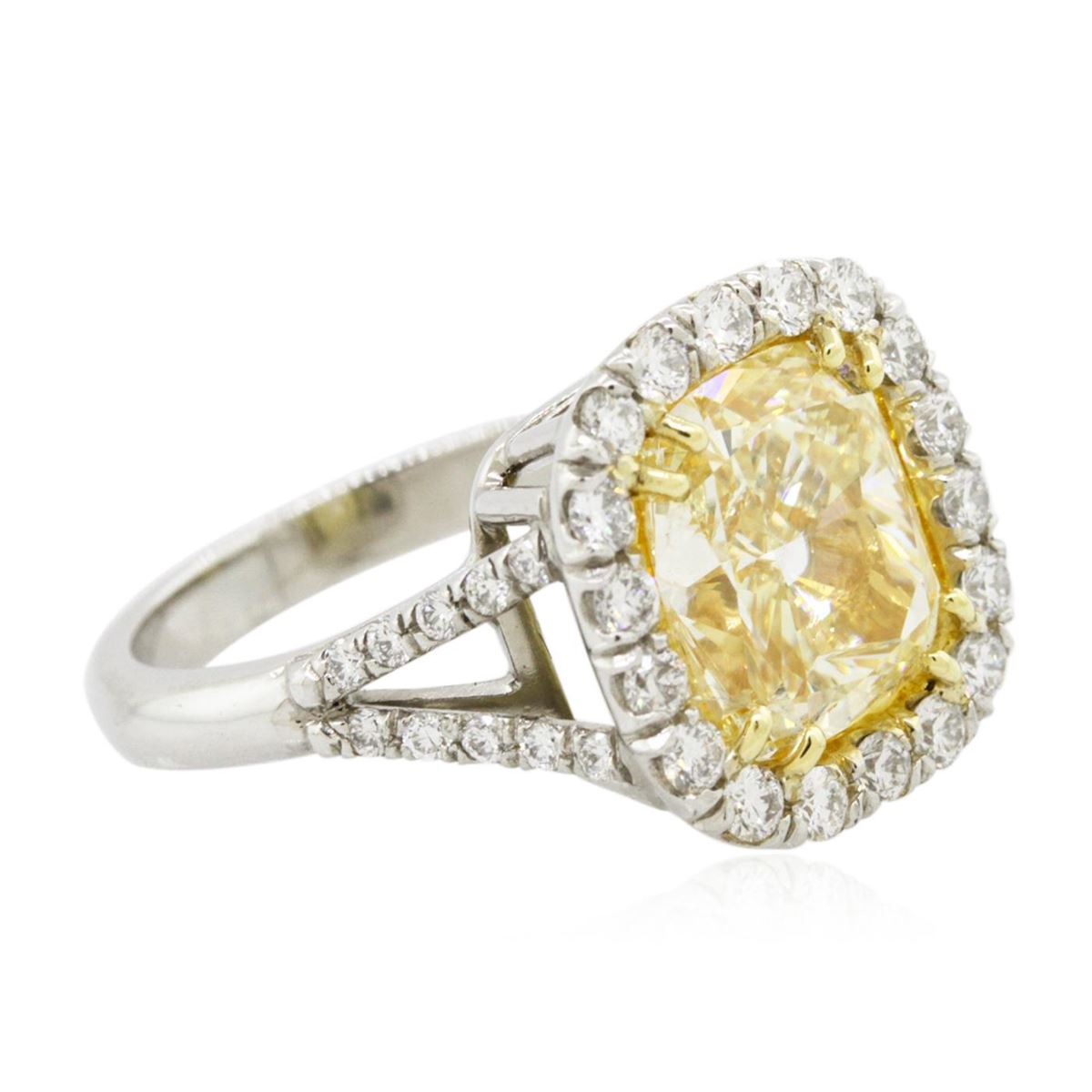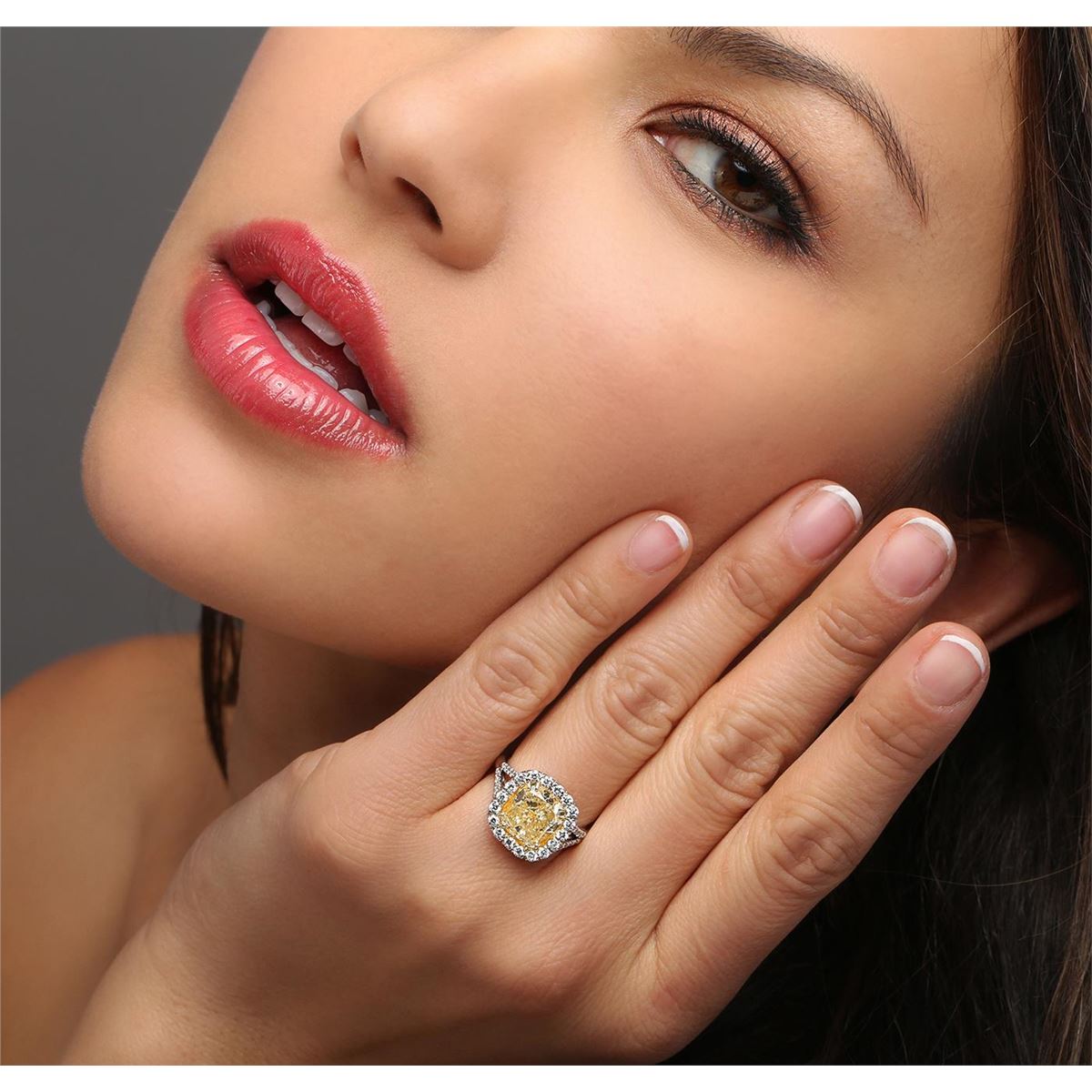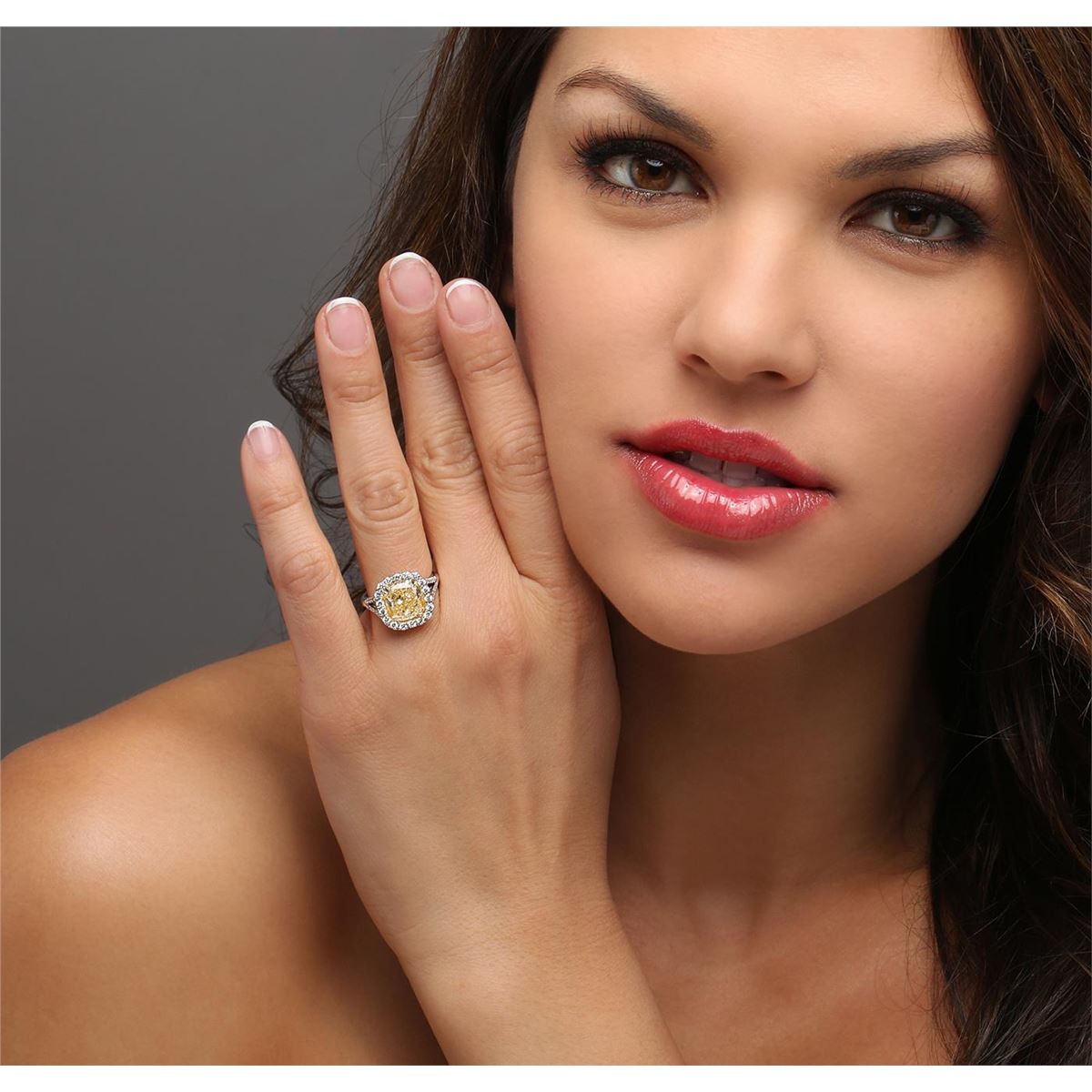 One electronically tested platinum ladies cast diamond ring with a bright polish finish. The featured diamond is set within an inner yellow gold basket and an outer diamond bezel supported by diamond set split shoulders, completed by a two and one-half millimeter wide band. Identified with markings of "PT900". Condition is new, good workmanship. Containing: One prong set cushion cut diamond, measuring 9.70 x 9.10 x 6.21mm approximate weight of 5.00ct with a medium blue fluorescence. EGL Report attached. Graded in the EGL Laboratory Report #US 912078405D. Clarity: VVS-2. Depth: 68.2%. Table 70.0%. Thirty-Eight prong set round brilliant cut diamonds approximate total weight of 38 Stones = 0.80ct. EGL Report attached. Graded in the EGL Laboratory Report #US 912078405D. Clarity: VVS-2 to VS-1. Color: F - G. Total Weight of Diamonds 5.80ct. Total Weight of Ring 9.40 grams. AIG Appraised at $139,845.00.