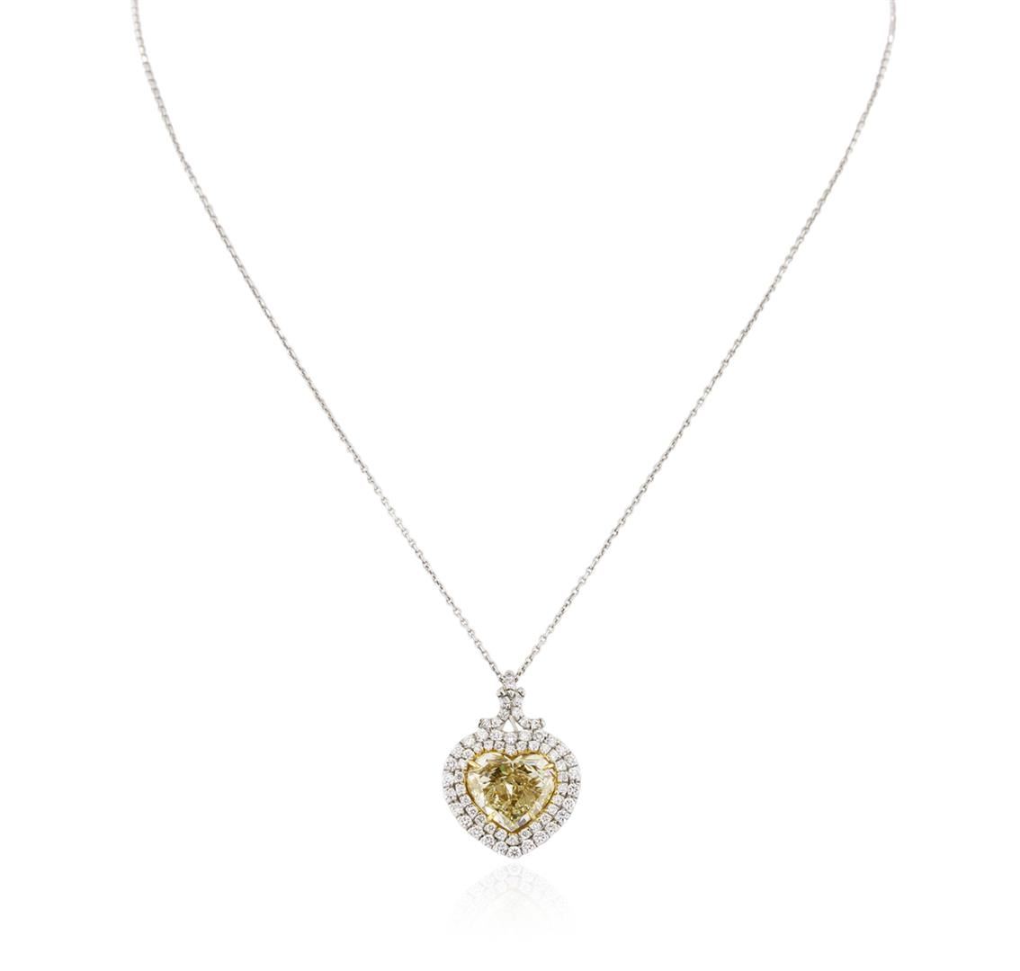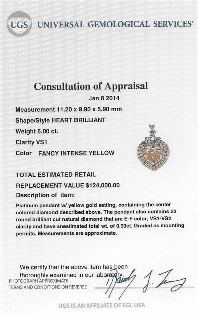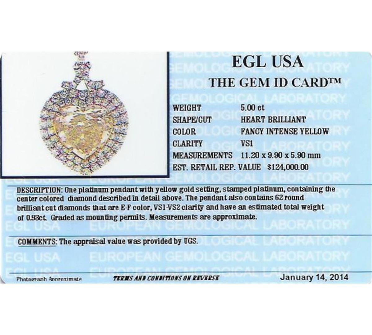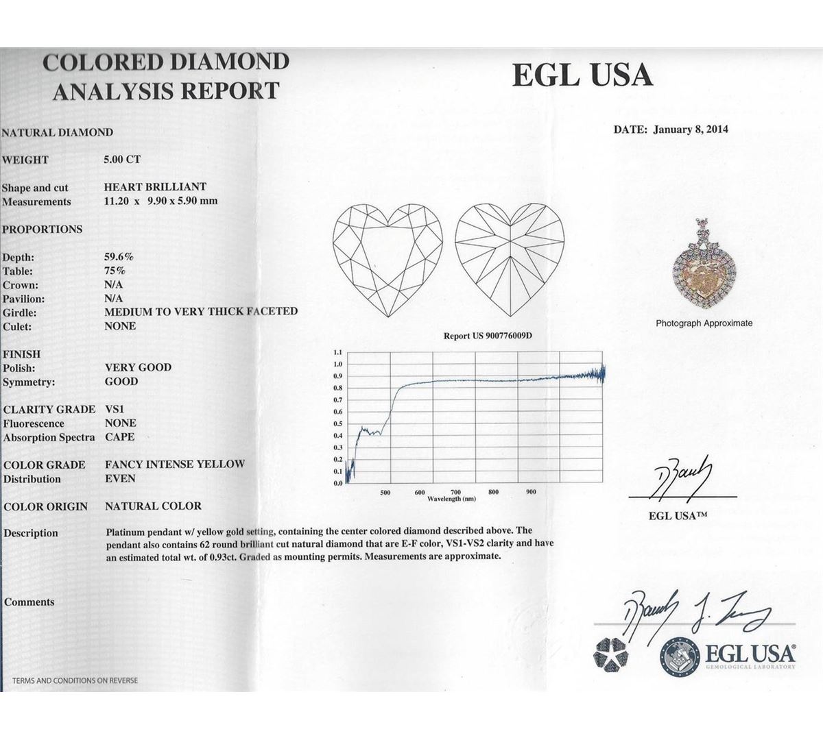 One platinum pendant with yellow gold setting, stamped platinum, containing the center colored diamond. Weight: 5.00 ct. Shape/Cut: Heart Brilliant. Color: Fancy Intense Yellow. Clarity: VS1. Measurements: 11.20 x 9.90 x 5.90 mm. The pendant also contains 62 round brilliant cut diamonds that are E-F color, VS1-VS2 clarity and have an estimated total weight of 0.93ct. Graded as mounting permits. Measurements are approximate. EGL USA Appraised.