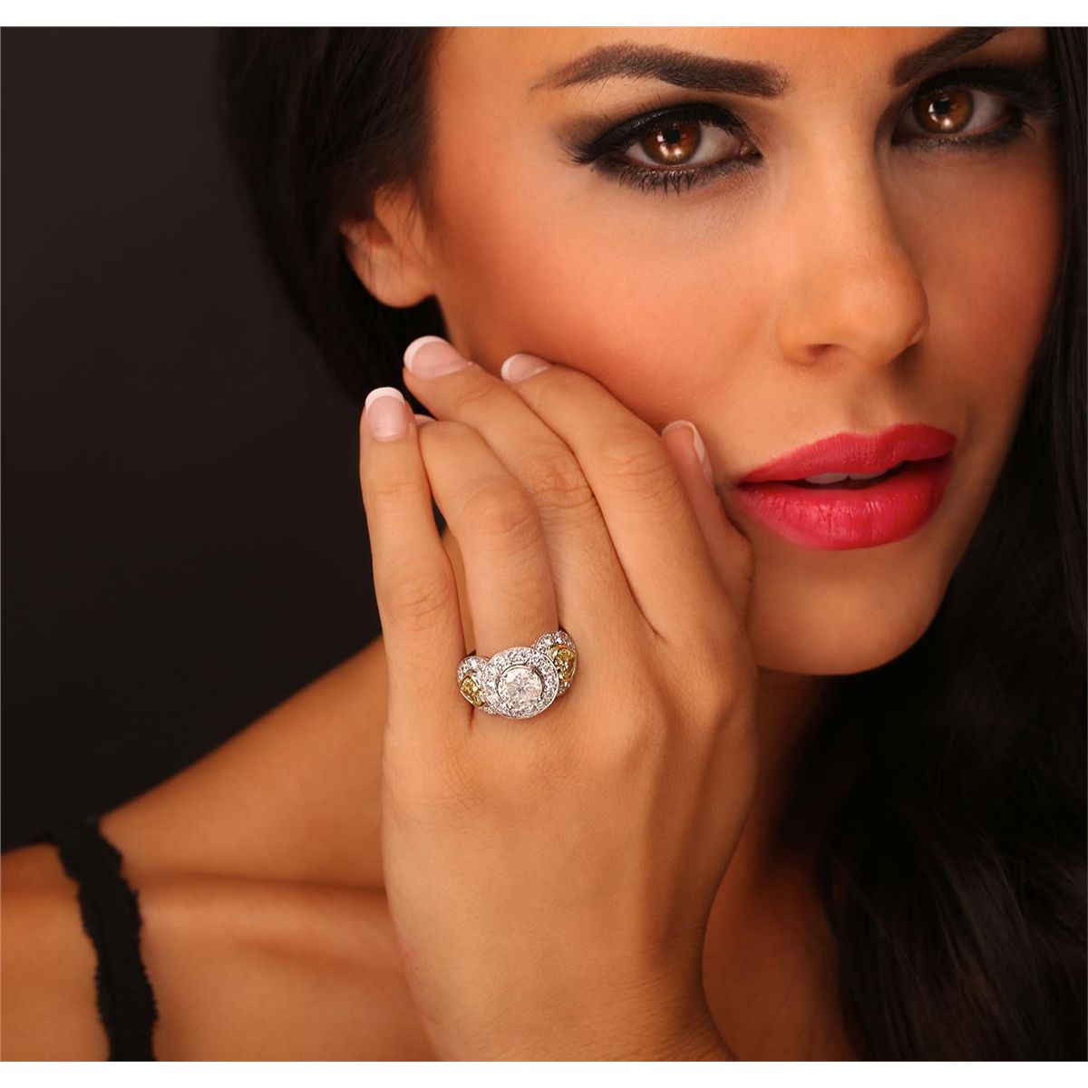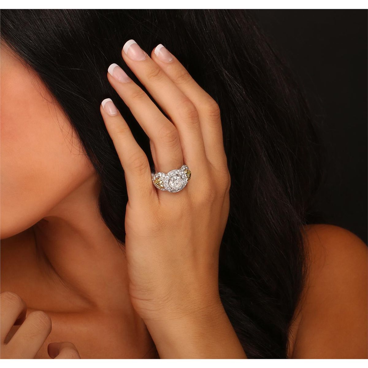 One electronically tested 18KT-platinum white and yellow gold Ladies combination cast & assembled engagement ring with a bright polish finish. Condition is new. Identified with markings of "PT18K". Containing: One prong set round brilliant cut diamond, measuring 8.40 - 8.30 x 5.05mm (depth est.) approximate weight of 2.15ct. Clarity: I-2. Color: I, Cut is Good. Forty-Nine prong set round brilliant cut diamonds, measuring 2.40 - 1.90 x 1.29mm (depth est.) approximate. Total Weight of 49 Stones = 1.78ct. Clarity: SI-1 to SI-2. Color: H - I, Cut is Good. Two bezel set heart shaped cut diamonds, measuring 6.00 x 5.00 x 3.45mm (depth est.) approximate. Total Weight of 2 Stones = 1.22ct. Clarity: SI-1, Cut is Good. Total Weight of Diamonds 5.15ct. Total Weight of Engagement Ring 11.10 grams. GGL Appraised at $40,935.00.