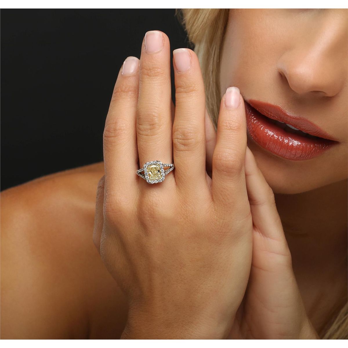 One electronically tested platinum and 18KT yellow gold ladies cast diamond ring with a bright polish finish. The featured diamond is set within an 18KT yellow gold basket and placed within a diamond bezel supported by diamond set split shoulders, completed by a two and one-half millimeter wide band. Identified with markings of "PT900". Condition is new, good workmanship. Containing: One prong set radiant shaped cut diamond, measuring 7.20 x 5.70 x 3.99mm, 6.00.%. GTCF approximate weight of 1.52ct with a strong blue fluorescence. EGL Report attached. Graded in the EGL Laboratory Report #US 69034404D. Clarity: SI-2. Depth: 70.0%. Table 68.0%. Thirty-Six prong set round brilliant cut diamonds, measuring 1.60 - 1.30 x 0.87mm (depth est.) approximate total weight of 36 Stones = 0.64ct. EGL Report attached. Graded in the EGL Laboratory Report #US 69034404D. Clarity: VS-1 to VS-2. Color: F - G. Total Weight of Diamonds 2.16ct. Total Weight of Ring 6.70g. AIG Appraised at $18,375.00.