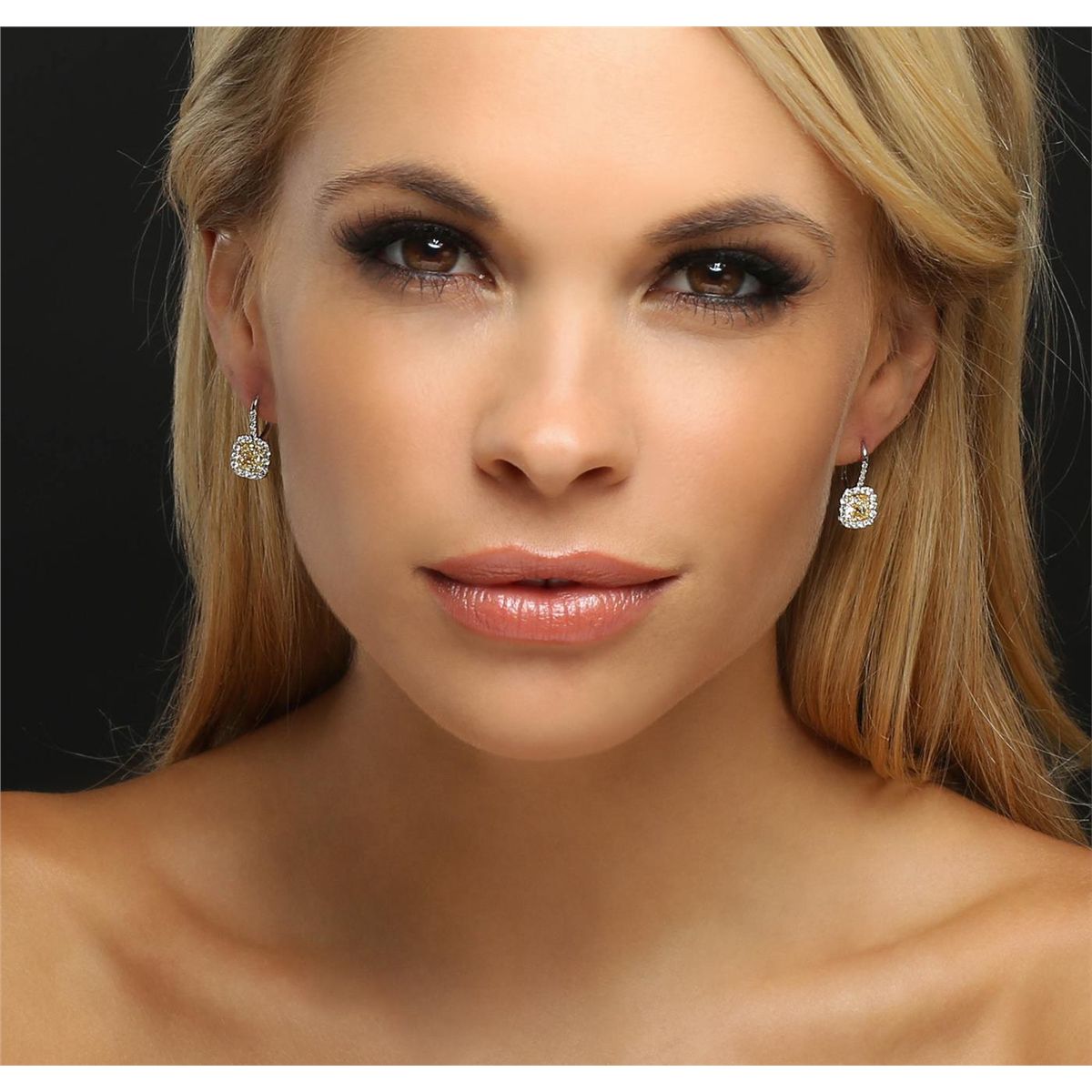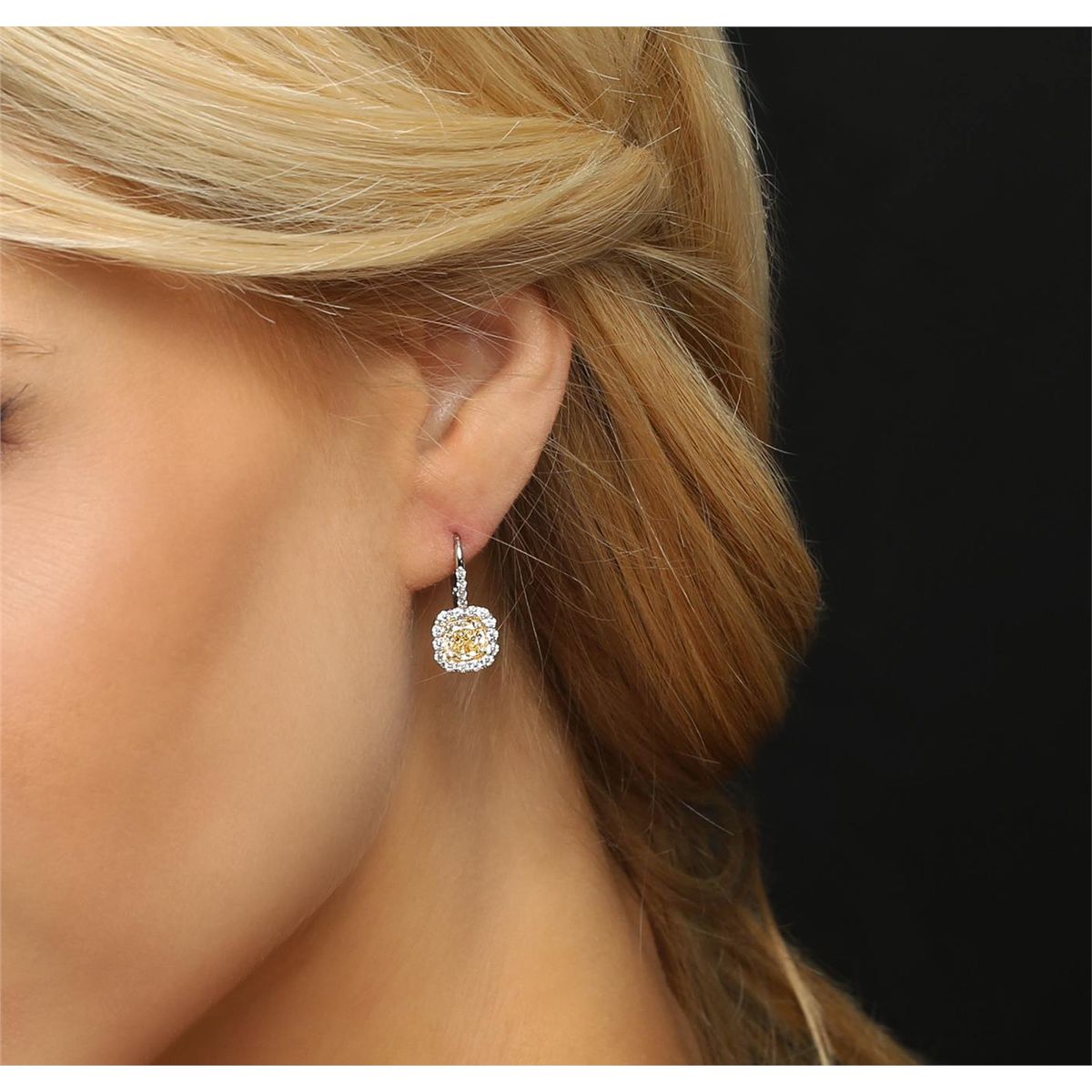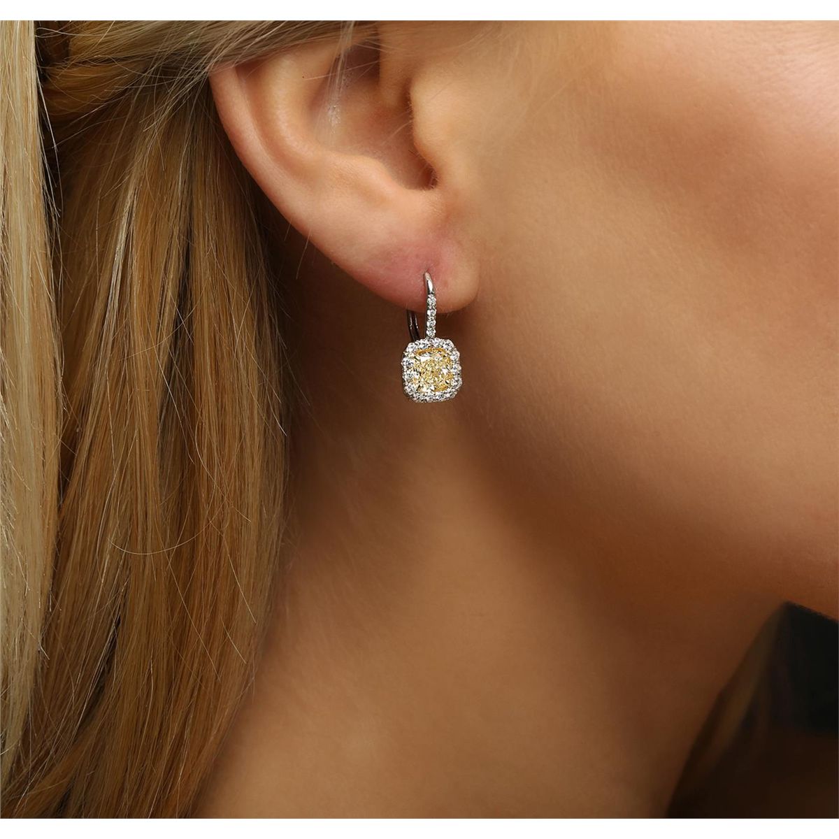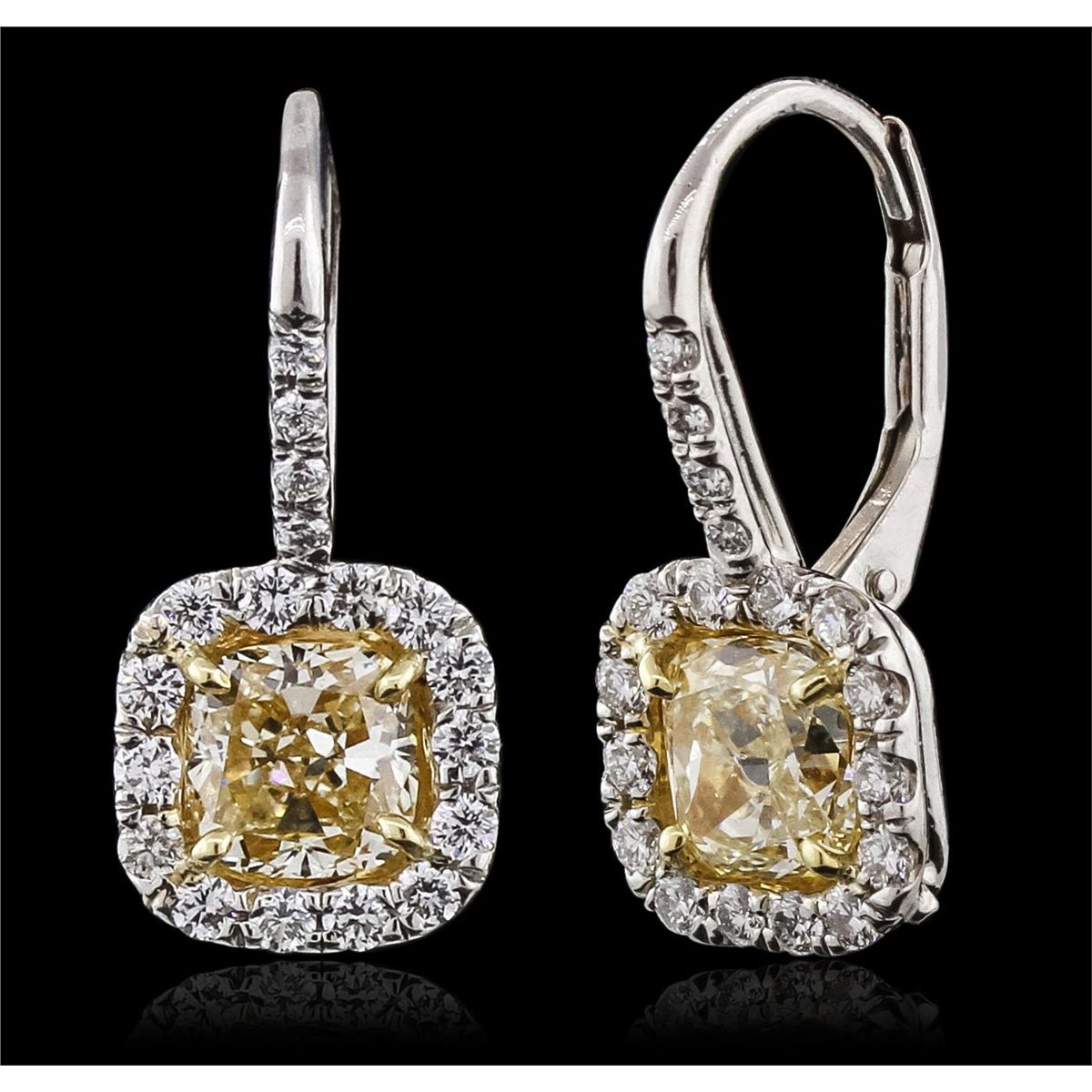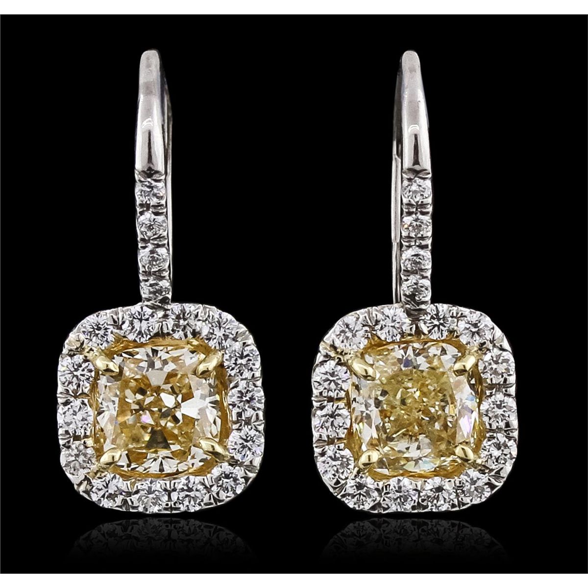 One pair electronically tested platinum and 18KT yellow gold ladies cast & assembled diamond dangle earrings with lever backs. Each earring features a diamond set within an 18KT yellow gold basket and placed within a diamond bezel. Bright polish finish. Condition is new, good workmanship. Containing: One prong set cushion cut diamond, measuring 5.70 x 5.50 x 3.66mm approximate weight of 1.04ct with a medium blue fluorescence. EGL Report attached. Graded in the EGL Laboratory Report #US 68877906J. Clarity VS-1. Color: Fancy to Fancy Intense Yellow. Depth: 66.5%. Table: 69.0%. One prong set cushion cut diamond, measuring 5.50 x 5.40 x 3.84mm approximate weight of 1.03ct with a medium blue fluorescence. EGL Report attached. Graded in the EGL Laboratory Report #US 68877906J. Clarity VS-1. Color: Fancy to Fancy Intense Yellow. Depth: 71.1%. Table: 65.0%. Thirty-Six prong set round brilliant cut diamonds, measuring 1.70 - 1.40 x 0.93mm (depth est.) approximate total weight of 36 Stones = 0.64ct. EGL Report attached. Graded in the EGL Laboratory Report #US 68877906J. Clarity: VS-1 to VS-2. Color: F - G. Total Weight of Diamonds 2.71ct. Total Weight of Earrings 4.41gm. AIG Appraised at $33,255.00.