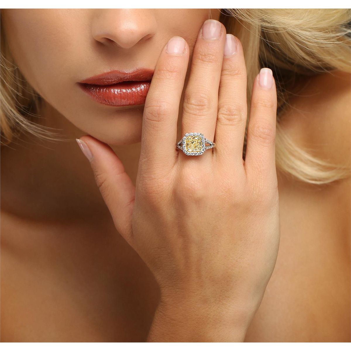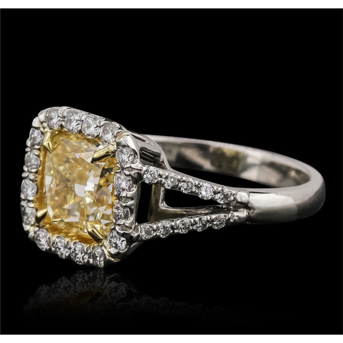 One electronically tested platinum and 18KT yellow gold ladies cast diamond ring with a bright polish finish. The featured diamond is set within an 18KT yellow gold basket and placed within a diamond bezel supported by diamond set split shoulders, completed by a two and one-half millimeter wide band. Identified with markings of "PT900". Condition is new, good workmanship. Containing: One prong set cushion cut diamond, measuring 7.50 x 7.40 x 5.63mm, 6.00.%. GTCF approximate weight of 3.05ct with a faint blue fluorescence. EGL Report attached. Graded in the EGL Laboratory Report #US 911726003D. Clarity: VS-1. Depth: 76.1%. Table 70.0%. Thirty-Six prong set round brilliant cut diamonds, measuring 1.60 - 1.30 x 0.87mm (depth est.) approximate total weight of 36 Stones = 0.52ct. EGL Report attached. Graded in the EGL Laboratory Report #US 911726003D. Clarity: VS-1 to VS-2. Color: F - G. Total Weight of Diamonds 3.57ct. Total Weight of Ring 7.52gm. AIGAppraised at $58,610.00.