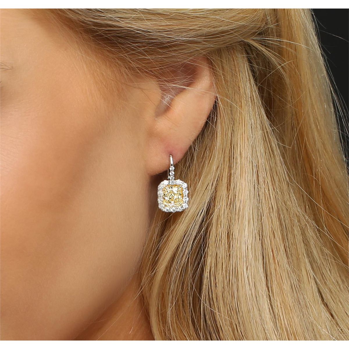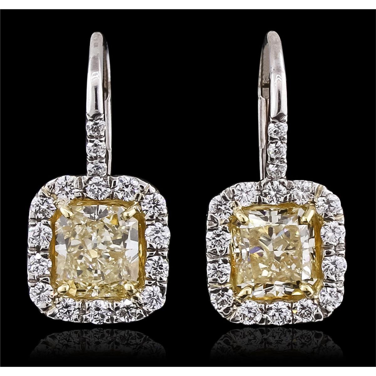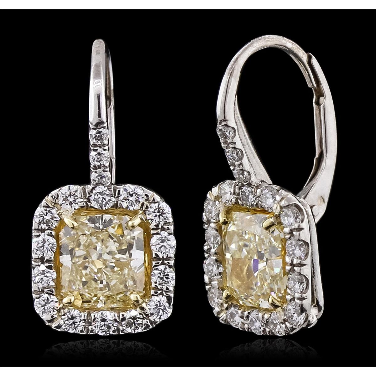 One pair electronically tested platinum and 18KT yellow gold ladies cast & assembled diamond dangle earrings with lever backs. Each earring features a diamond set within an 18KT yellow gold basket and placed within a diamond bezel. Bright polish finish. Condition is new, good workmanship. Containing: Two prong set radiant shaped cut diamonds, measuring 6.45 x 5.80 x 4.08mm approximate total weight of 2 Stones = 3.01ct. EGL Report attached. Graded in the EGL Laboratory Report #US 911762107D. Clarity: VVS-2 to SI-2 Thirty-Four prong set round brilliant cut diamonds, measuring 1.80 - 1.40 x 0.96mm (depth est.) approximate total weight of 34 Stones = 0.78ct. EGL Report attached. Graded in the EGL Laboratory Report #US 911762107D. Clarity: VS-1 to VS-2. Color: E - F. Total Weight of Diamonds 3.79ct. Total Weight of Earrings 5.51gm. AIGAppraised at $42,045.00.