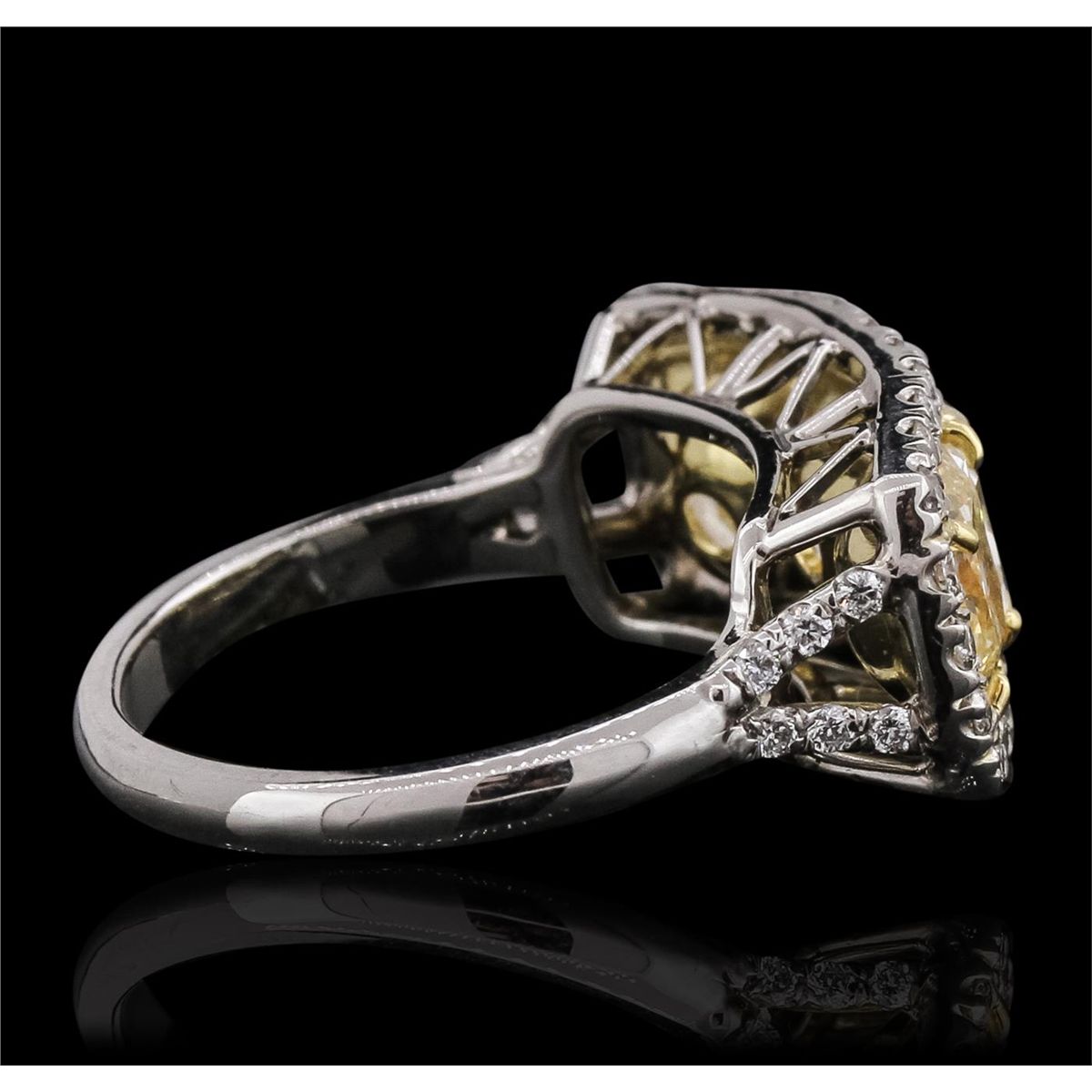 One electronically tested platinum and 18KT yellow gold ladies cast diamond ring with a bright polish finish. The ring features a series of three diamonds set within 18KT yellow gold baskets and placed within a diamond bezel supported by diamond set split shoulders, completed by a two and one-half millimeter wide band. Identified with markings of "PT900". Condition is new, good workmanship. Containing: Three prong set cushion cut diamonds approximate total weight of 3 Stones = 4.55ct. Color grade is an average for the group. EGL Report attached. Graded in the EGL Laboratory Report #US 69034505J. Clarity: VS-2 to SI-1 Forty-Two prong set round brilliant cut diamonds, measuring 1.70 - 1.50 x 0.96mm (depth est.) approximate total weight of 42 Stones = 0.72ct. EGL Report attached. Graded in the EGL Laboratory Report #US 69034505J. Clarity: VS-1 to VS-2. Color: F - G. Total Weight of Diamonds 5.27ct. Total Weight of Ring 9.16gm. AIG Appraised at $56,780.00.