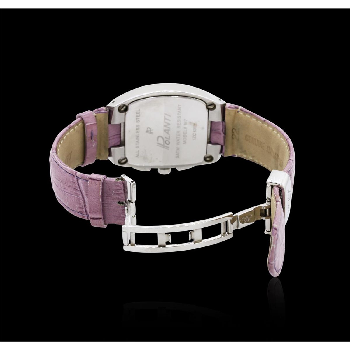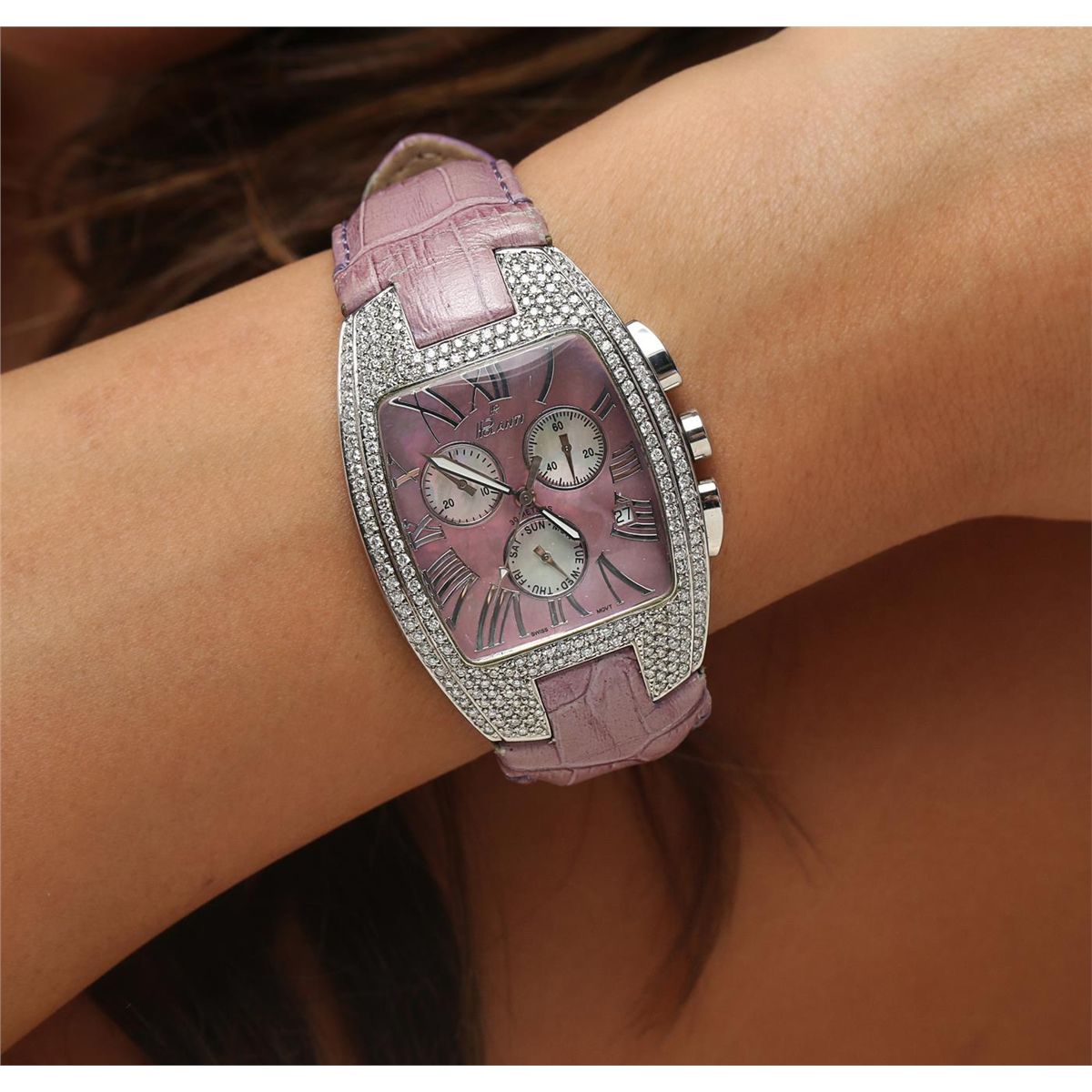 One Polanti wristwatch featuring: Movement: Swiss made quartz with chronograph. Case: Stainless steel set with diamonds. Crystal: Mineral crystal. Dial: Pink color with luminous hour, minute, and second hands; Roman numeral markers. Chronograph functions: three white ringed sub dials for; minutes, days of the week, and continuous seconds. Band: Pink alligator pattern leather. Clasp: Deployment. Water resistant: 5 ATM.