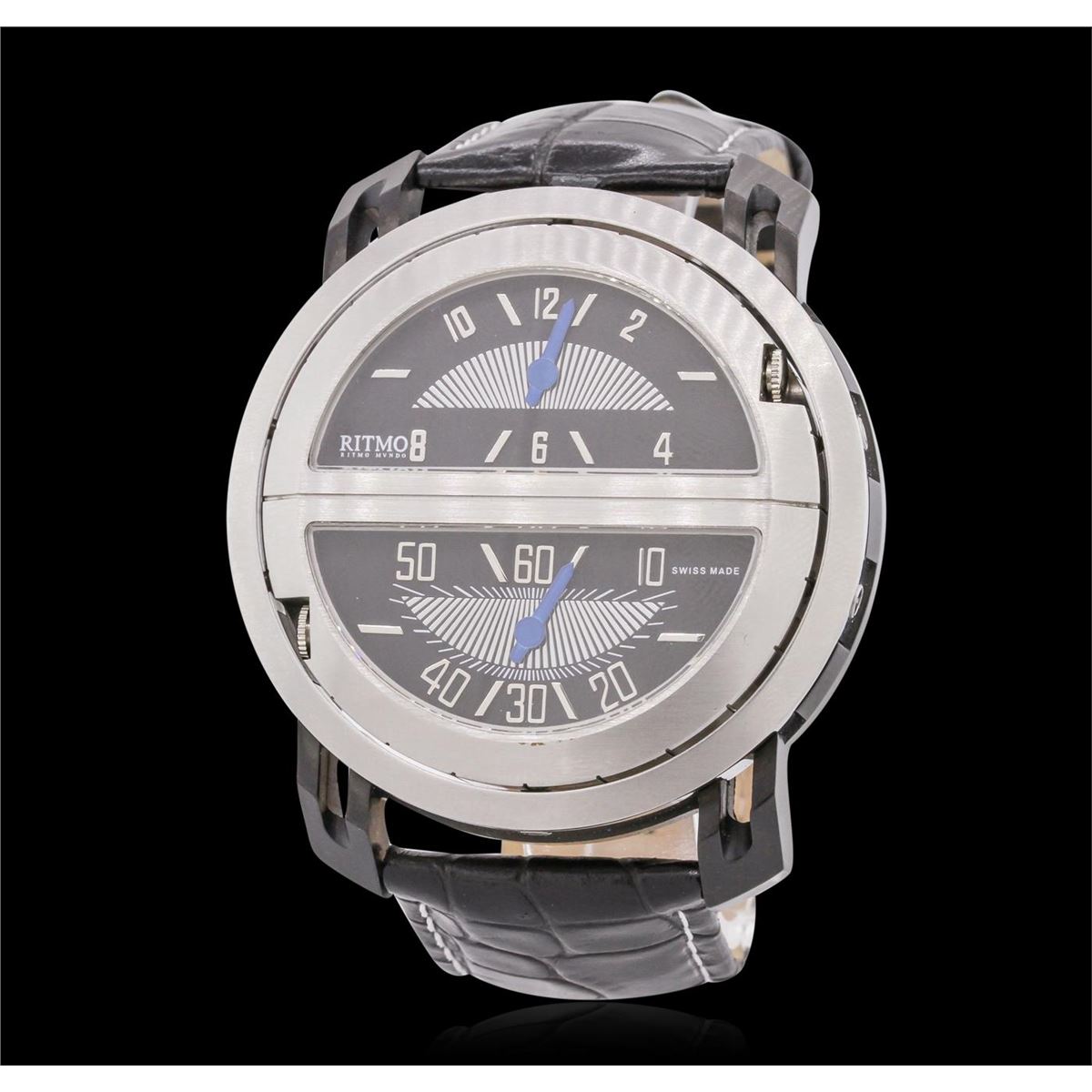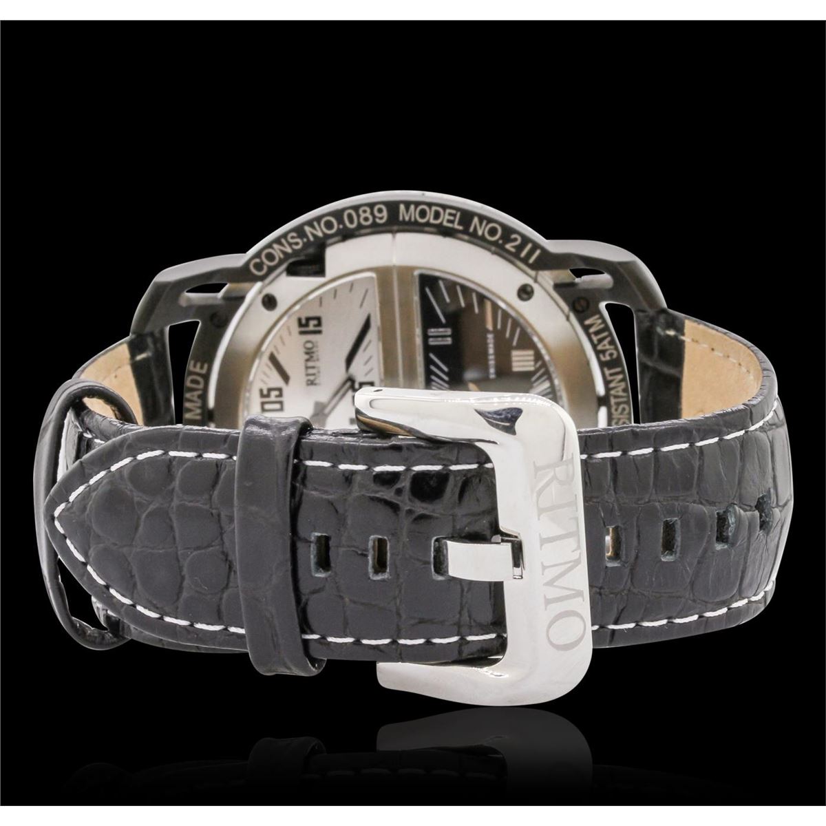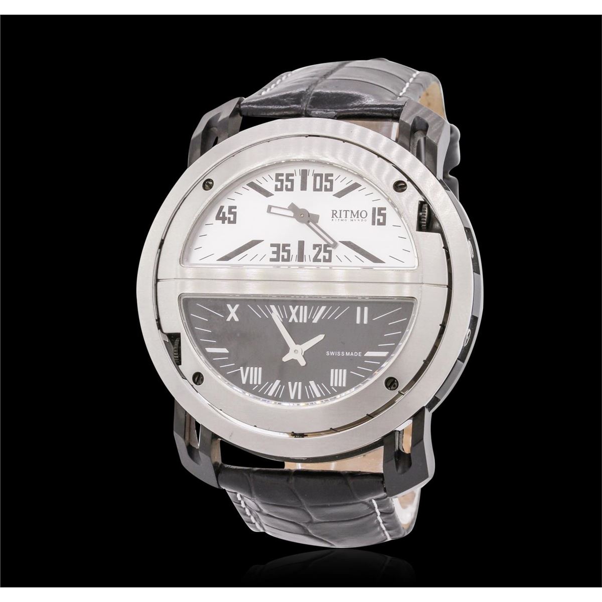 One Ritmo Mundo Persepolis wristwatch featuring: black leather bracelet with white stitching, Stainless Steel case, crown, lugs, and bezel, reversible white and black dial with analog display, Roman and Arabic numerals. This item measures 52mm across, including crown.