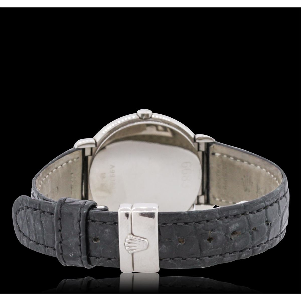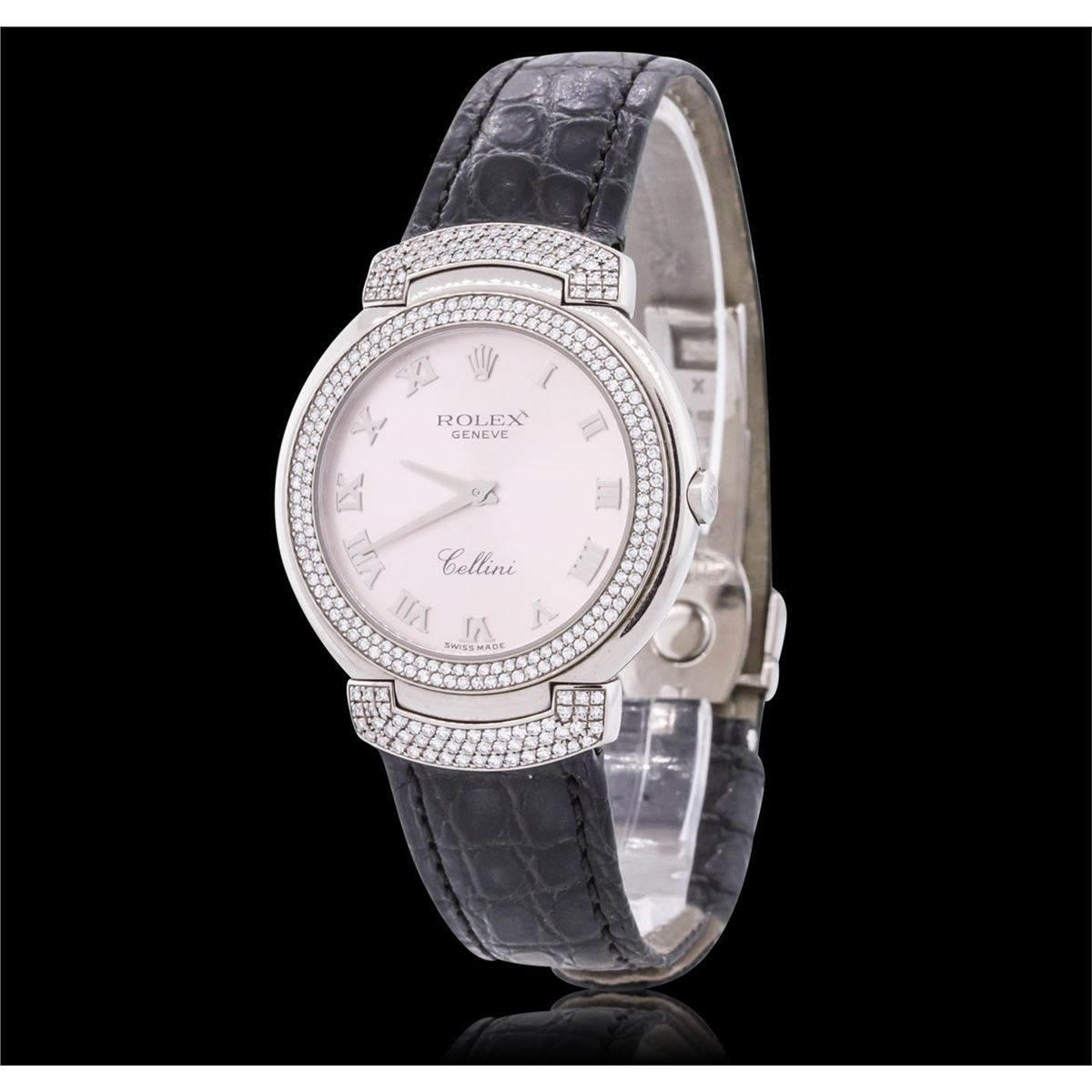 One, Rolex Cellini Cellissima wristwatch, electronically tested 18KT white gold, Case: 33mm diameter, Case Back: engraved with the manufacturers ID numbers, Bezel: diamond set, Logo'd Crown: Crystal: synthetic sapphire, Circa 1999.Movement: quartz, Dial: Pink, with pointed hands and Roman numerals, signed Rolex Cellini, Bracelet: Rolex, saddle stitched crocodile strap, 18KT white gold Buckle: Rolex concealed deployment clasp, Condition: G-5 fine. Seven and one half inch length, adjustable. Containing: Two Hundred Seventy Two single cut diamonds, approximate total weight equals 1.00ct. Set & graded in the bezel, and the case lugs. Clarity VS-1 Average. Color: F - G. Total Weight of Diamonds 1.00ct. Total Weight of Watch 58.40 grams. AIG Appraised at $19,750.00.