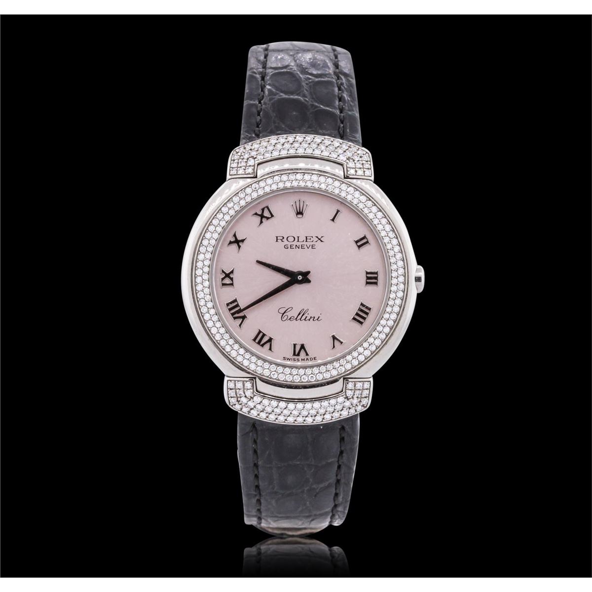 One, Rolex Cellini Cellissima wristwatch, electronically tested 18KT white gold, Case: 33mm diameter, Case Back: engraved with the manufacturers ID numbers, Bezel: diamond set, Logo'd Crown: Crystal: synthetic sapphire, Circa 1999.Movement: quartz, Dial: Pink, with pointed hands and Roman numerals, signed Rolex Cellini, Bracelet: Rolex, saddle stitched crocodile strap, 18KT white gold Buckle: Rolex concealed deployment clasp, Condition: G-5 fine. Seven and one half inch length, adjustable. Containing: Two Hundred Seventy Two single cut diamonds, approximate total weight equals 1.00ct. Set & graded in the bezel, and the case lugs. Clarity VS-1 Average. Color: F - G. Total Weight of Diamonds 1.00ct. Total Weight of Watch 58.40 grams. AIG Appraised at $19,750.00.