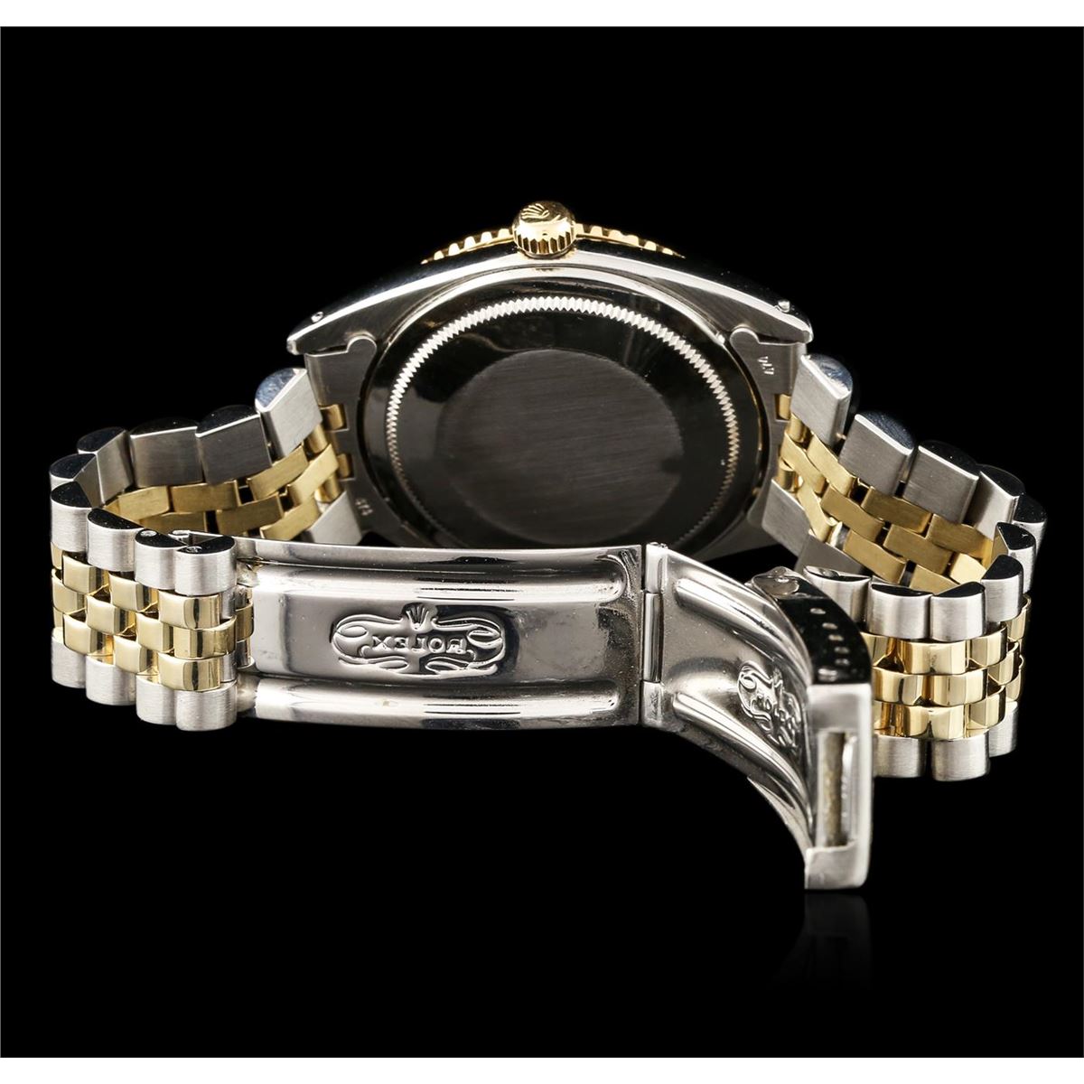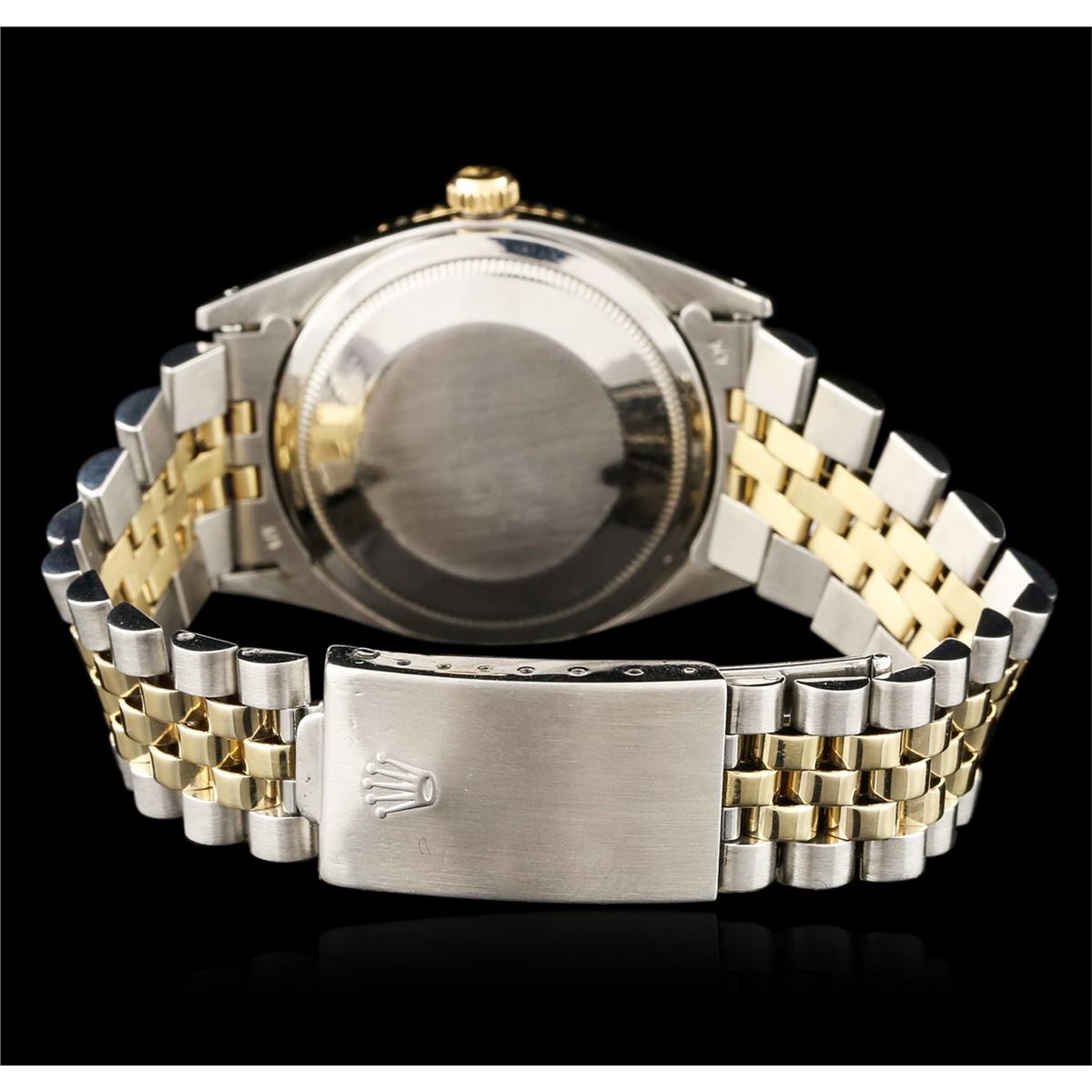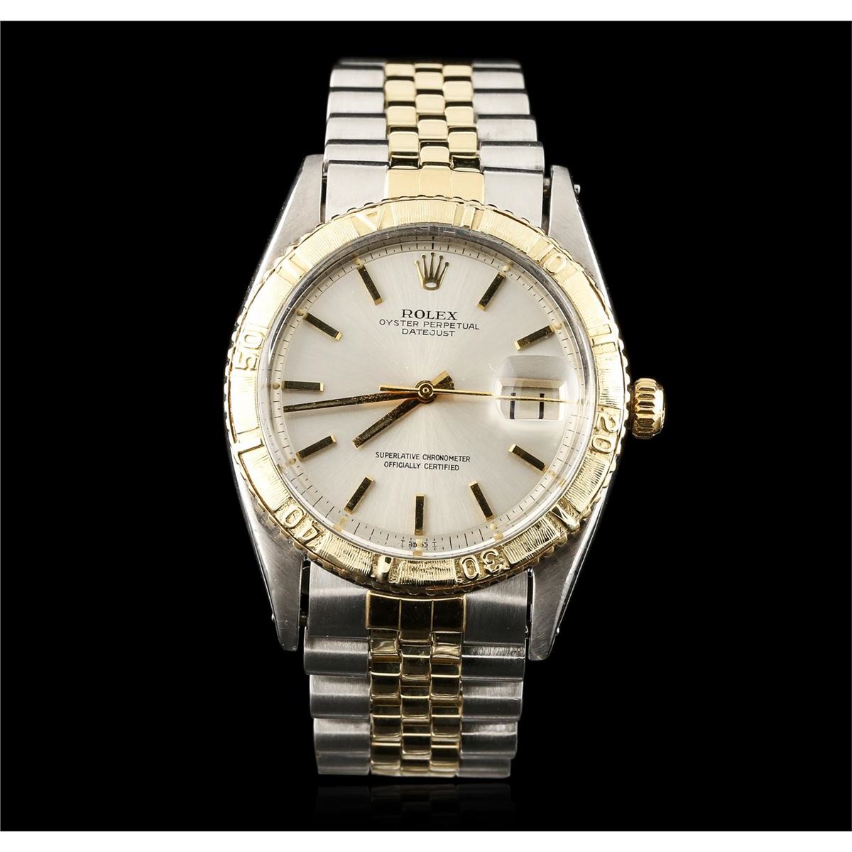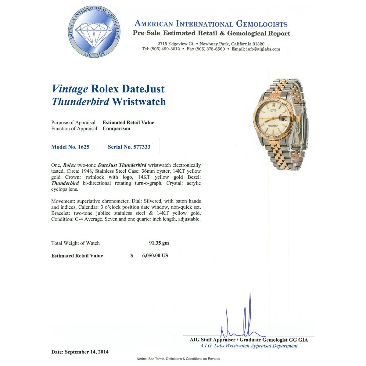 One, Rolex two-tone DateJust Thunderbird wristwatch electronically tested, Circa: 1948, Stainless Steel Case: 36mm oyster, 14KT yellow gold Crown: twinlock with logo, 14KT yellow gold Bezel: Thunderbird bi-directional rotating turn-o-graph, Crystal: acrylic cyclops lens. Movement: superlative chronometer, Dial: Silvered, with baton hands and indices, Calendar: 3 o'clock position date window, non-quick set, Bracelet: two-tone jubilee stainless steel & 14KT yellow gold, Condition: G-4 Average. Seven and one quarter inch length, adjustable. Total Weight of Watch 91.35 grams. AIG Appraised at $6,050.00.