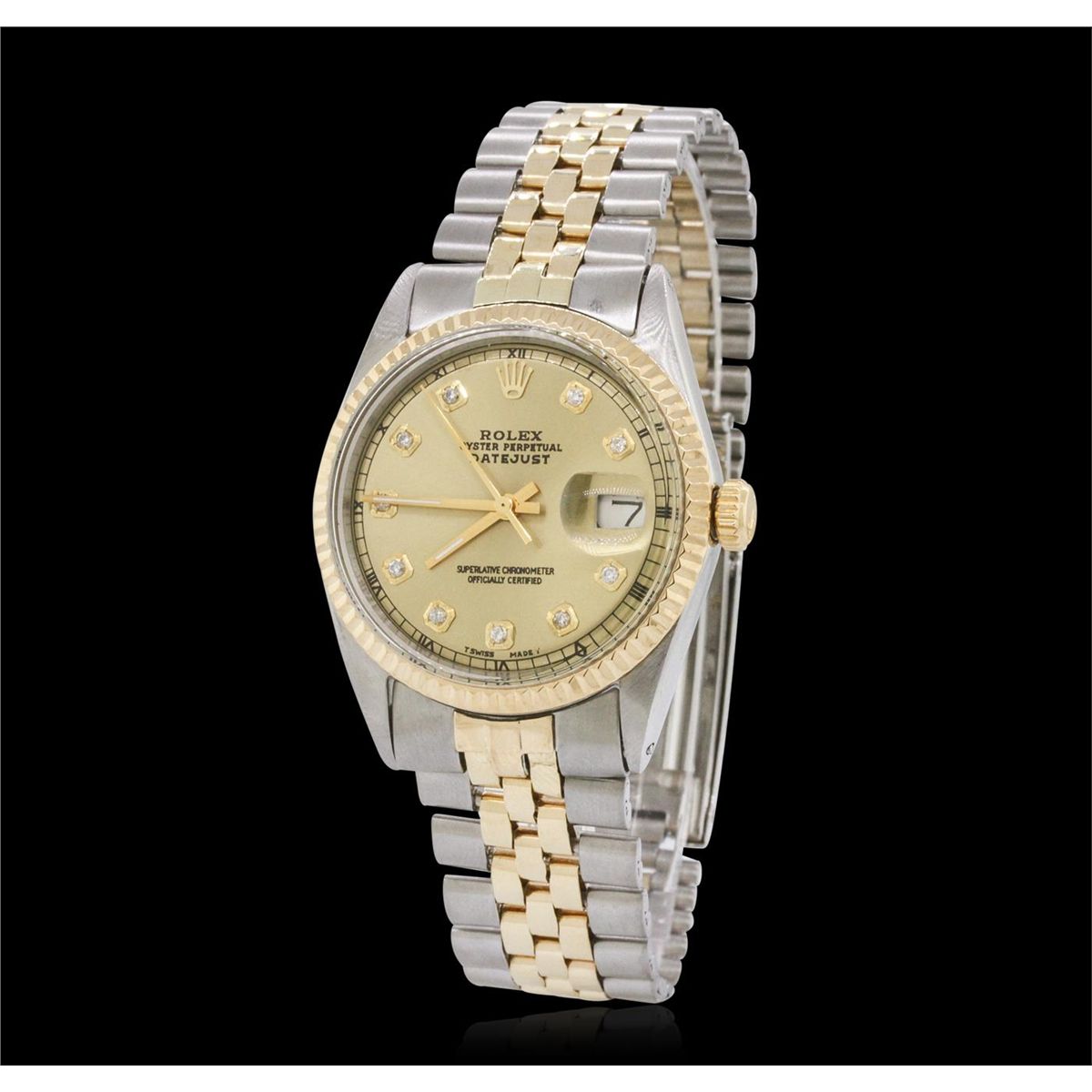 One, hand crafted & machine milled vintage Rolex two-tone DateJust wristwatch electronically tested, Stainless Steel Case: 35mm oyster, 14KT yellow gold Crown: twinlock with logo, 14KT yellow gold Bezel: fluted, Crystal: acrylic cyclops lens, Circa: 1961.Movement: superlative chronometer, Custom Dial: Champagne, with baton hands and diamond markers, Date Window: 3 o'clock position, non-quick set, Custom Bracelet: two-tone 14KT yellow gold & stainless steel jubilee, bright polish & brushed finish, Condition: G-4 Average. Seven and one half inch length, adjustable. Standard clasp, with logo. Total Weight of Watch 83.48 grams. AIG Appraised at $6,650.00.