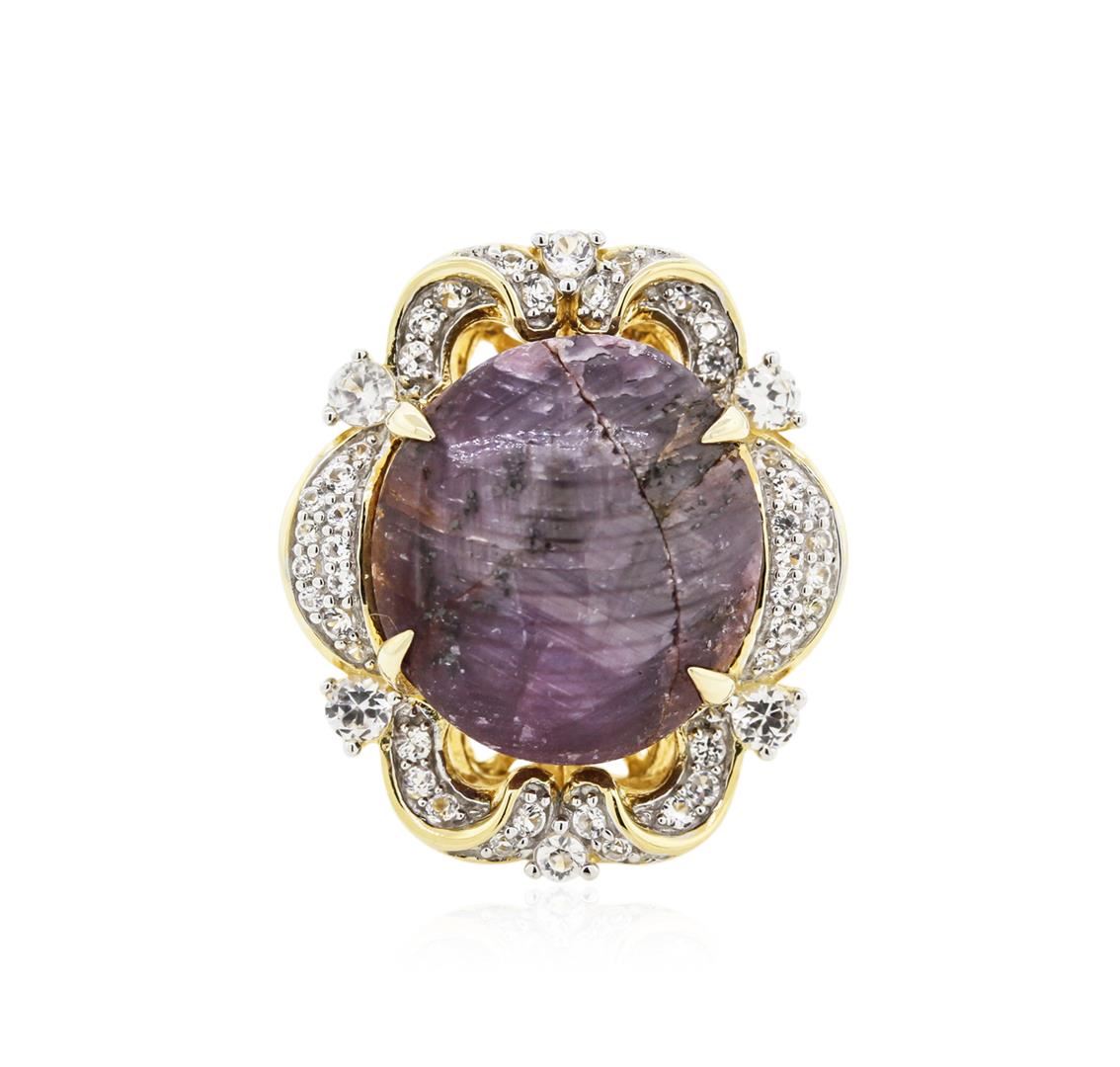One electronically tested 925 silver ladies cast star ruby and white sapphire ring. The ring features a cabochon star ruby set within a multi-tiered (Victorian Period inspired) white sapphire bezel, supported by an elaborate concave under gallery and tapering shoulders, completed by a two and one half millimeter wide band. Bright polish finish with a yellow gold overlay. Trademark is Orianne. Identified with markings of "925". Condition is new, good workmanship. Containing: One prong set oval cabochon cut natural star ruby, measuring 17.00 x 15.60mm, approximate weight of 30.91ct., clarity is severely included, dark, very slightly brownish, strongly purplish red color, (GIA stpR 7/3), cut is good. This stone has a mostly complete six ray star with medium intensity and good movement. Transmitting light very diffusely, opaque. Naturally occurring internal & external characteristics are present. No indications (NTE) of heating. Graded in the setting. Forty-eight prong set round brilliant cut natural white sapphires, measuring 2.70 - 1.20mm, approximate total weight of 1.05ct., clarity is eye clean, medium light, slightly grayish, white color, (GIA W 4/2), cut is good. Graded in the setting. Total Weight of Colored Stones: 31.96 ct. Total Weight of Ring: 12.84 gm. AIG Appraised at $3,750.00.