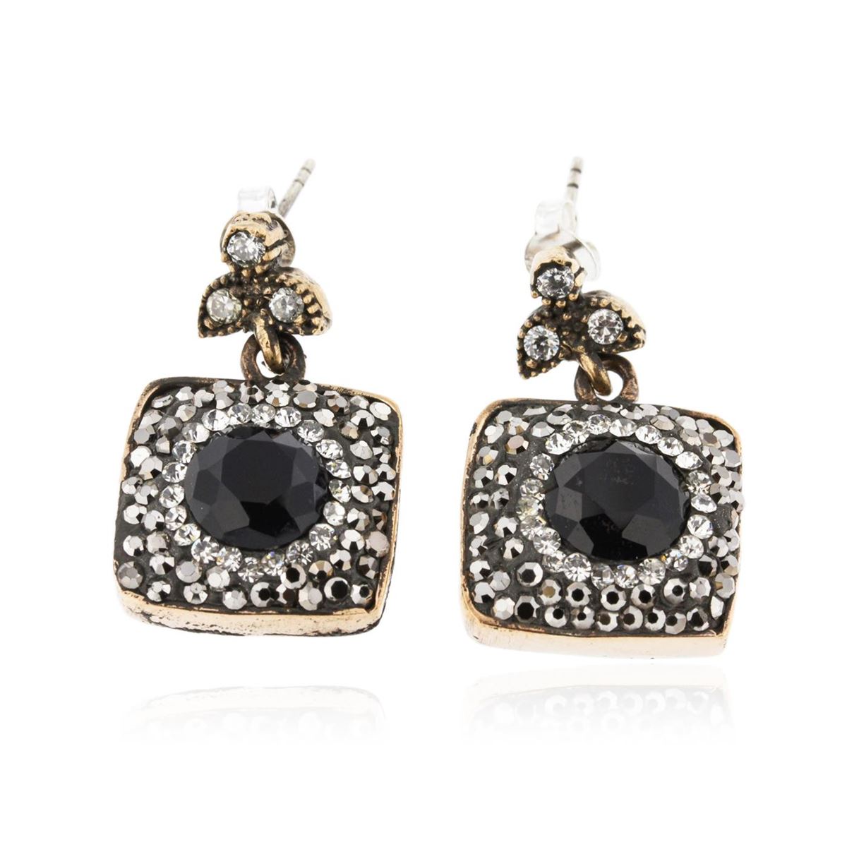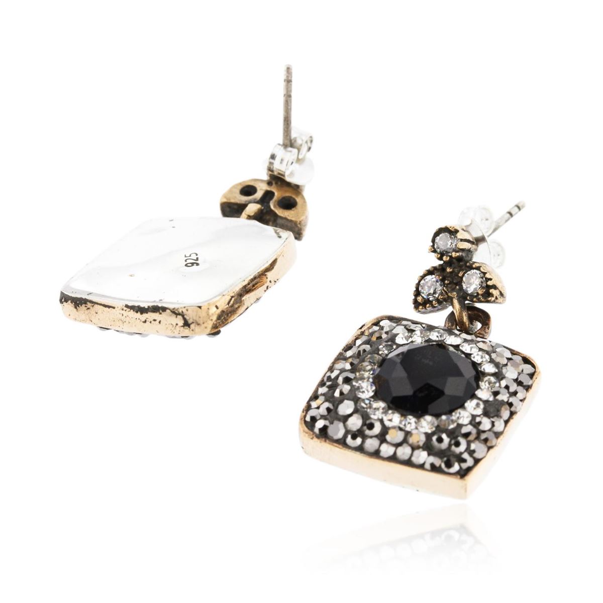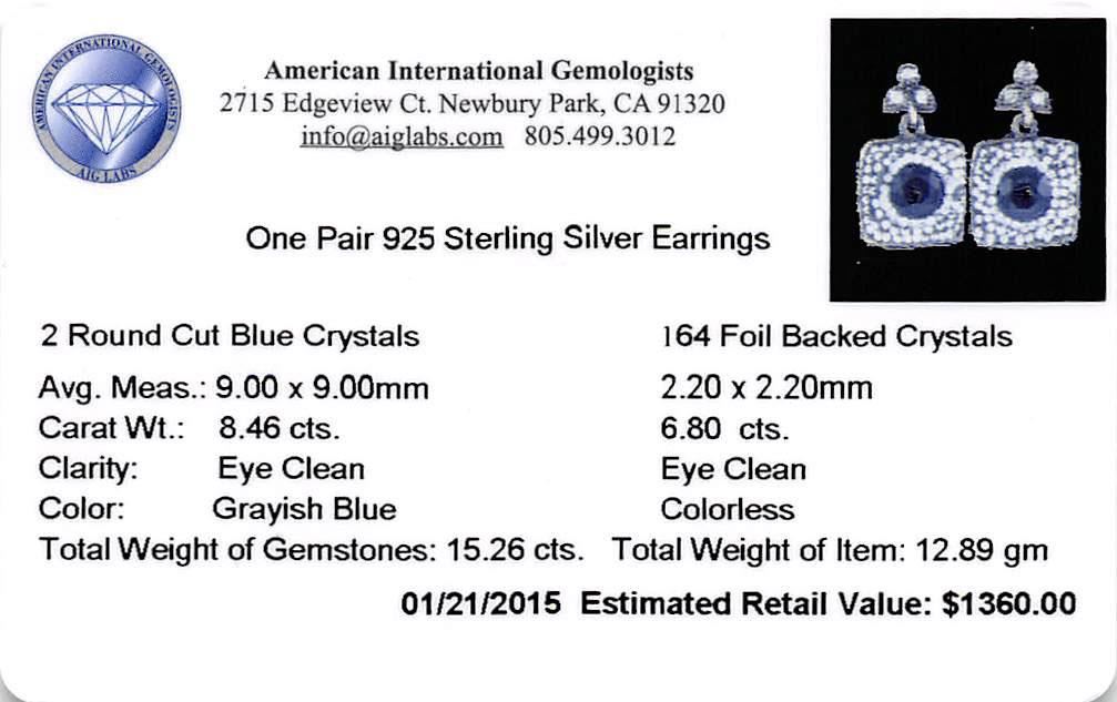 One pair electronically tested 925 silver ladies custom cast & assembled dangle earrings with standard backs. Bright and anodized finish with yellow gold accents. Identified with markings of "925". Condition is new, good workmanship. Containing: Two prong AIG Appraised at $1,360.00.