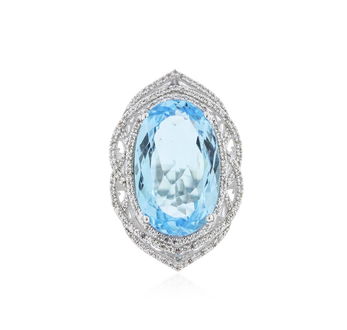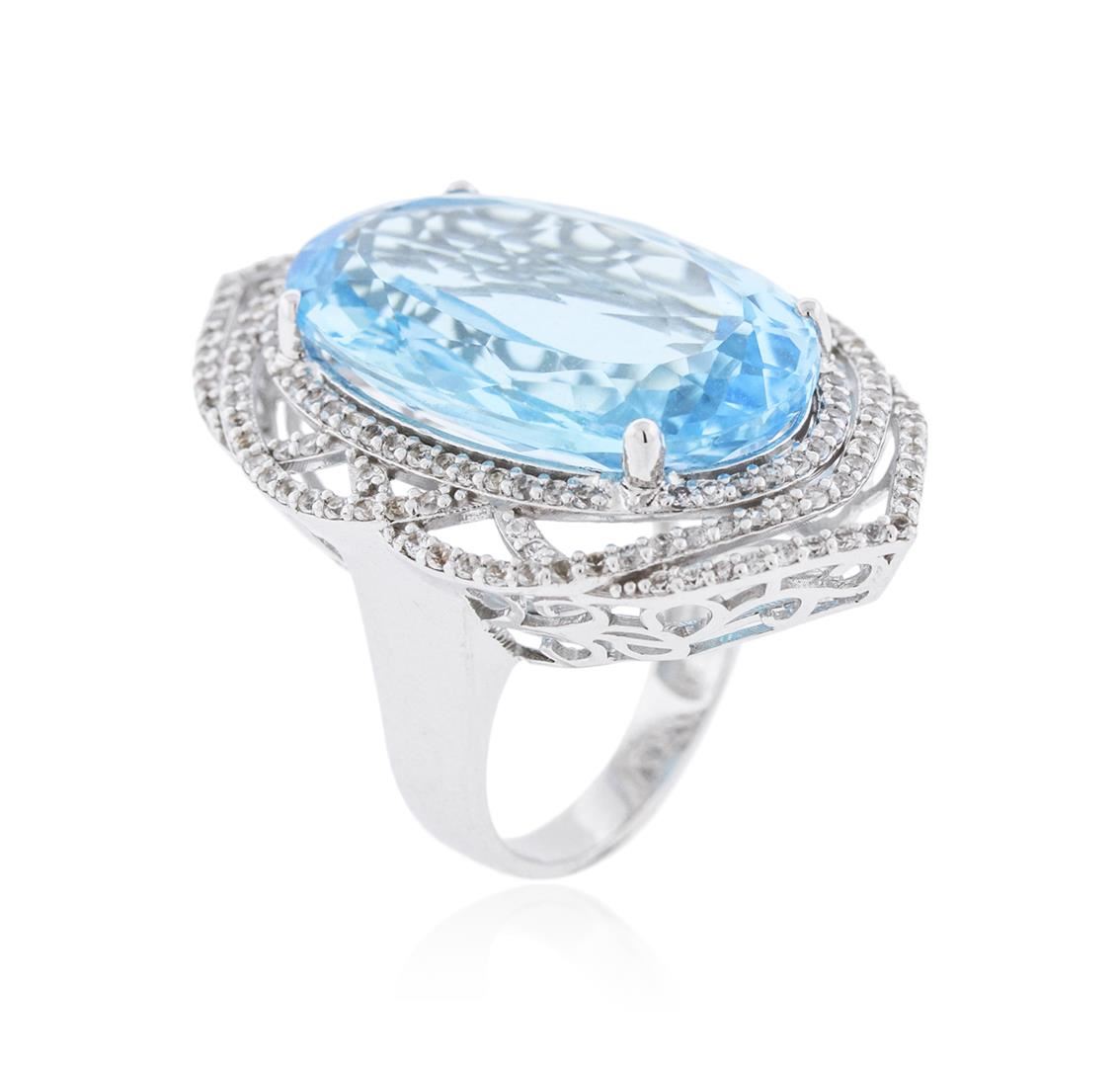 One ring featuring: silver weighing 17.6 grams containing one blue topaz with a total weight of 36.28ct and white sapphires with a total weight of 1.53ct.
