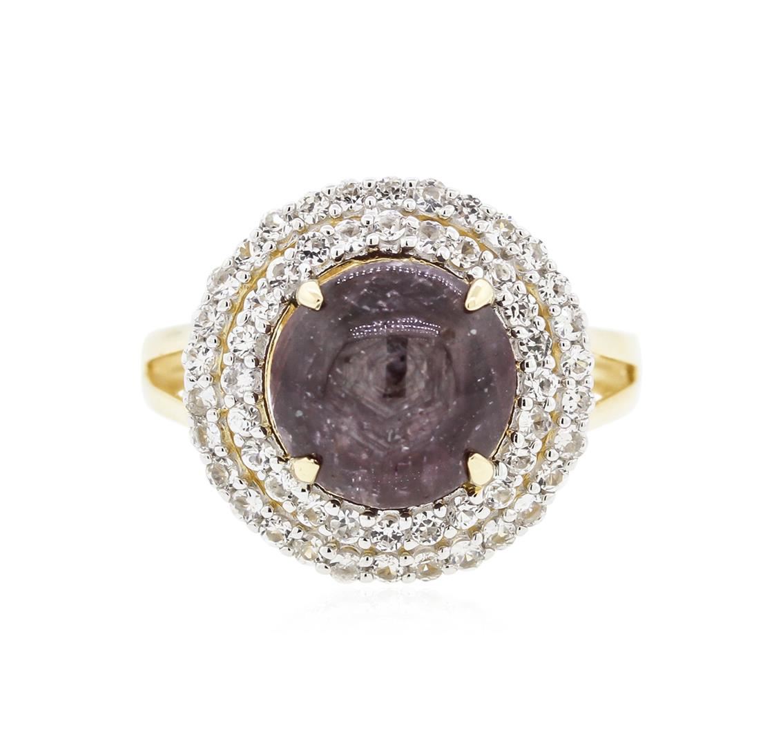 One electronically tested 925 silver ladies cast star ruby and white sapphire ring. Condition is new, good workmanship. The featured star ruby is set within a double white sapphire bezel supported by split shoulders, completed by a two millimeter wide band. Bright polish finish with a yellow gold overlay. Trademark is Orianne. Identified with markings of "925". Containing: One prong set round cabochon cut natural star ruby, measuring 9.50 x 9.50 x 5.00mm, approximate weight of 6.62ct., clarity is severely included, dark, very slightly brownish, strongly purplish red color, (GIA stpR 7/3), cut is good. This stone has a mostly complete six ray star with weak intensity and good movement. Transmitting light very diffusely, opaque. Naturally occurring internal & external characteristics are present. No indications of heating. Graded in the setting. Ruby has a low tolerance to rhodium plating, repolishing the surface, & ultrasonic cleaning. Fifty-four prong set round mixed cut natural white sapphires, measuring 1.50 - 1.40 x 0.94 mm, approximate total weight of 0.90ct., clarity is eye clean, colorless, very slightly grayish, white color, (GIA W 0/3), cut is good. Transmitting light with no distortion, transparent. Measurements & the color grade are an average for the group. Graded in the setting. Total Weight of Colored Stones: 7.52 ct. Total Weight of Ring: 5.40 gm. AIG Appraised at $1,060.00.