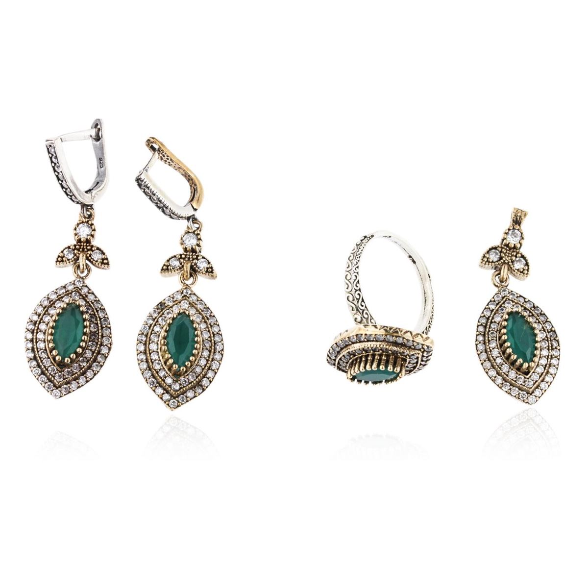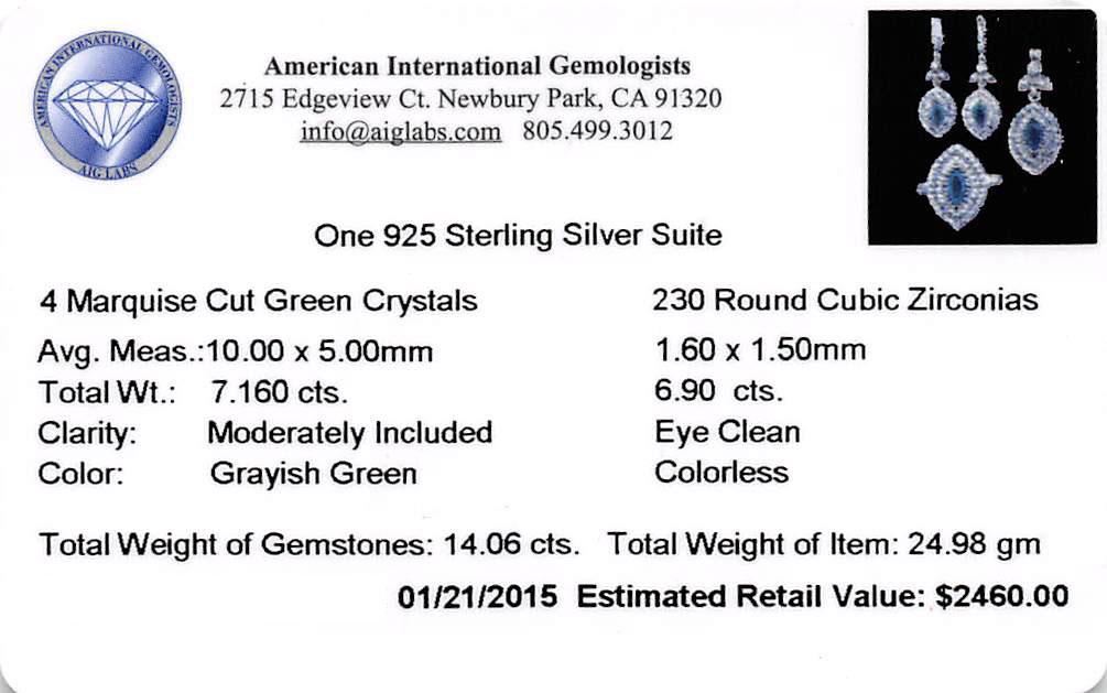 One electronically tested 925 silver ladies custom cast & assembled suite. The suite contains a ring, a pendant and a pair of earrings. The ring features a lab created green crystal set within tiered cubic zirconia bezels supported by patterned shoulders, AIG Appraised at $2,460.00.