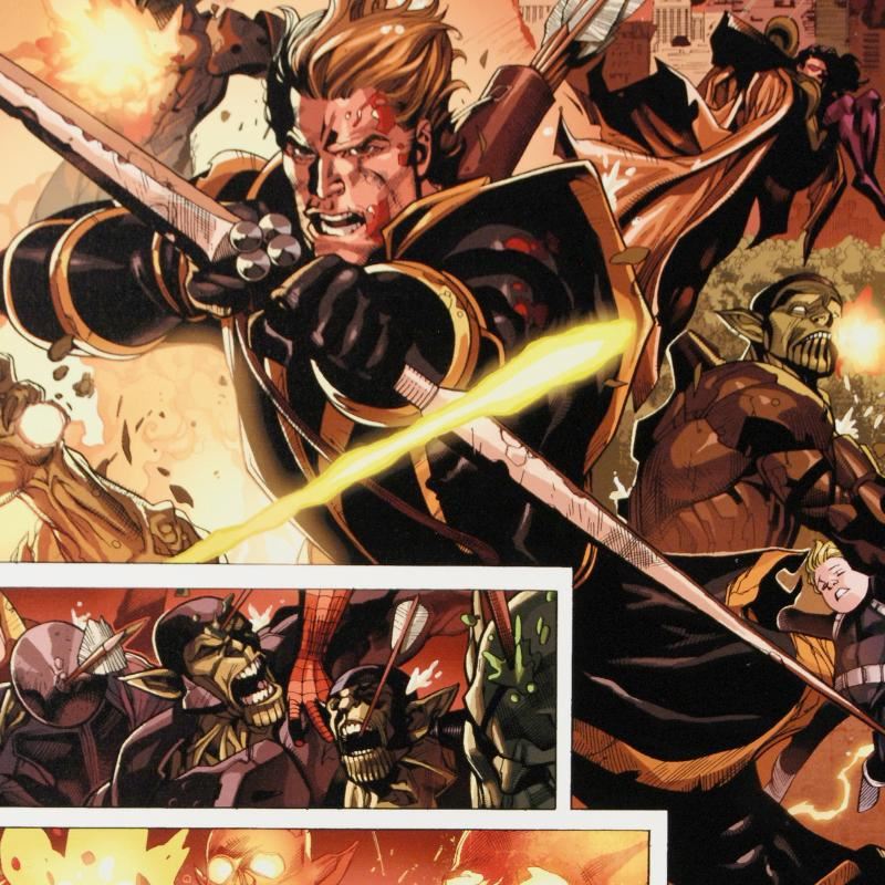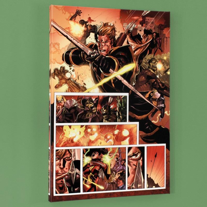 A piece of comic book history, this limited edition print, drawn by Leinil Francis Yu, depicts characters from the marvel universe. After winning the Wizard's Drawing Board Contest, Marvel Comics hired Leinil Francis Yu to work on the Wolverine series. After his run on Wolverine, he moved on to work on Marvel's core X-Men title in 2000. Yu continued to work on other Marvel titles such as Fantastic Four, Ultimate Wolverine vs. Hulk and New Avengers. "Secret Invasion #7" is a limited edition numbered giclee on stretched canvas by Leinil Francis Yu presented by Marvel Comics. This piece comes gallery wrapped and ready to hang. Measure approx. 18" x 27" (image); 1.5" (depth).