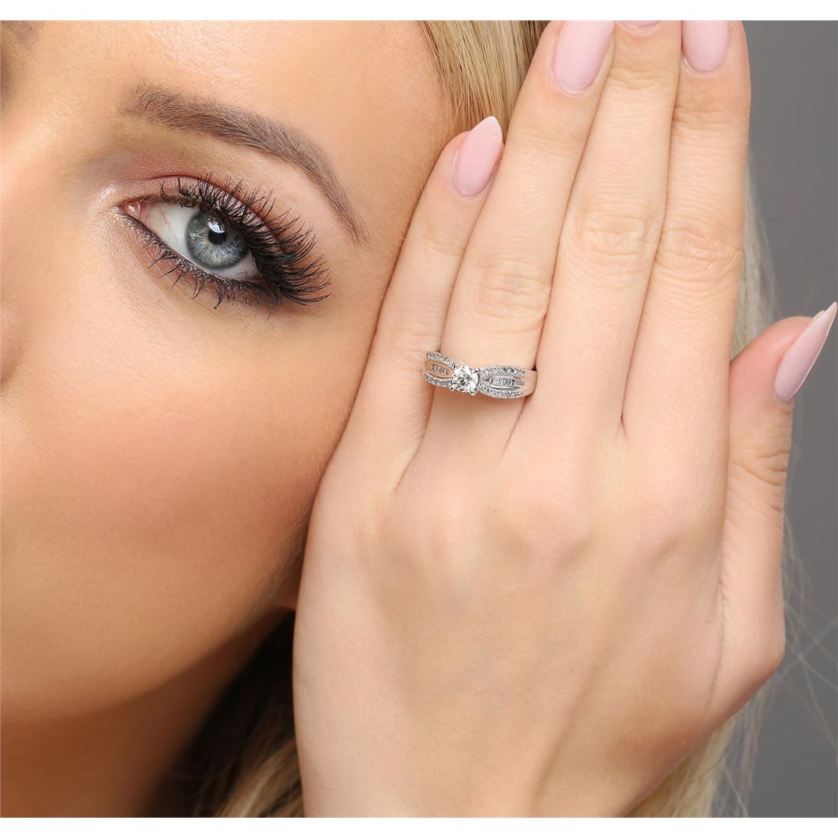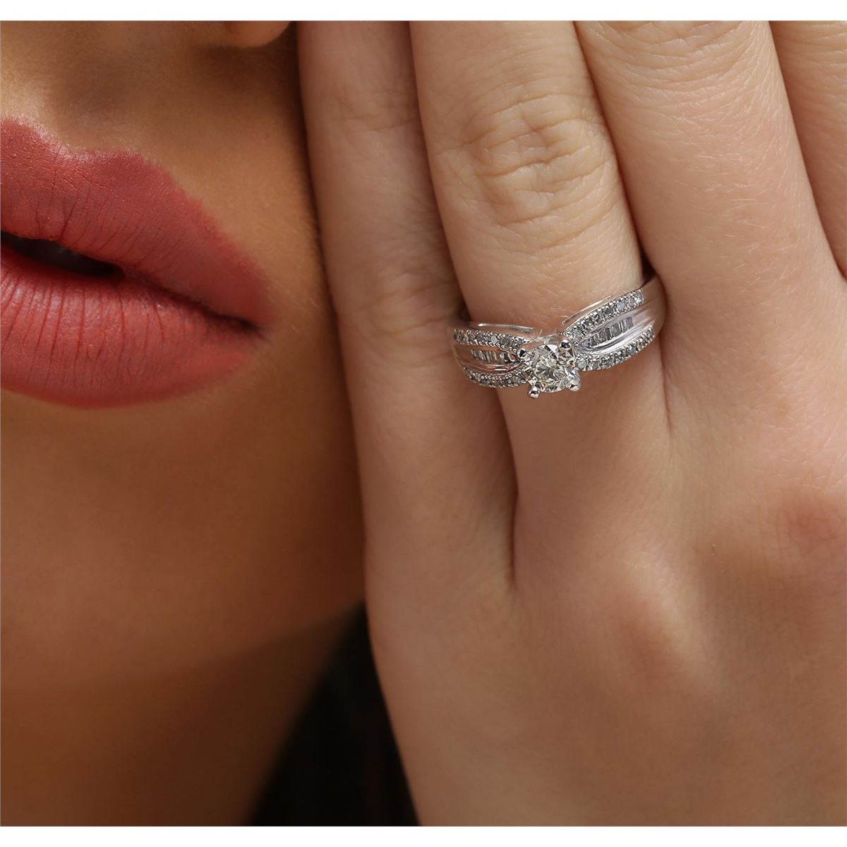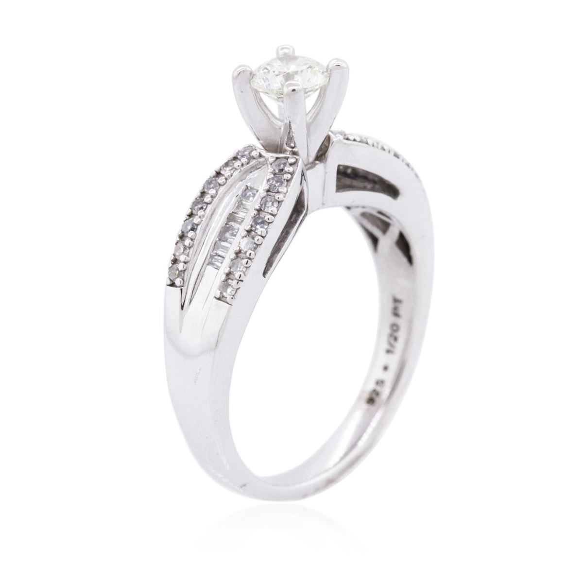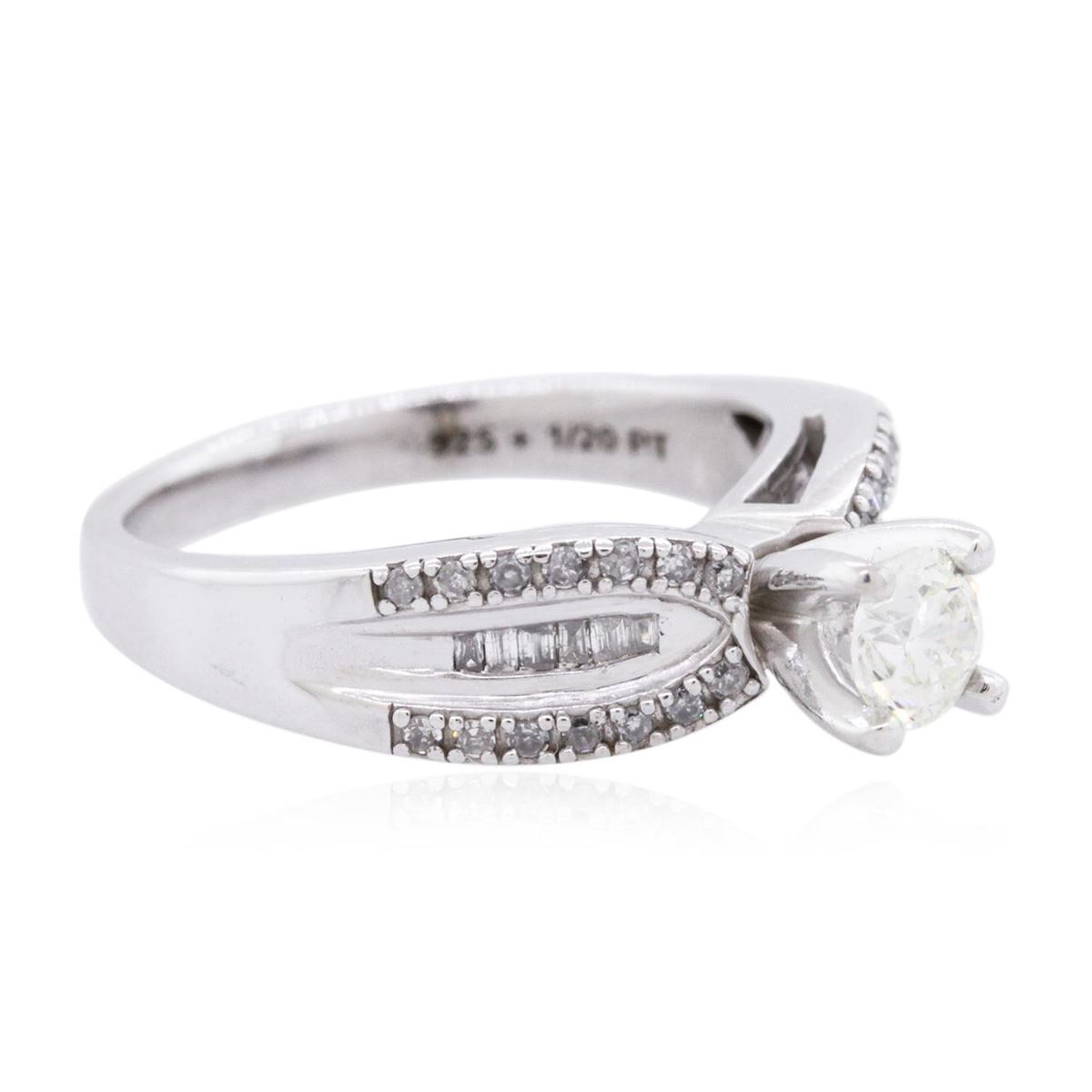 One ring featuring: Silver weighing 4.20 grams containing one prong set round cut diamond center stone with a total weight of 0.45ct and diamond side stones with a total weight of 0.30cts.